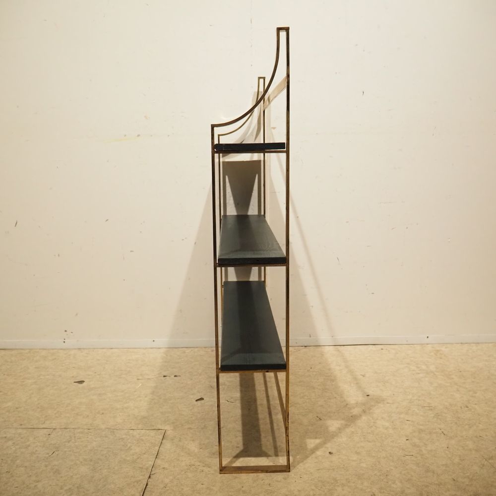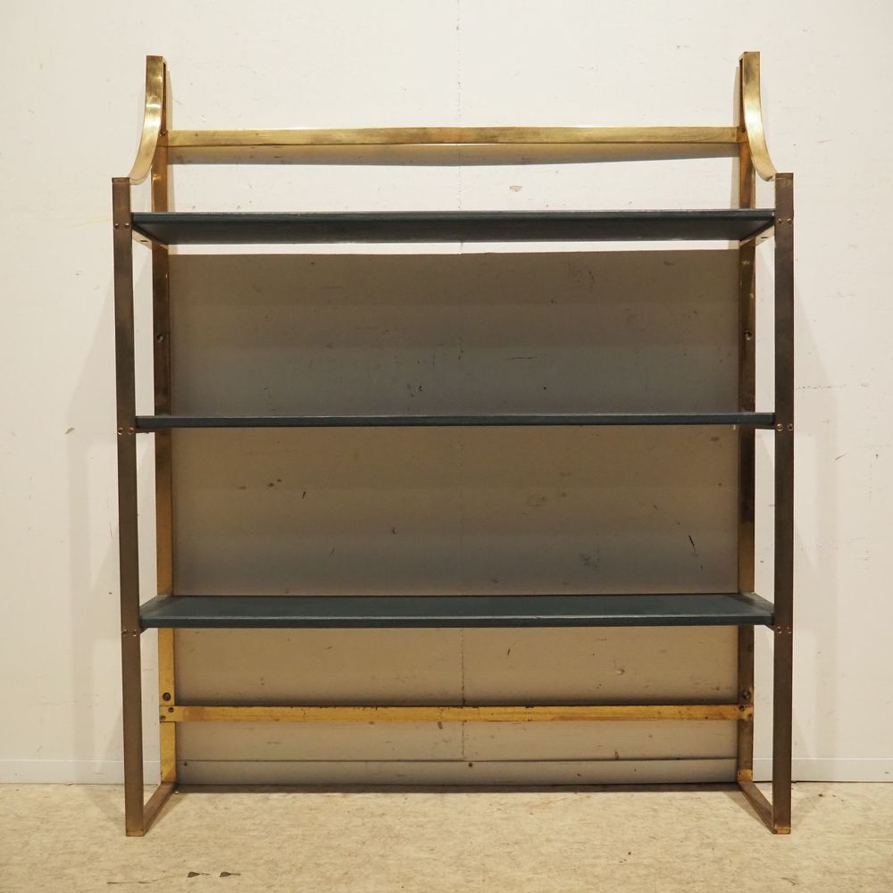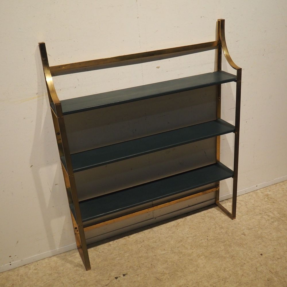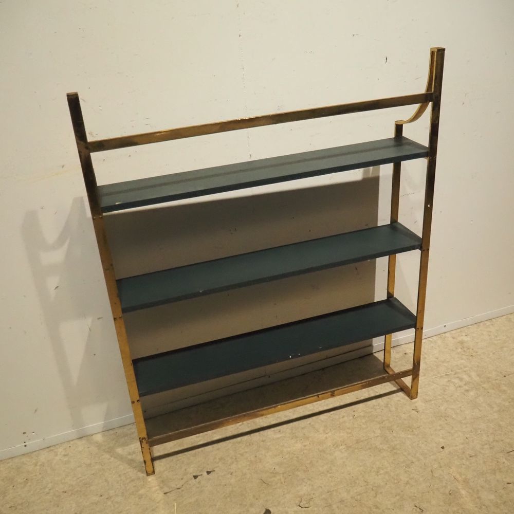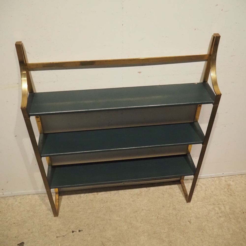 Etagère murale vers 1940 : Montant en laiton doré, 3 étagères non d’origine en bois cérusé vert, H: 91, L: 75, P: 15 cm