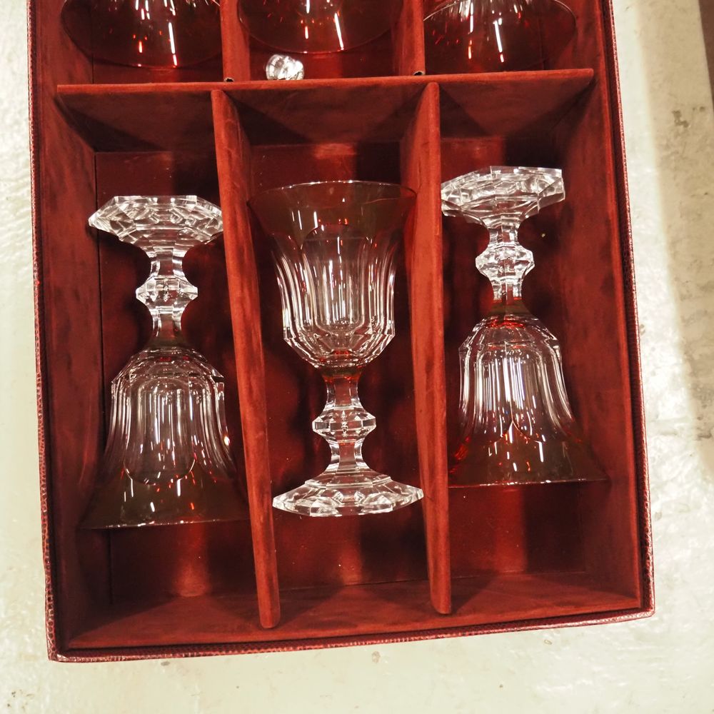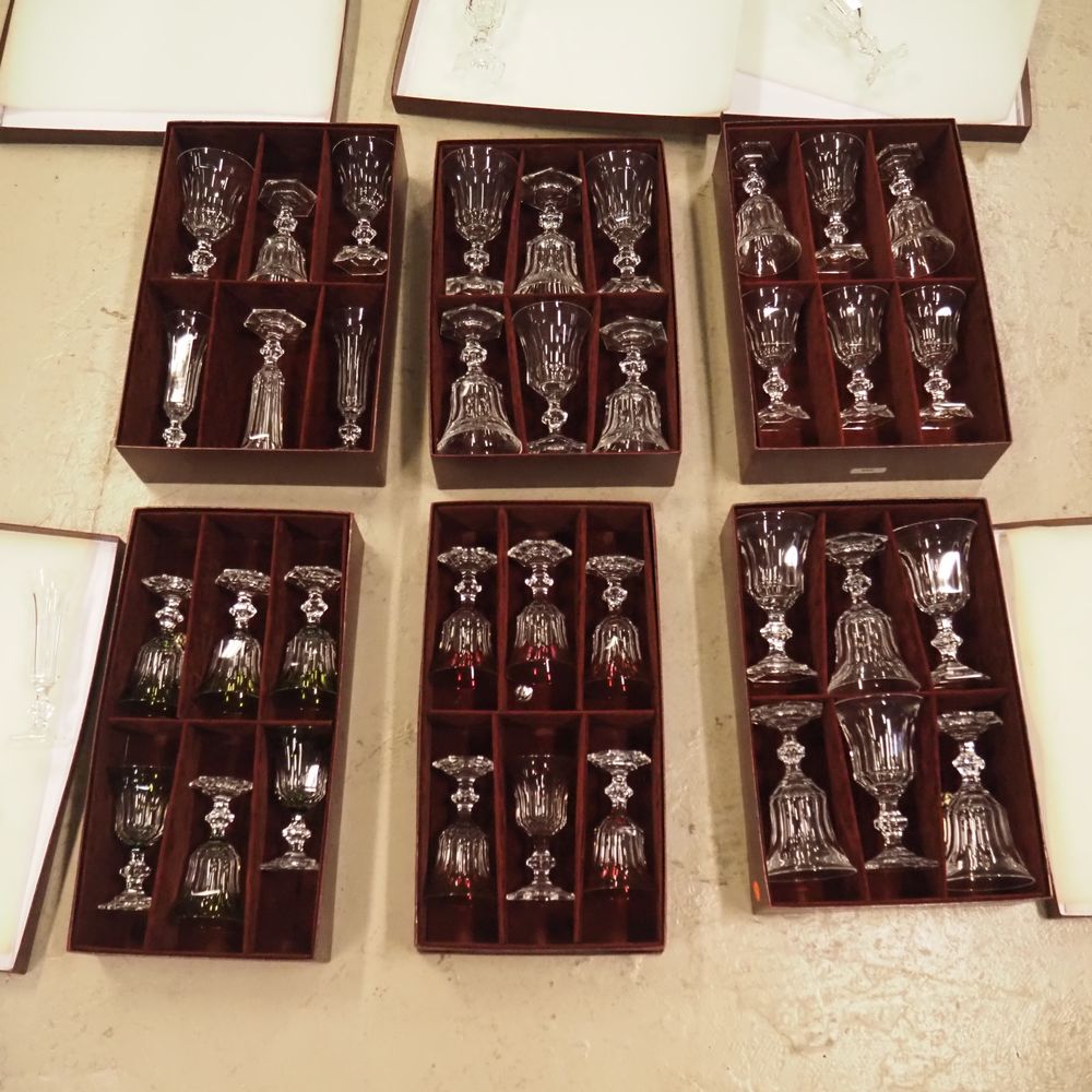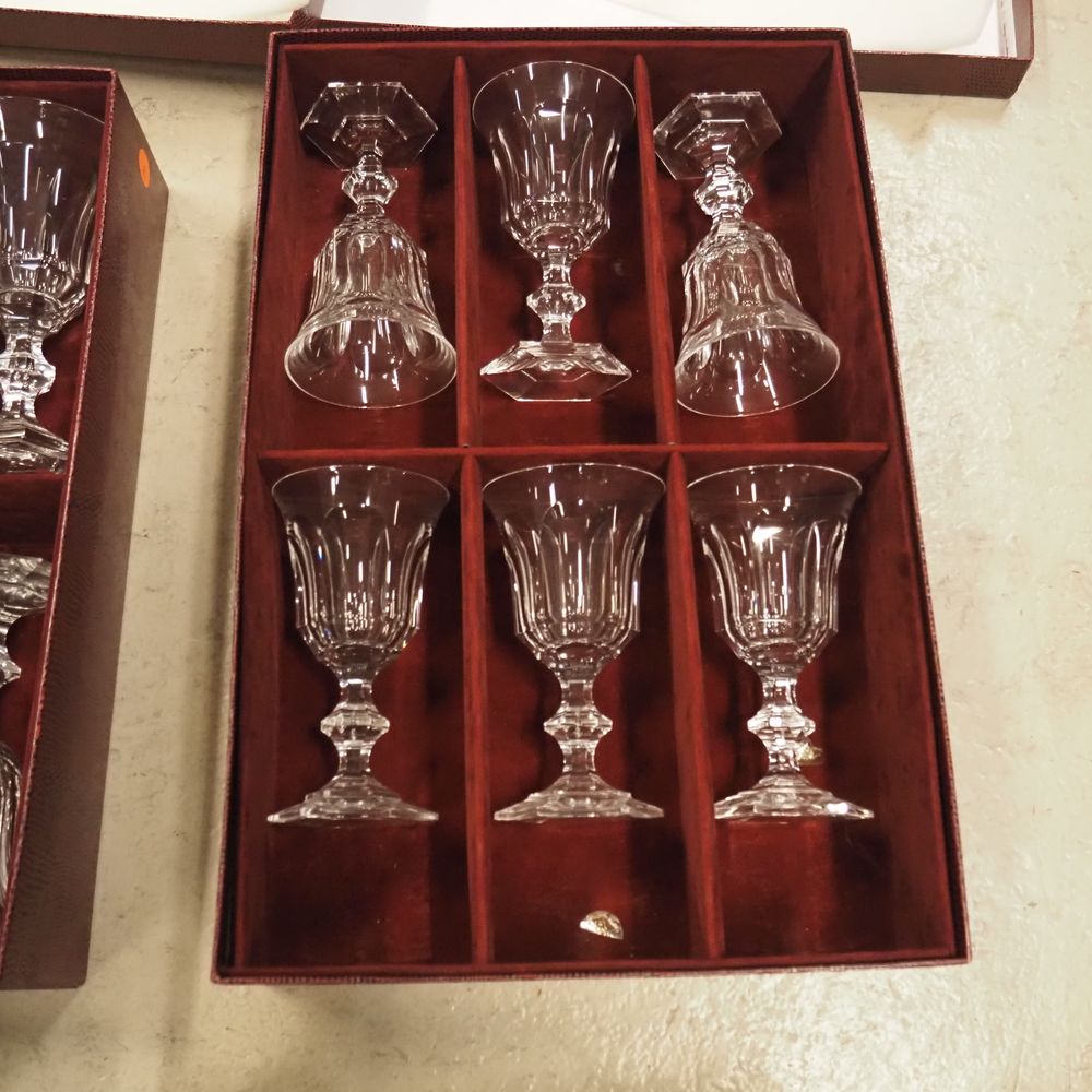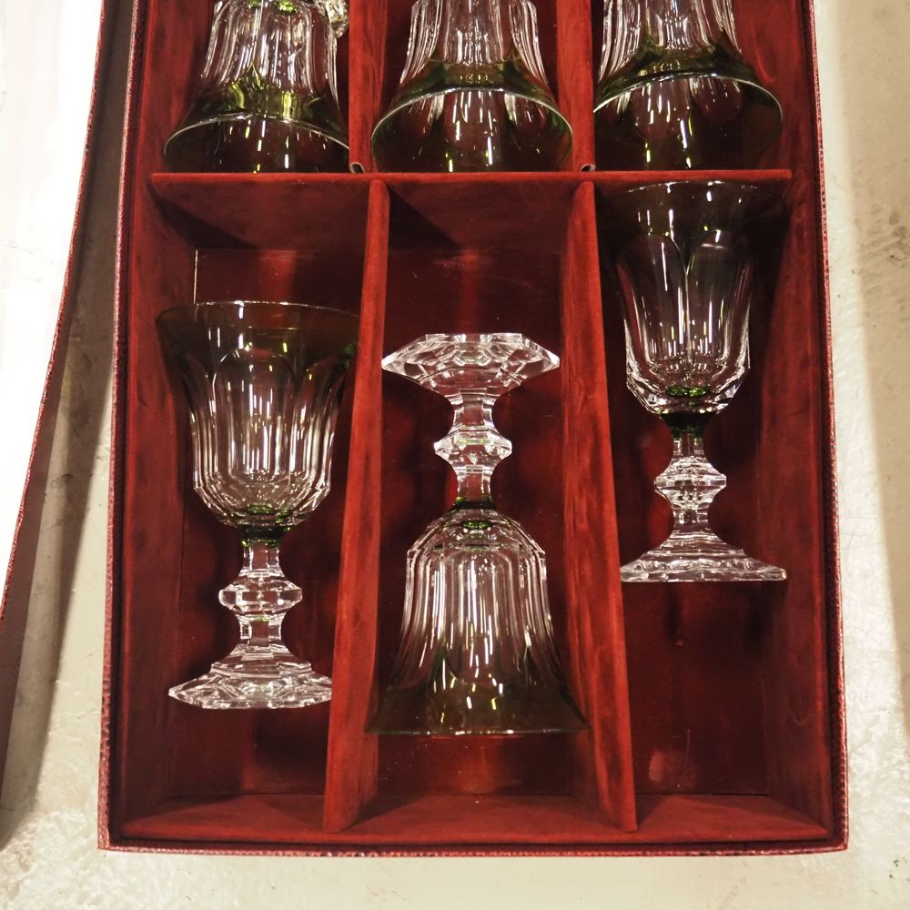 Val Saint-Lambert : Suite de 38 verres à pied Art déco modèle Metternich dont 6 doublé de couleur rouge et 6 doublé vert (vin blanc, vin rouge et flute), cristal clair taillé, pied à section hexagonale,