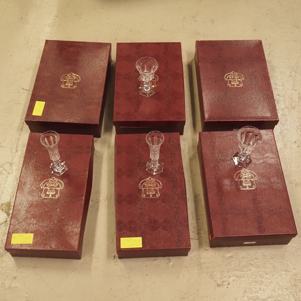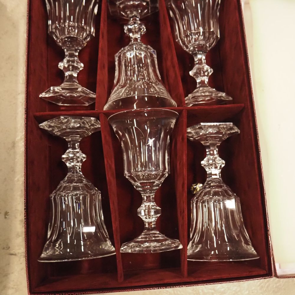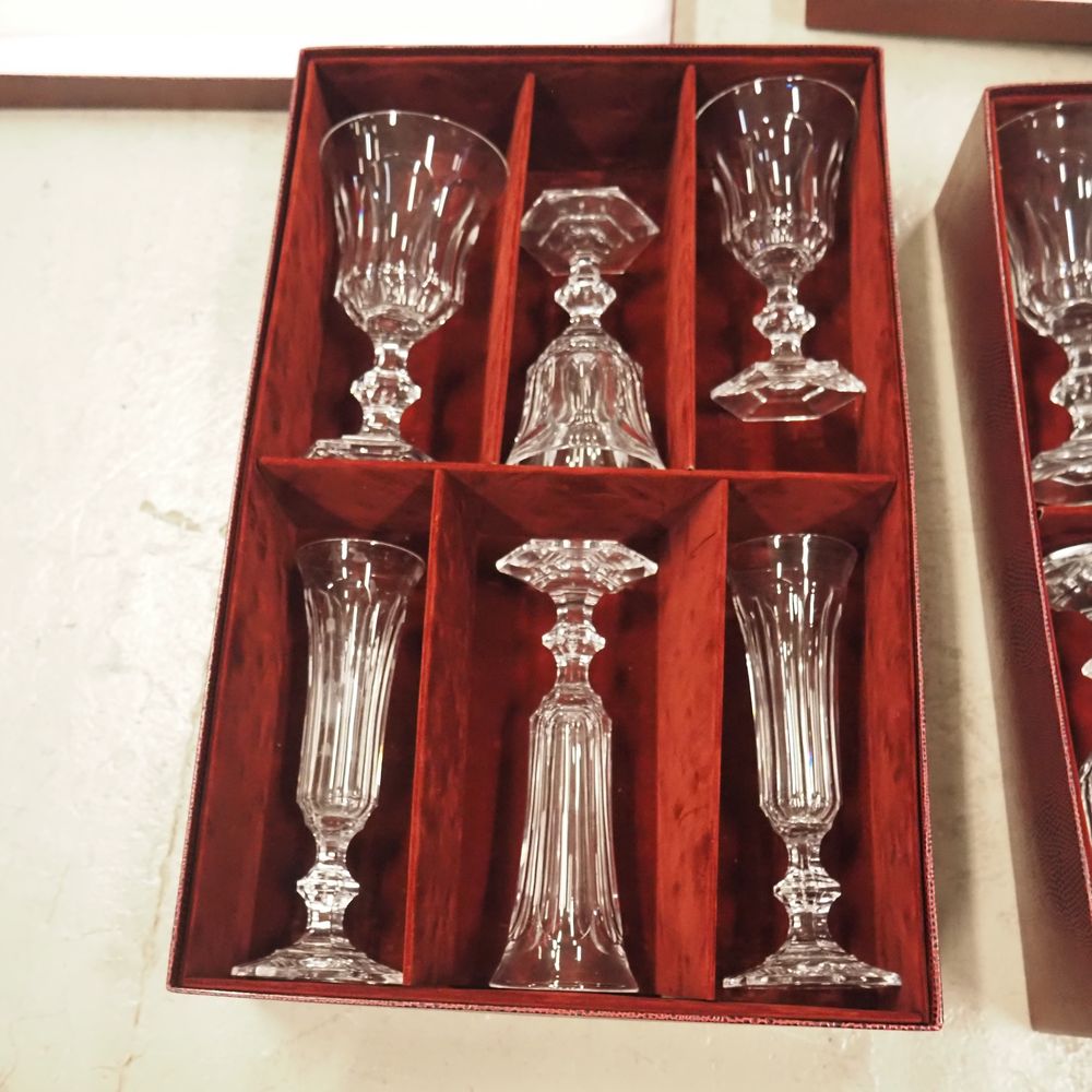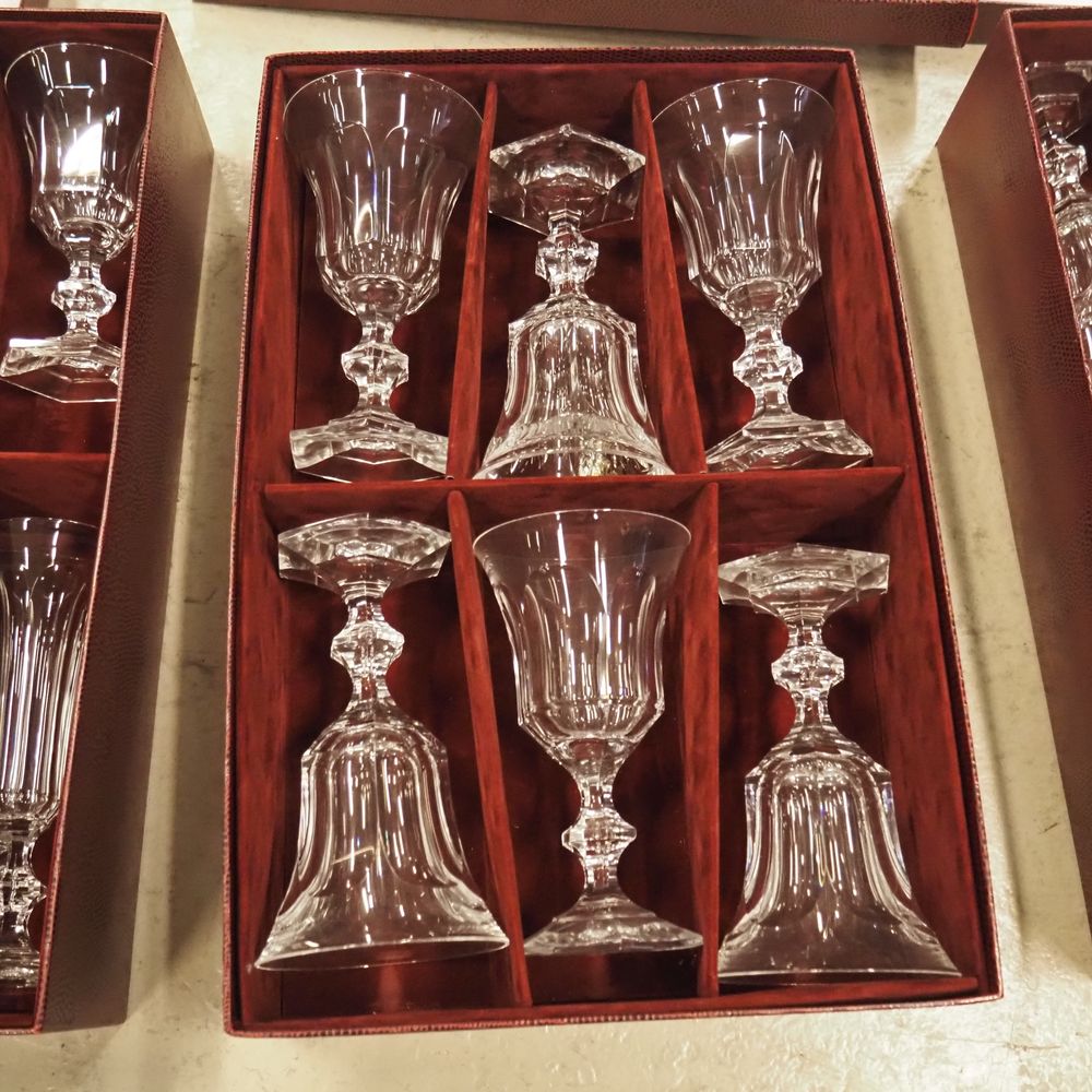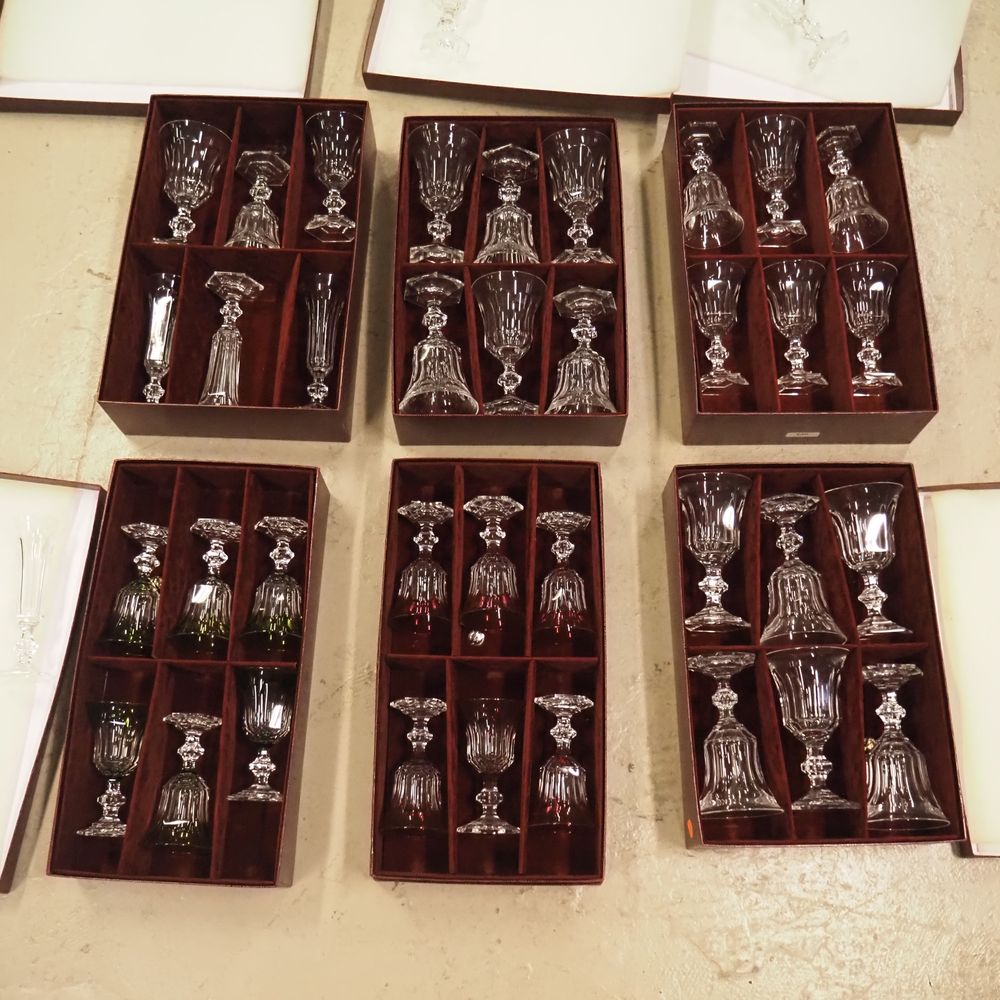 Val Saint-Lambert : Suite de 38 verres à pied Art déco modèle Metternich dont 6 doublé de couleur rouge et 6 doublé vert (vin blanc, vin rouge et flute), cristal clair taillé, pied à section hexagonale,