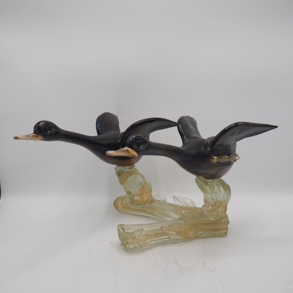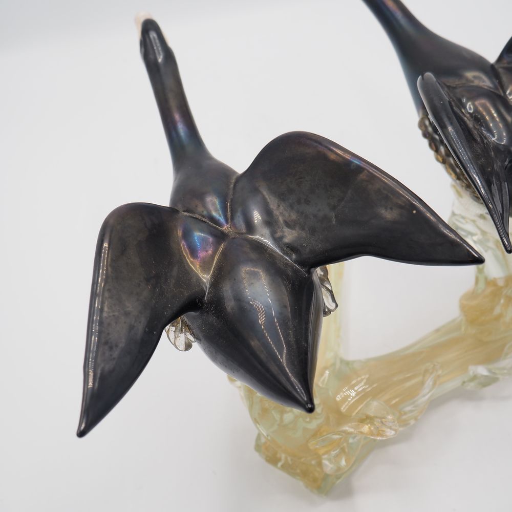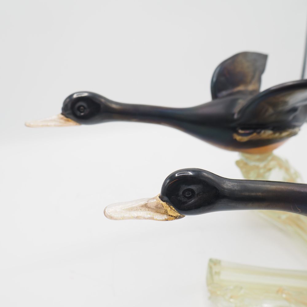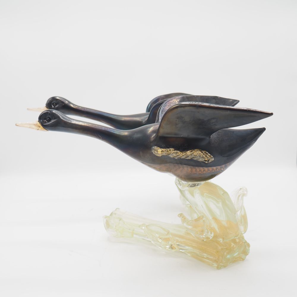 Ercole Barovier Ermanno Toso : Objet d’art vers 1950, figurant un couple d’oies sauvages en vol, verre soufflé bouche irisé noir et travaillé à l’outil, inclus de poudre d’or, H: 21, L: 33, P: 33 cm