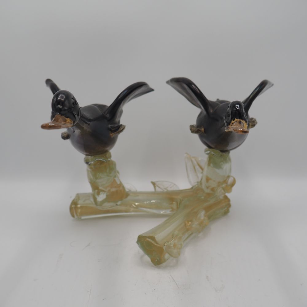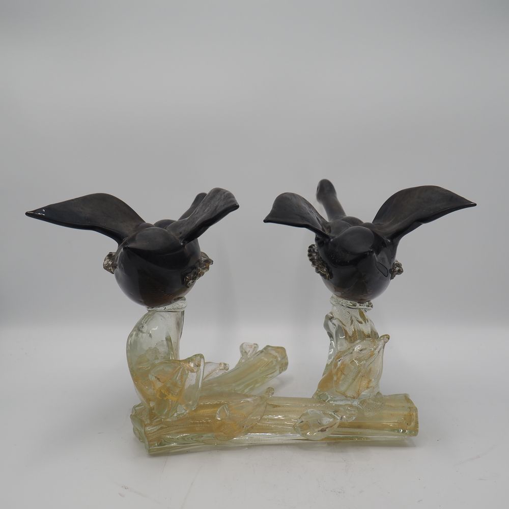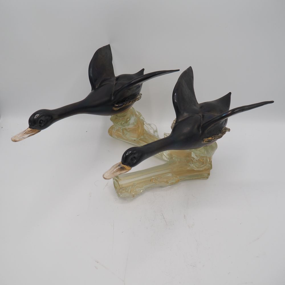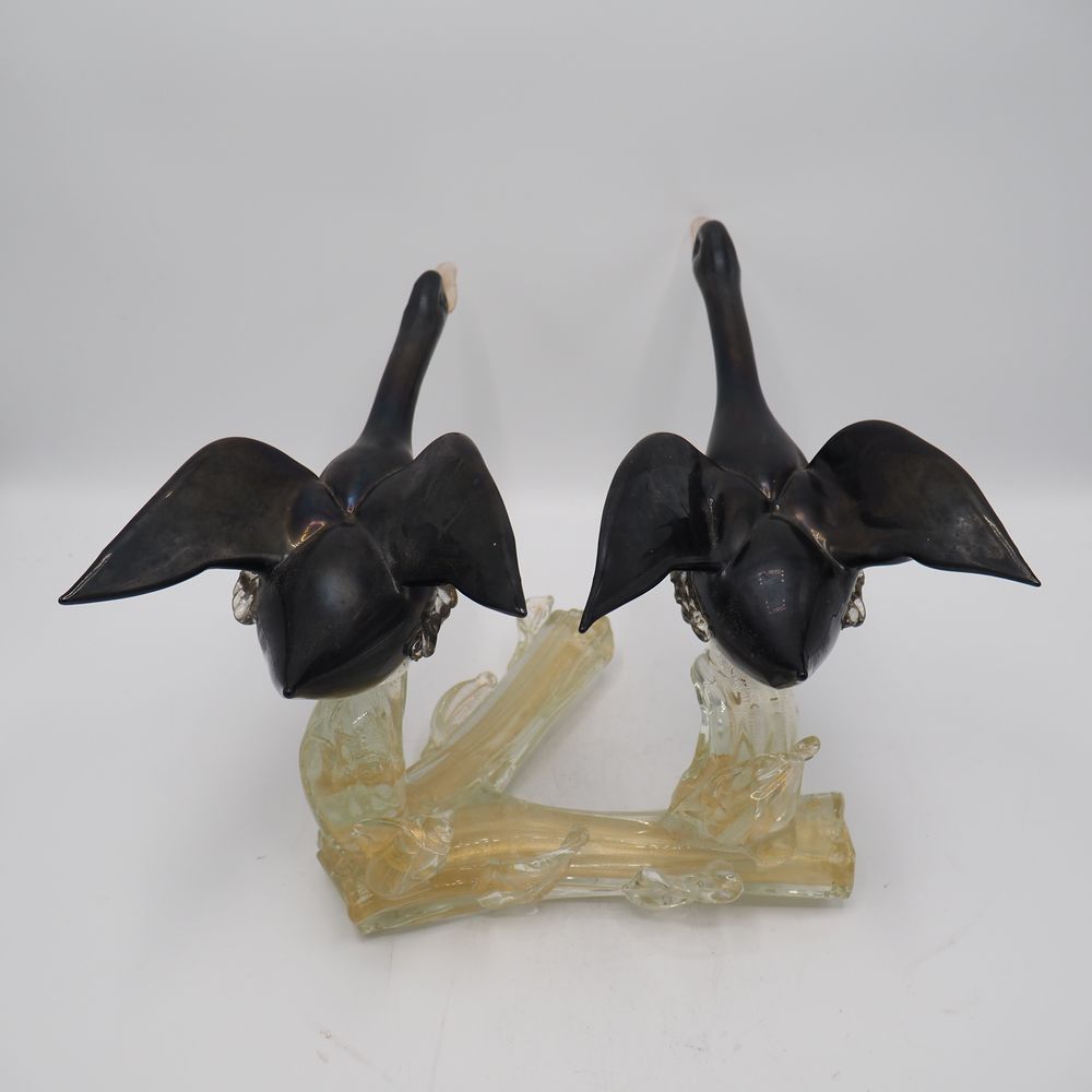 Ercole Barovier Ermanno Toso : Objet d’art vers 1950, figurant un couple d’oies sauvages en vol, verre soufflé bouche irisé noir et travaillé à l’outil, inclus de poudre d’or, H: 21, L: 33, P: 33 cm