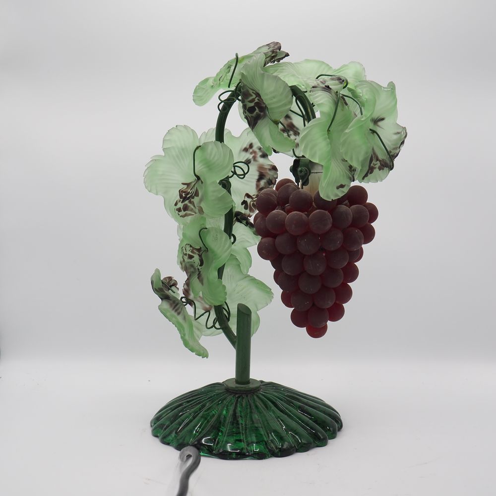 Murano : Lampe d’ambiance vers 1920, monture en fils de métal laqué vert et feuilles de verre soufflé, formant une grappe de raisin rouge, parfait état, H: 41 cm