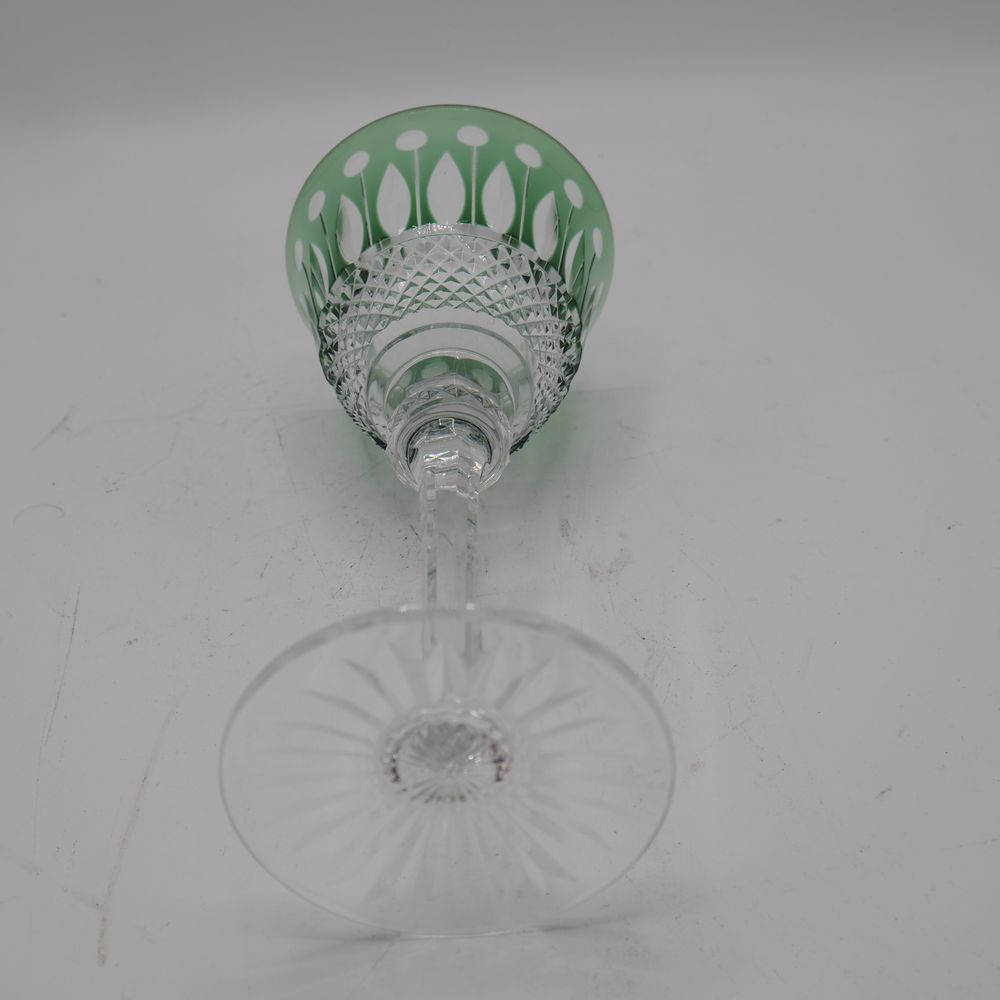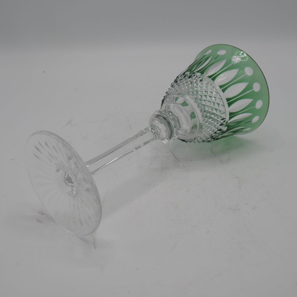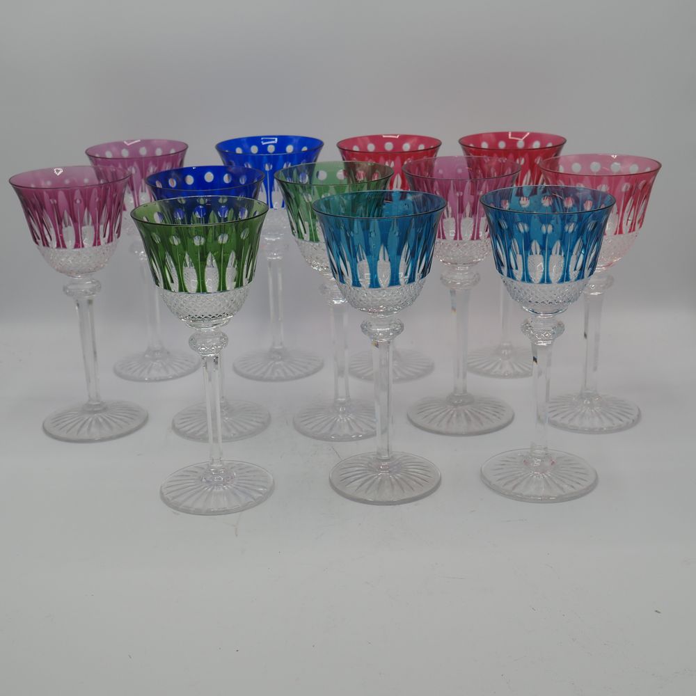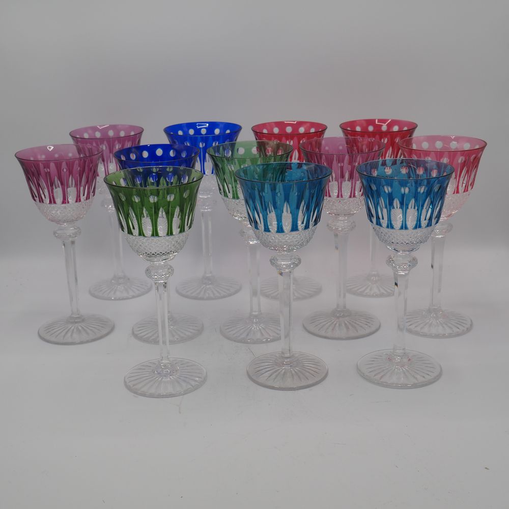 Saint-Louis : Lot de 12 verres à pied, cristal clair doublé et taillé de couleur différentes, décor de pastilles, navettes et diamants, coque de forme tulipe, jambe à section hexagonale avec nœud, pied disque, H: 19,8, diam: 8,9 cm