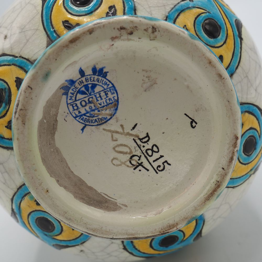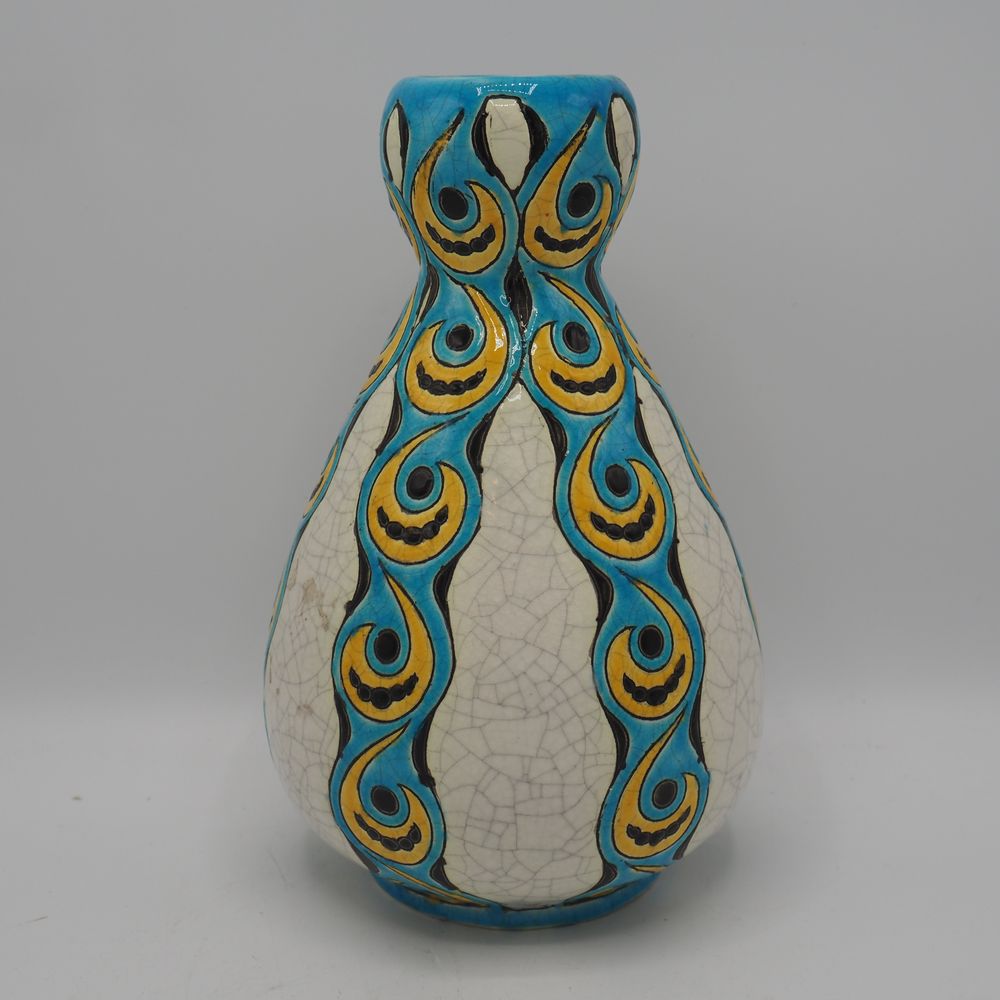 Charles Catteau 1880-1966 / Boch La Louvière : Vase Art-Déco de forme gourde, céramique émaillée craquellée, forme 807, décor 815, cachet sous la base, monogrammé CT, H: 24, diam: 16 cm