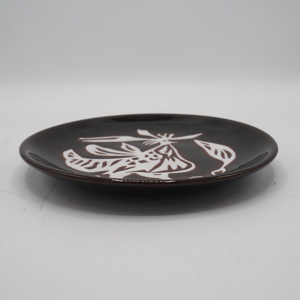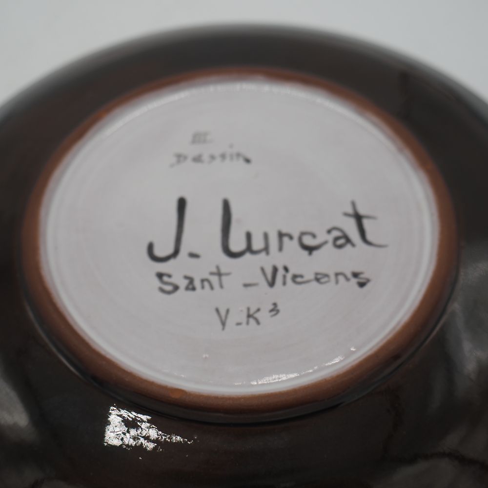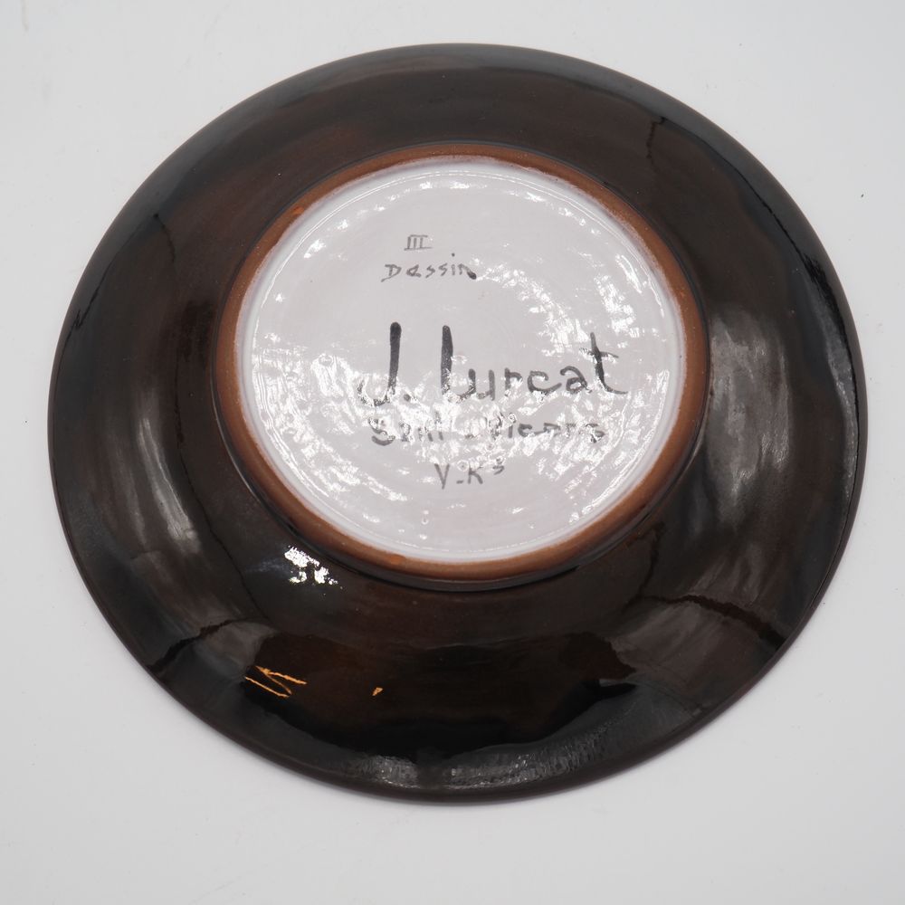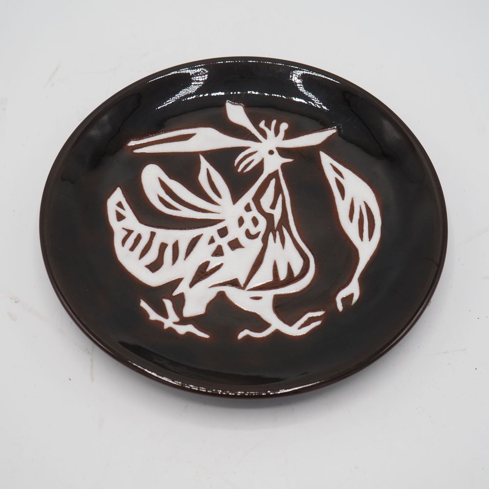 Jean Lurçat (1892-1966) / Sant-Vicens : Assiette vers 1950, céramqiue émaillée, décor au coq sur fond brun signée au dos, diam: 21,2 cm