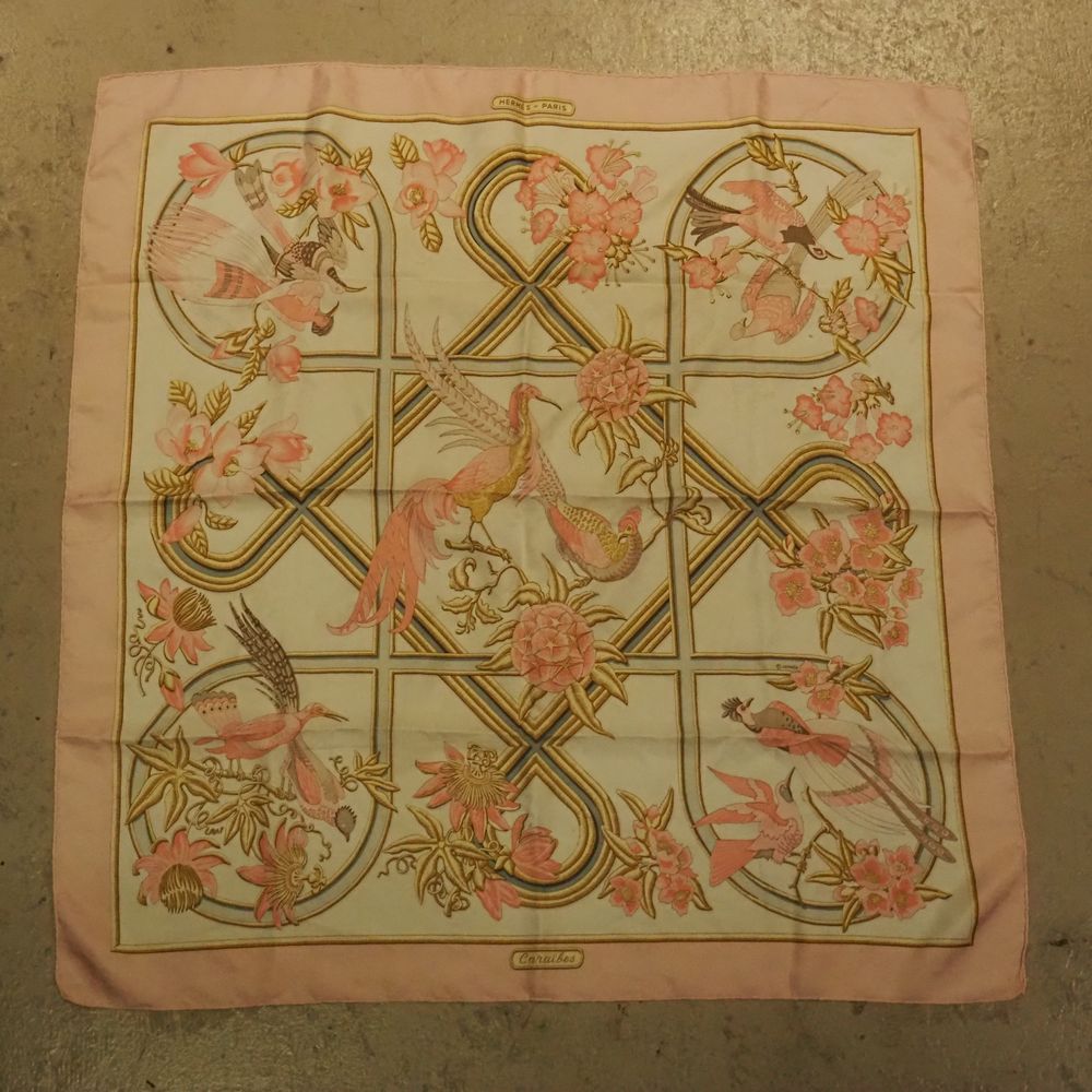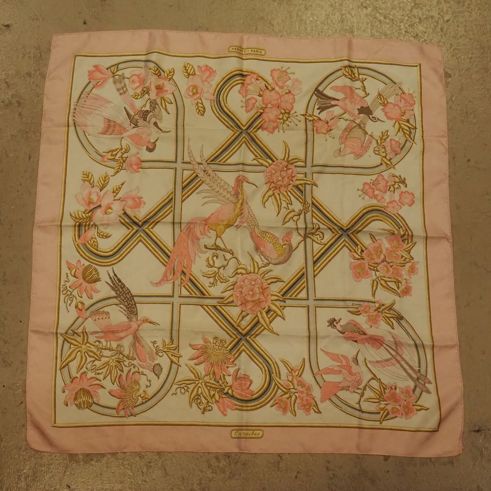 Hermès Paris : Carré modèle Caraîbes, décor floral avec oiseaux, rose et or, 85 x 85 cm