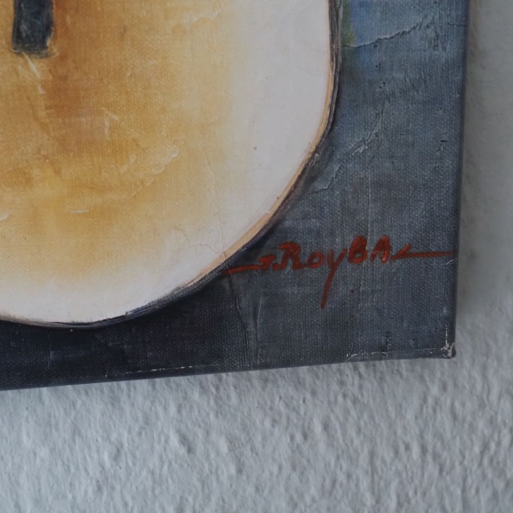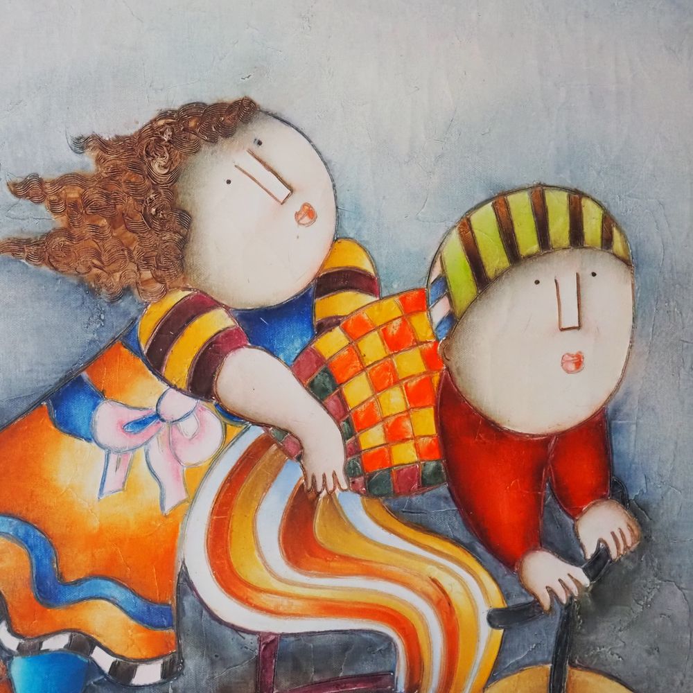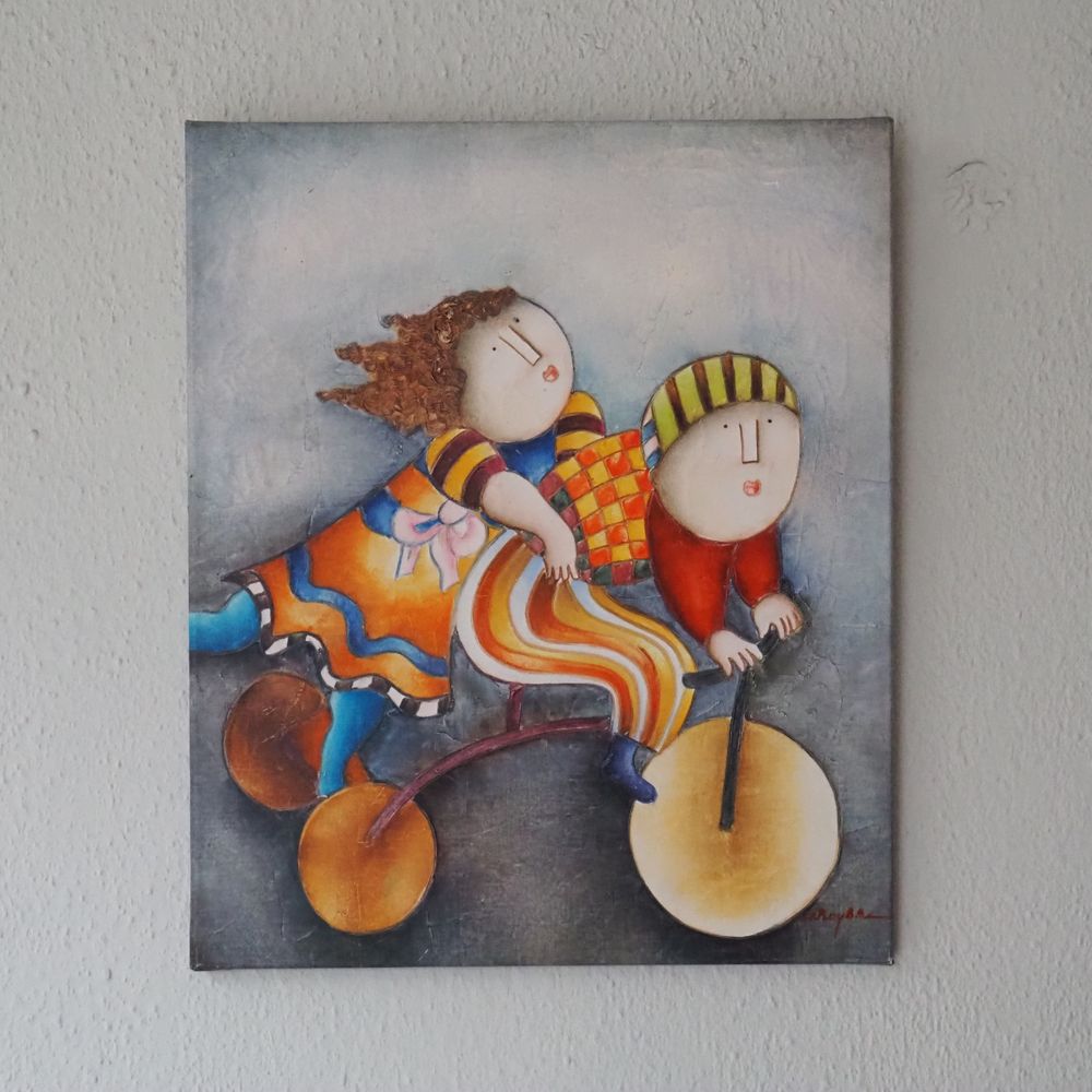 Joyce Roybal (1955) : Huile sur toile, naif, promenade en tricyle, signée en bas à droite, dim: 60 x 50 cm