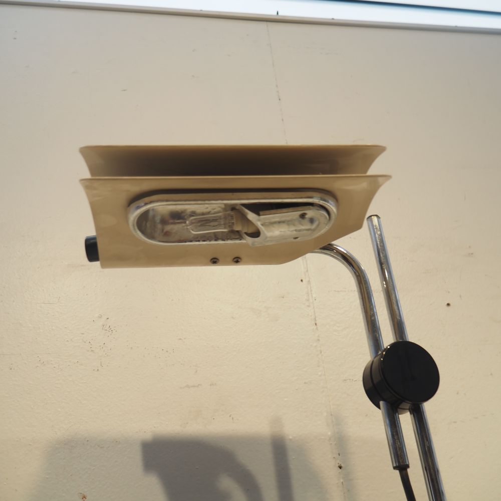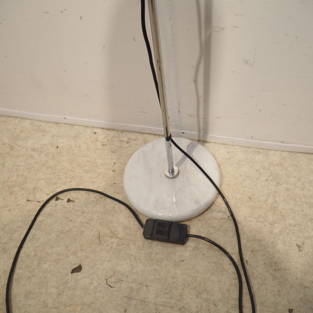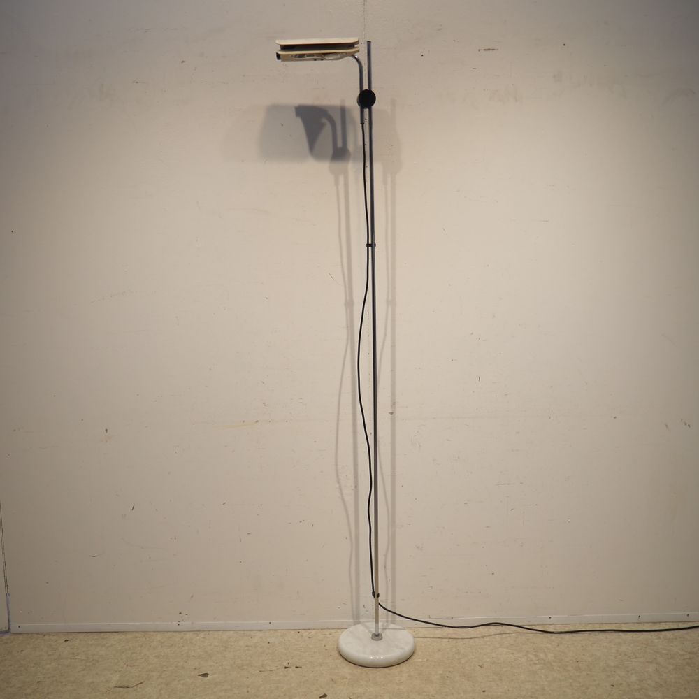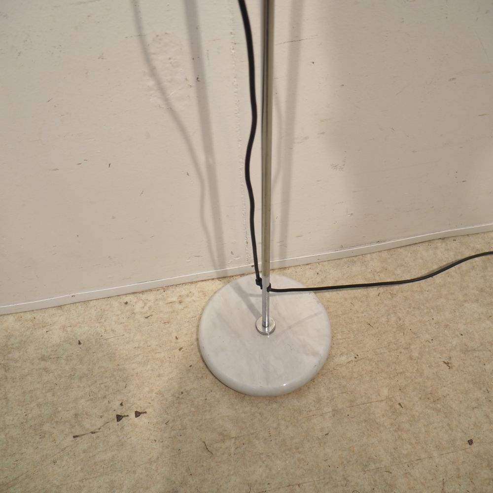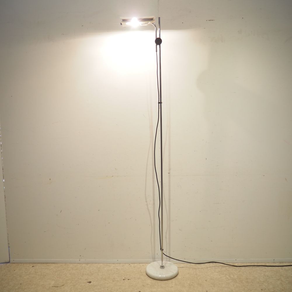 Bruno Gecchelin (1939) / Skipper : Lampadaire halogène vers 1970, modèle Tegola TT4, déflecteur orientable et téléscopique en métal laqué blanc, fut tutulaire en acier chromé, piétement disque en marbre blanc, H: 190 cm