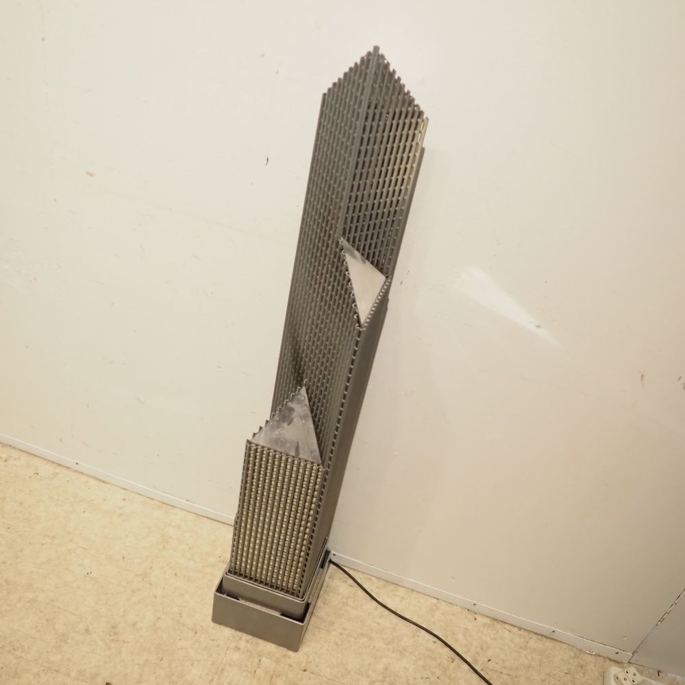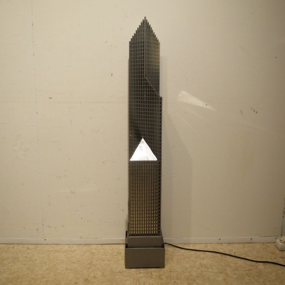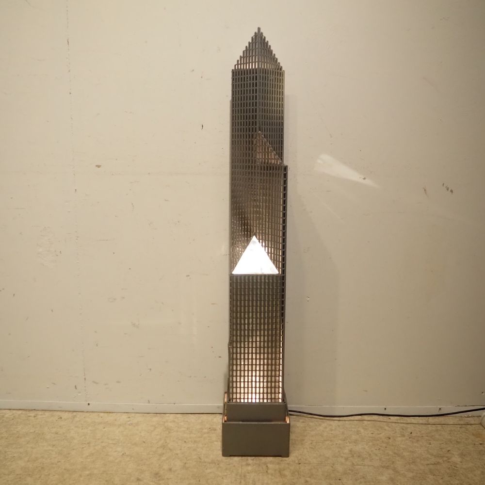 Lampe de sol d’inspiration gratte ciel année 1980 : Métal laqué gris ajouré à section carrée, H: 112 cm