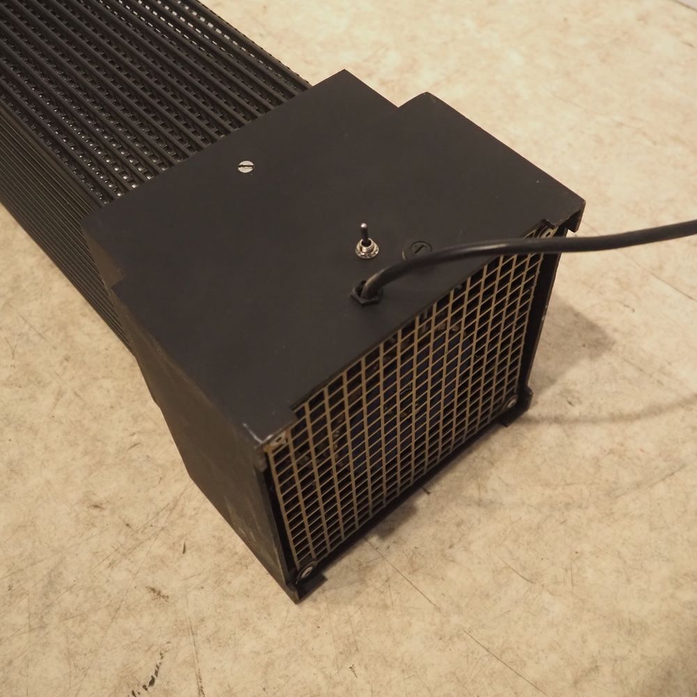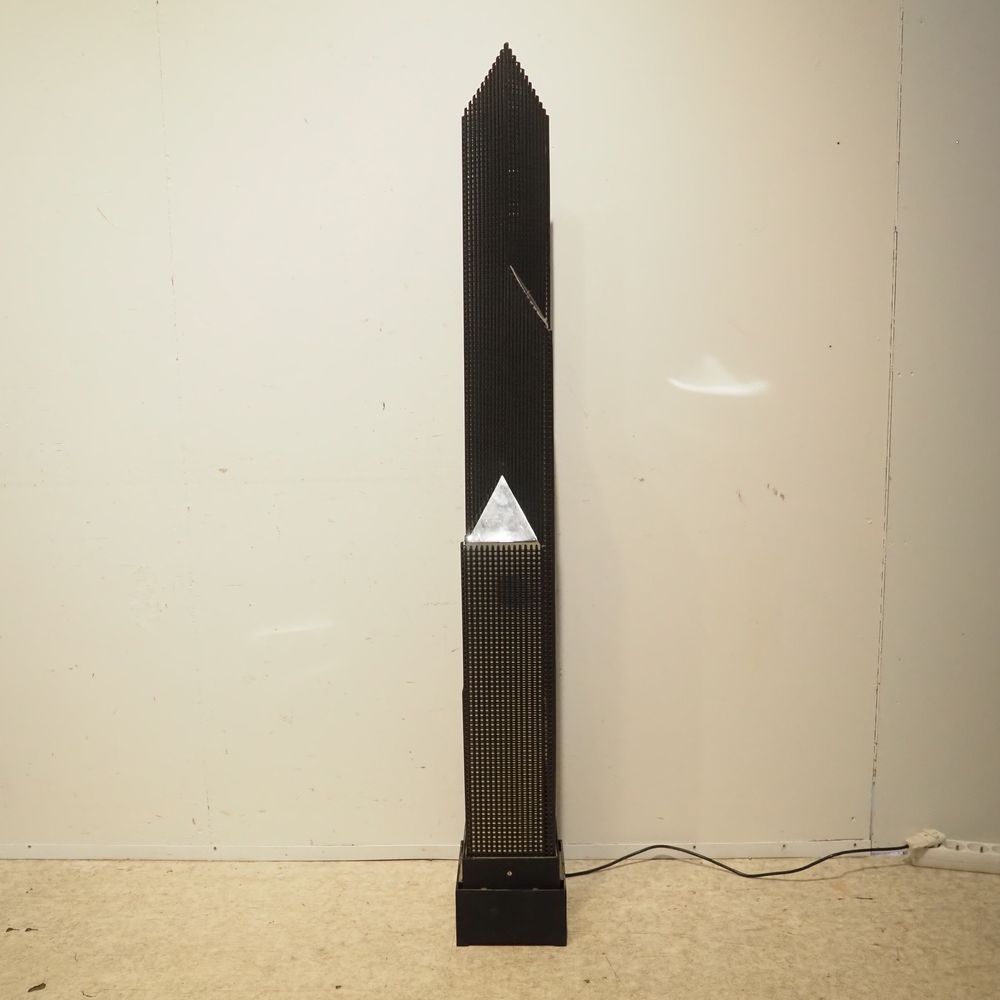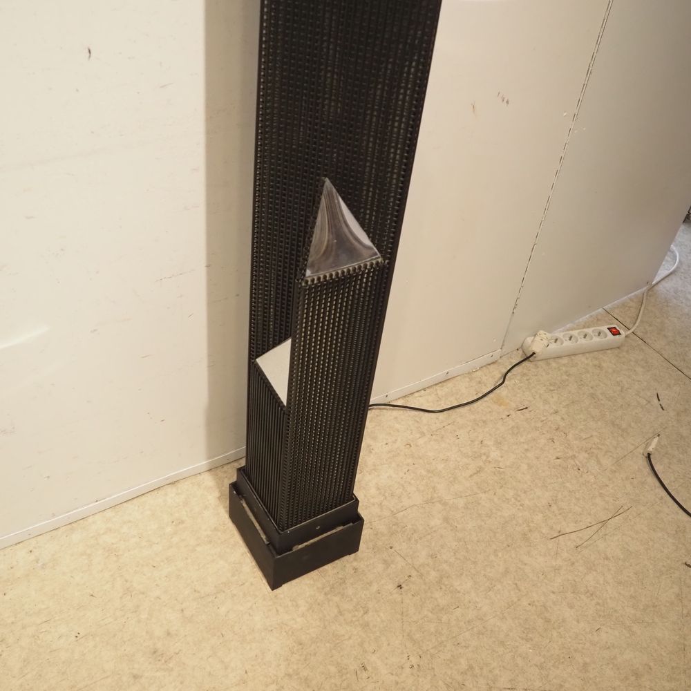 Lampe de sol d’inspiration gratte ciel année 1980 : Métal laqué noir ajouré à section carrée, H: 143 cm