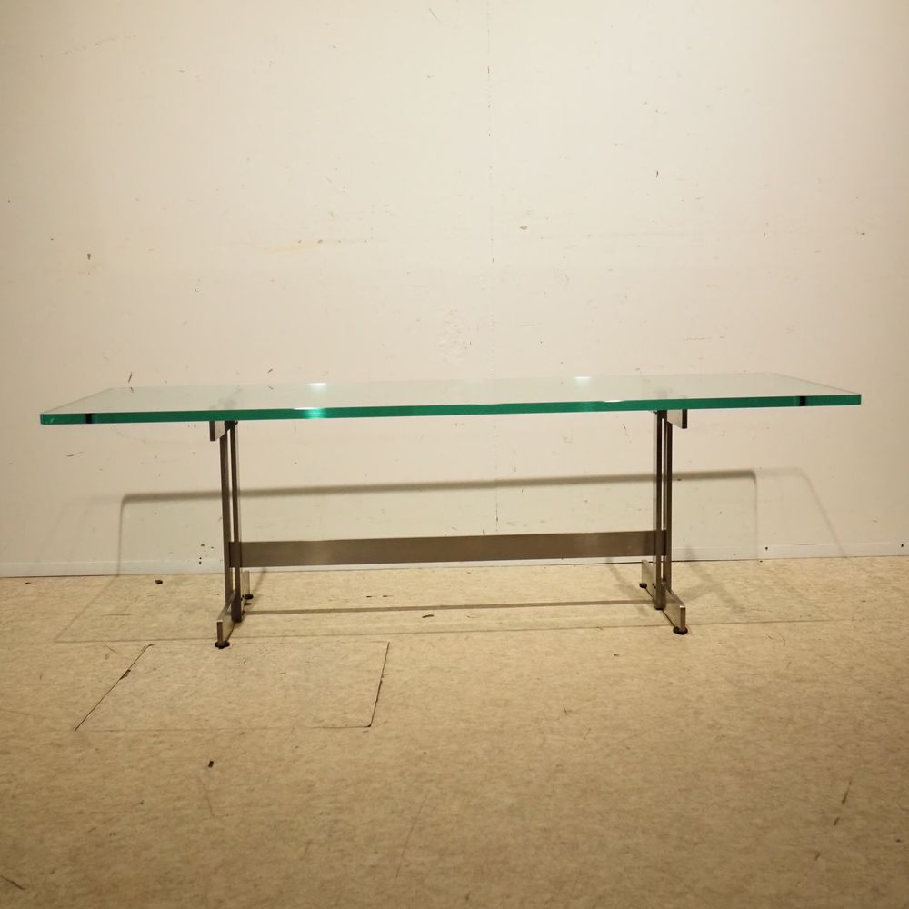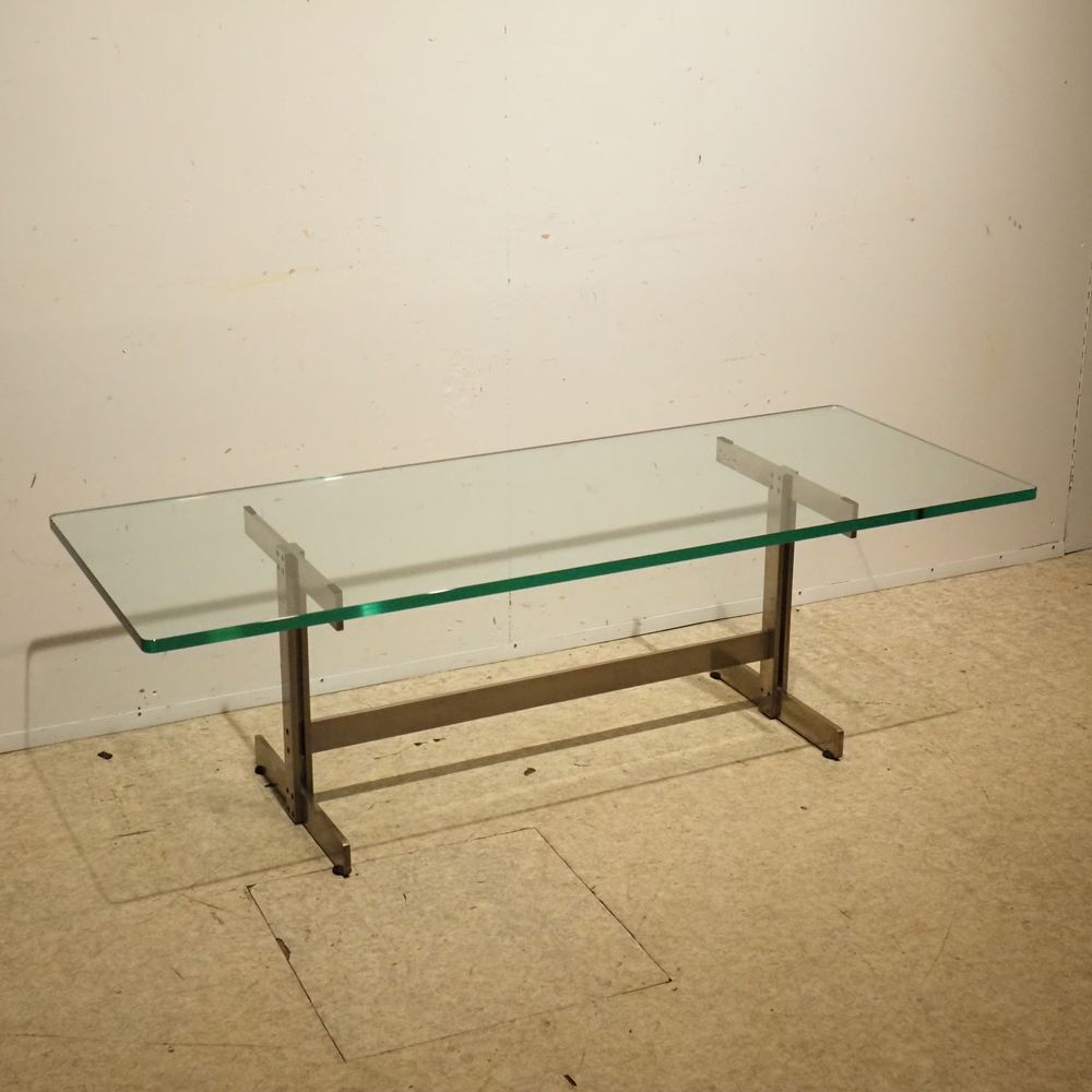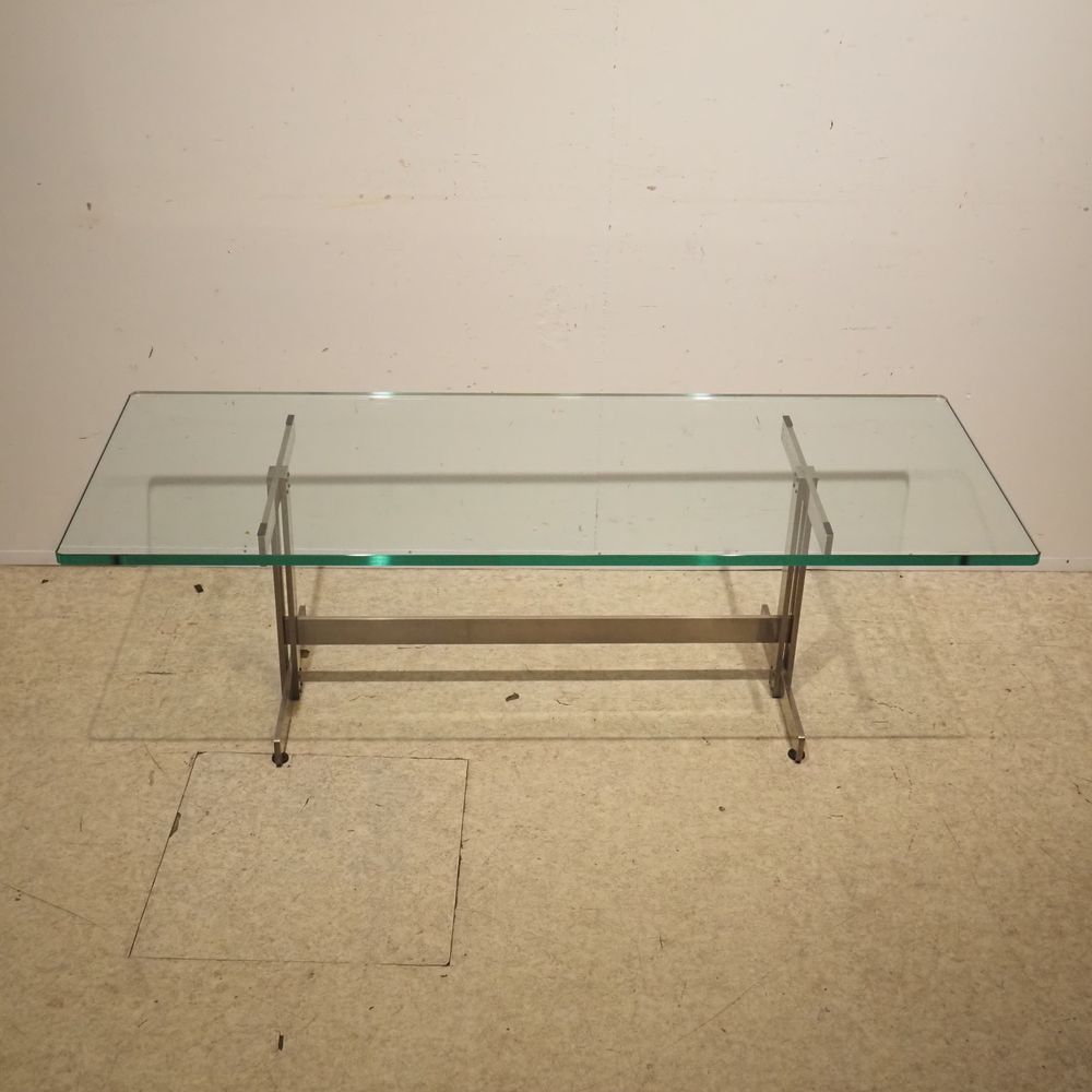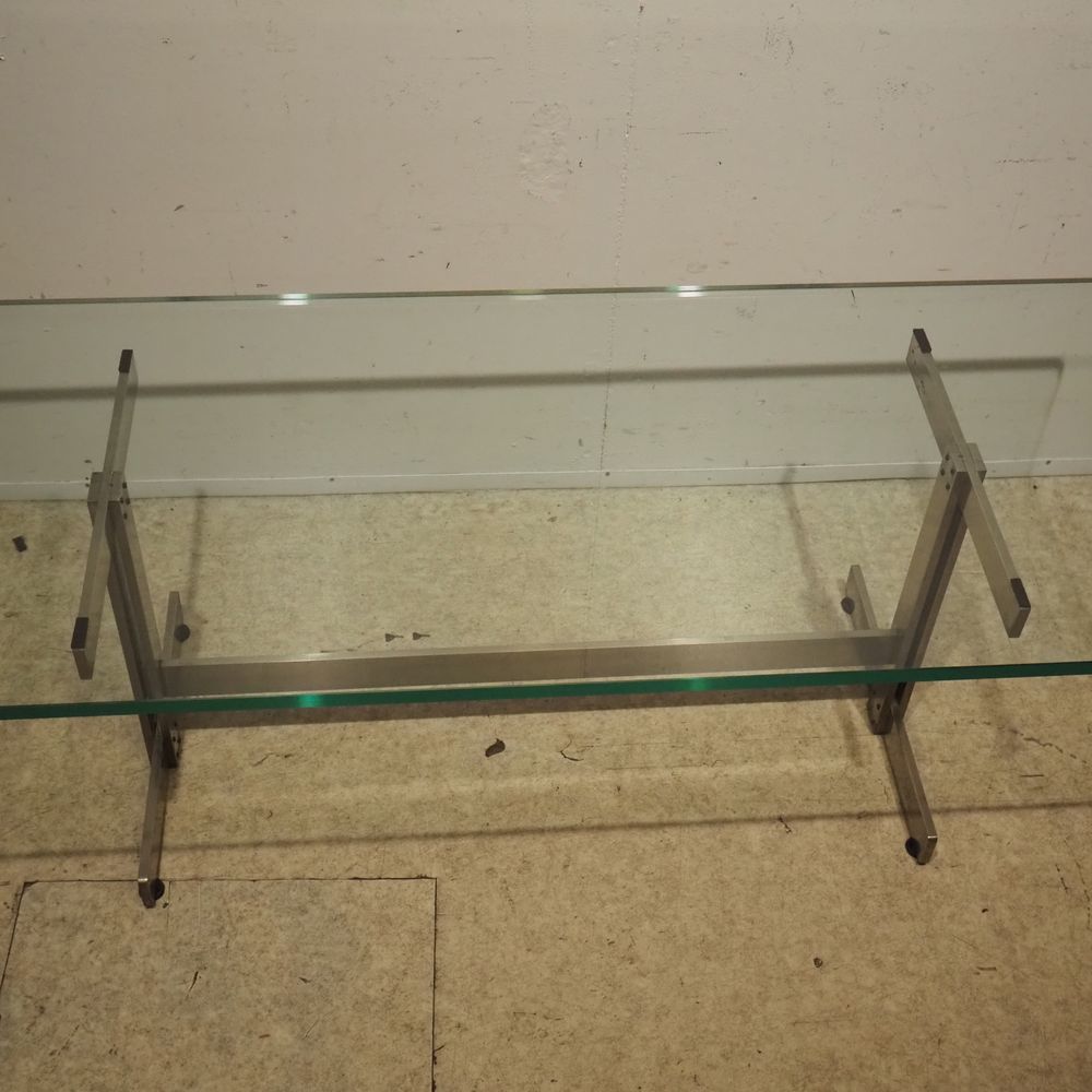 Jules Wabbes ( 1919- 1974 ) / Mobilier Universel : Table basse vers 1970, plateau rectangulaire (non d’origine), posé sur un piétement en acier plat assemblé en parallèle par des vis Allen, H: 43, L: 140, P: 54,5 cm