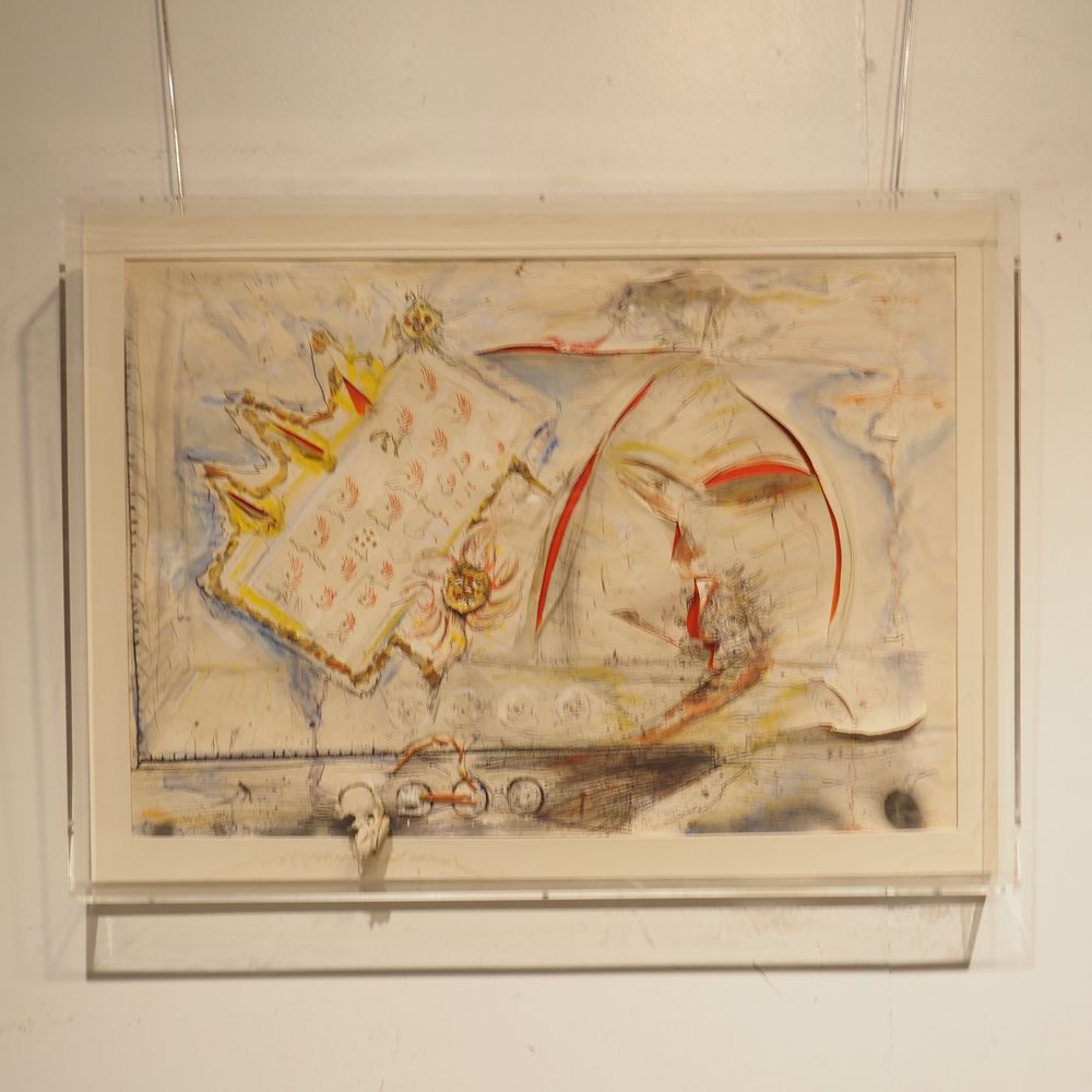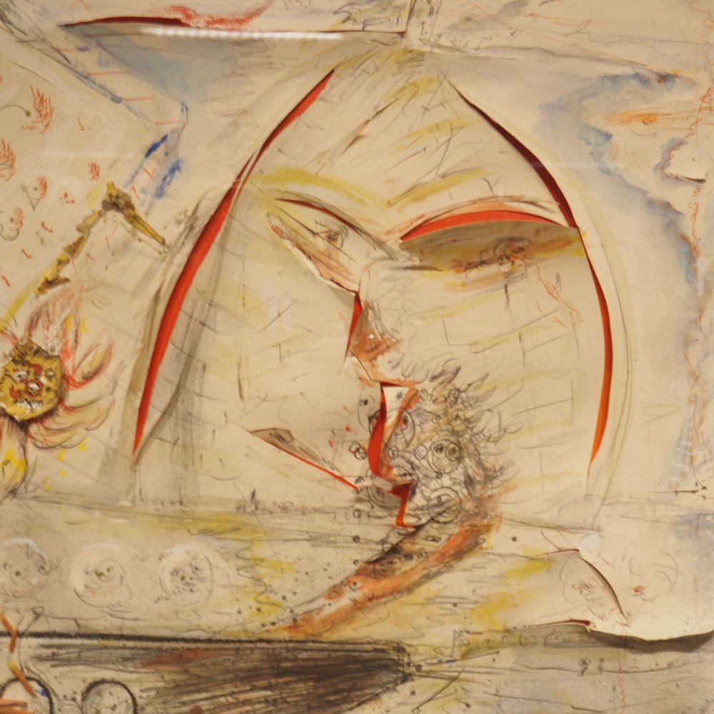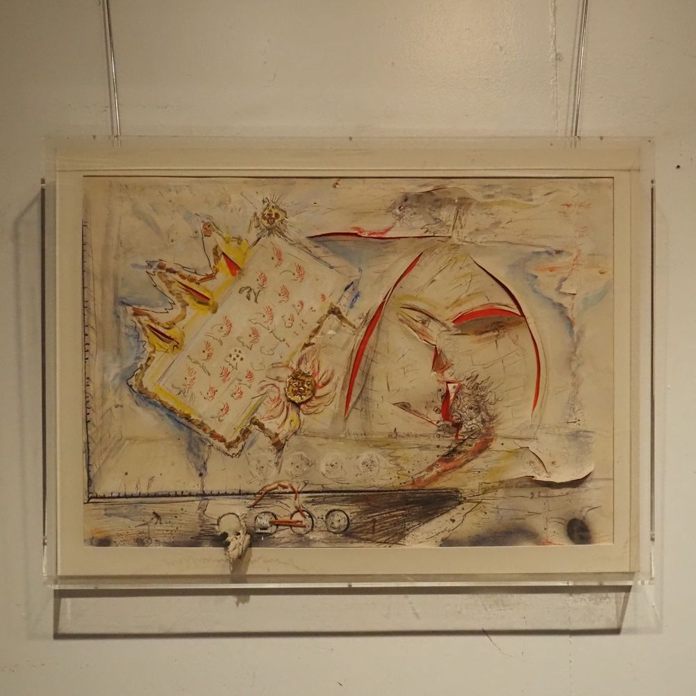 Fred Bervoets 1942 : Technique mixte vers 1980, gouache, aquarelle, éléments, taillade et collage, signée en bas à droite, dédicacée pour Lieve, encadrée dans un caisson en plexiglas, dim caisson : 61 x 83 cm, ep: 7,7 cm