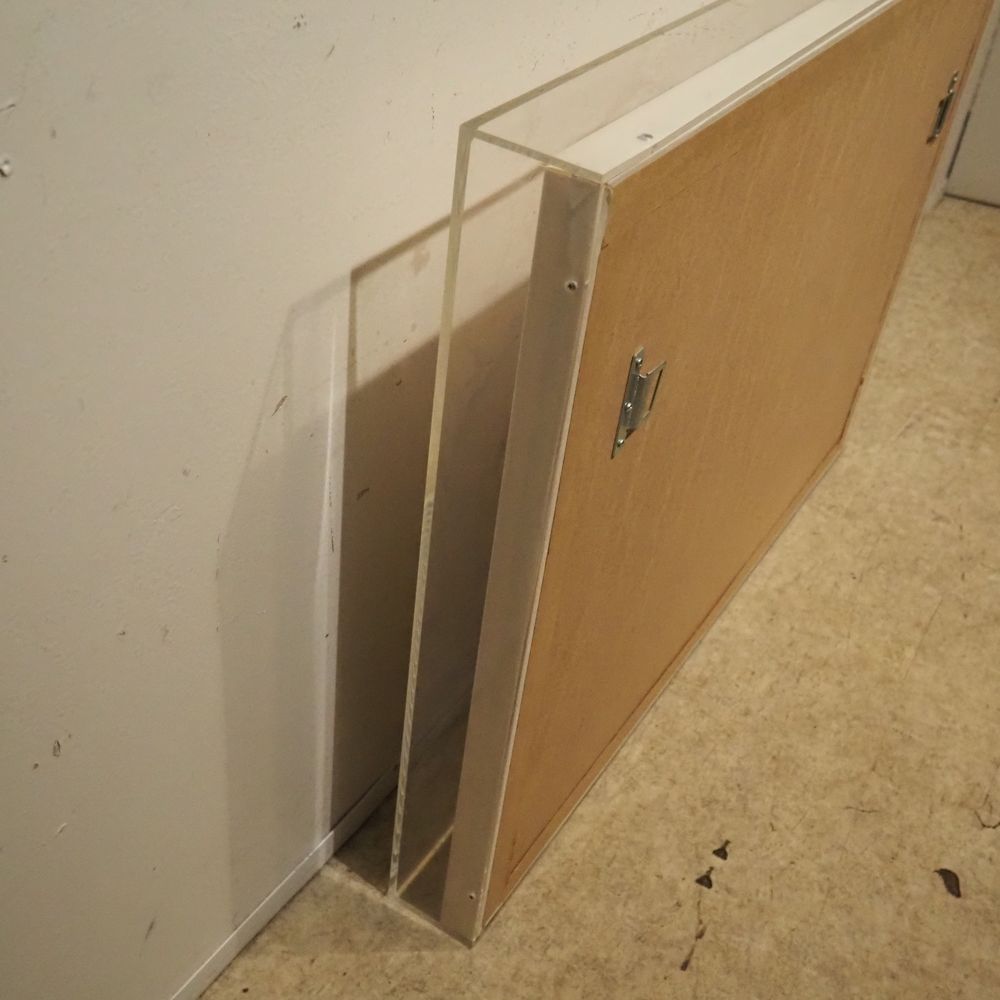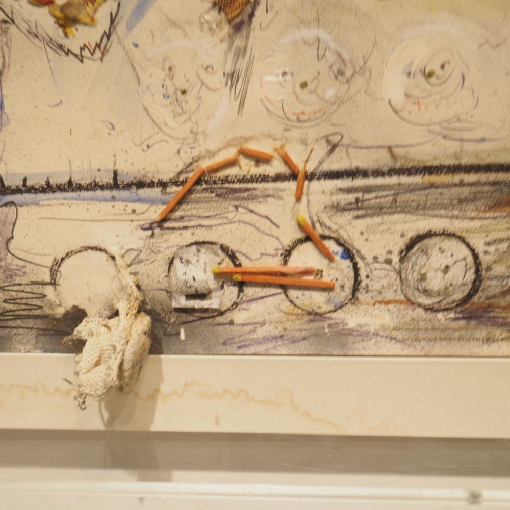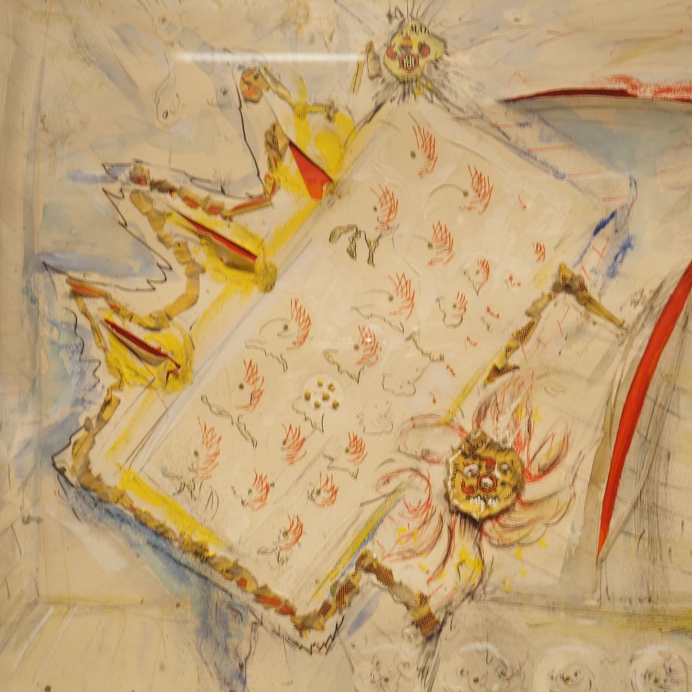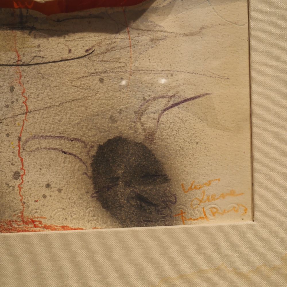 Fred Bervoets 1942 : Technique mixte vers 1980, gouache, aquarelle, éléments, taillade et collage, signée en bas à droite, dédicacée pour Lieve, encadrée dans un caisson en plexiglas, dim caisson : 61 x 83 cm, ep: 7,7 cm