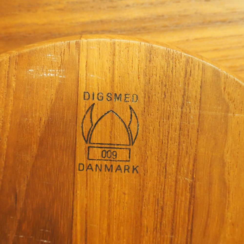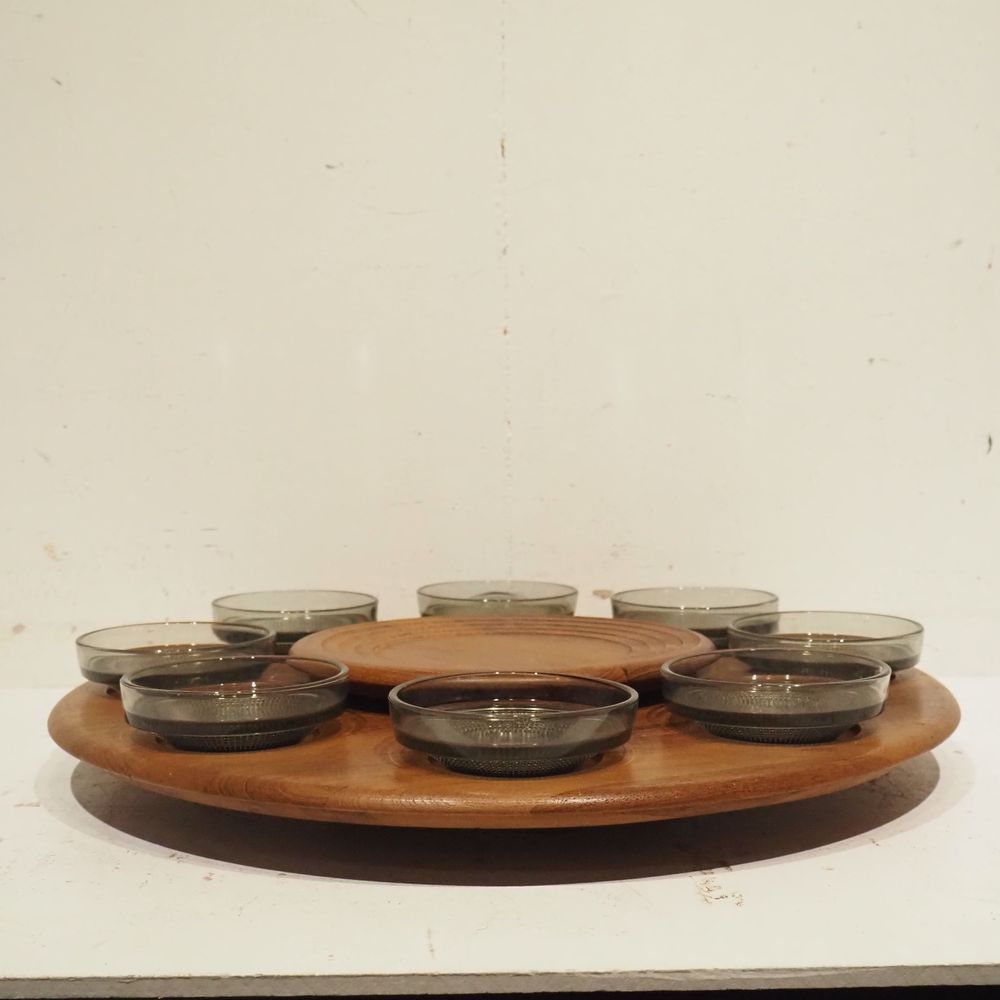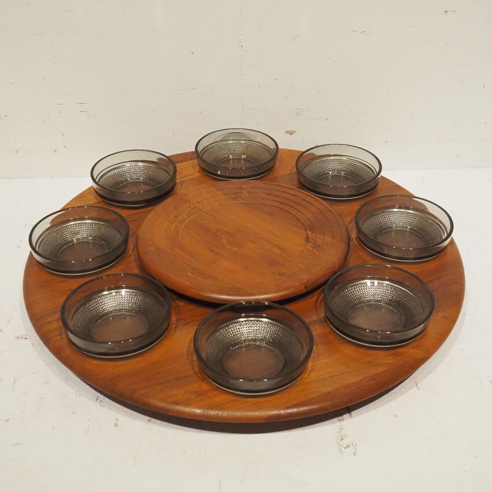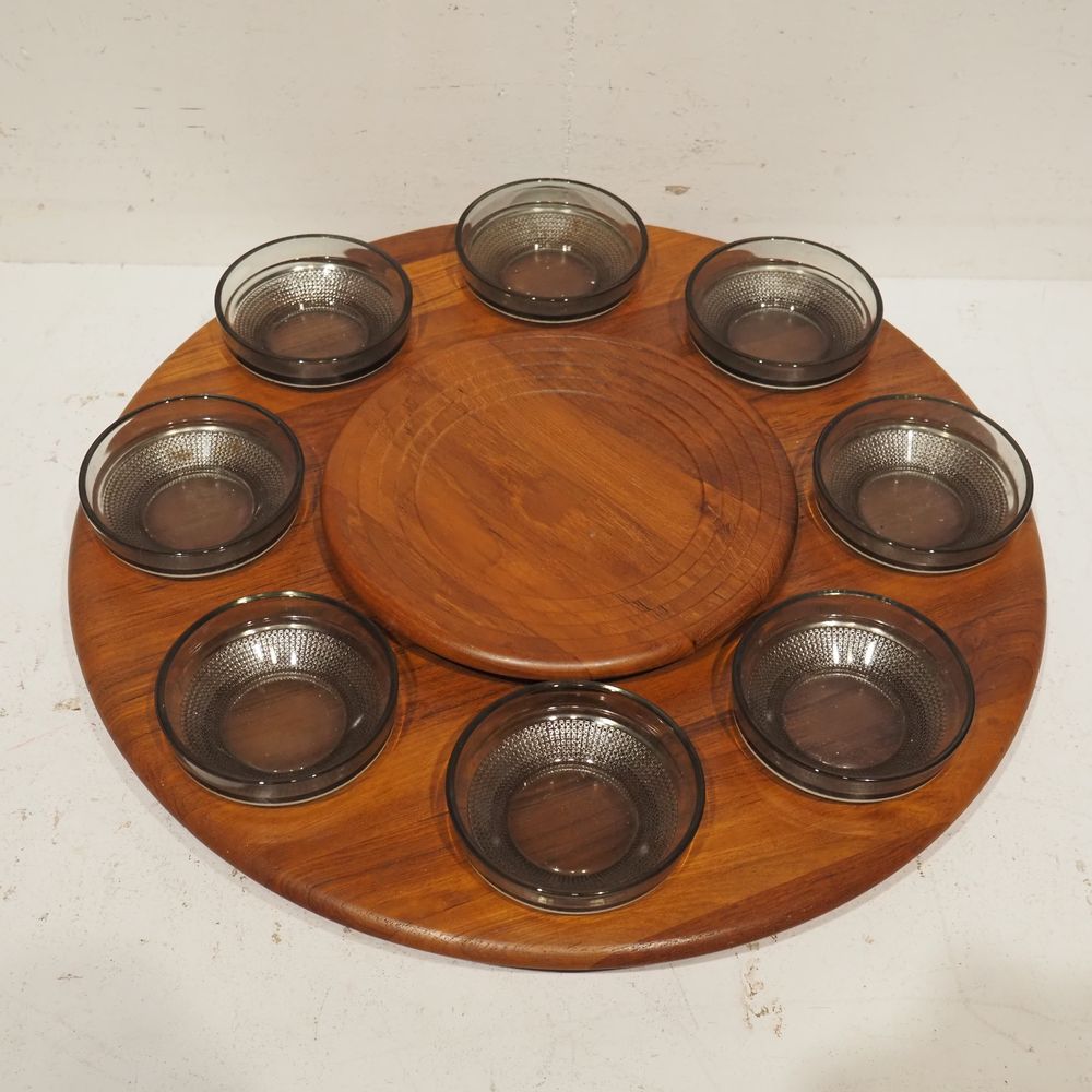 Digsmed Danemark / Nissen : Plateau à apero circulaire sur axe rotatif vers 1960, teck massif et coupelles de verre moulé fumé gris, estampillé sous la base, parfait état, diam: 53 cm