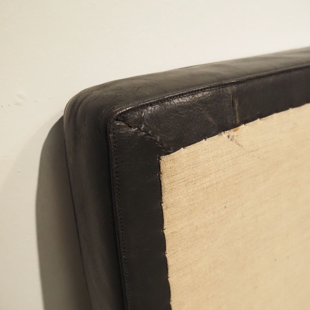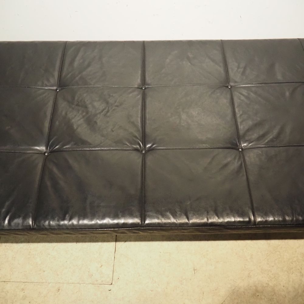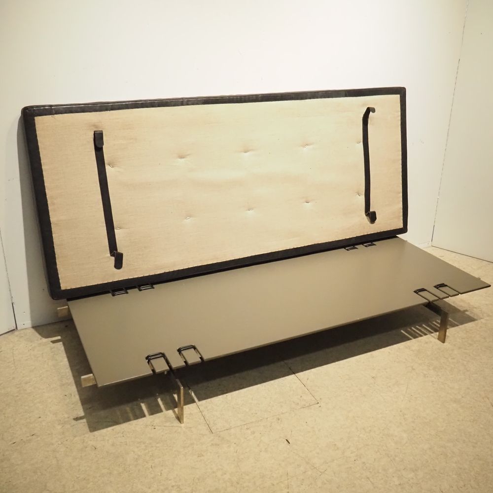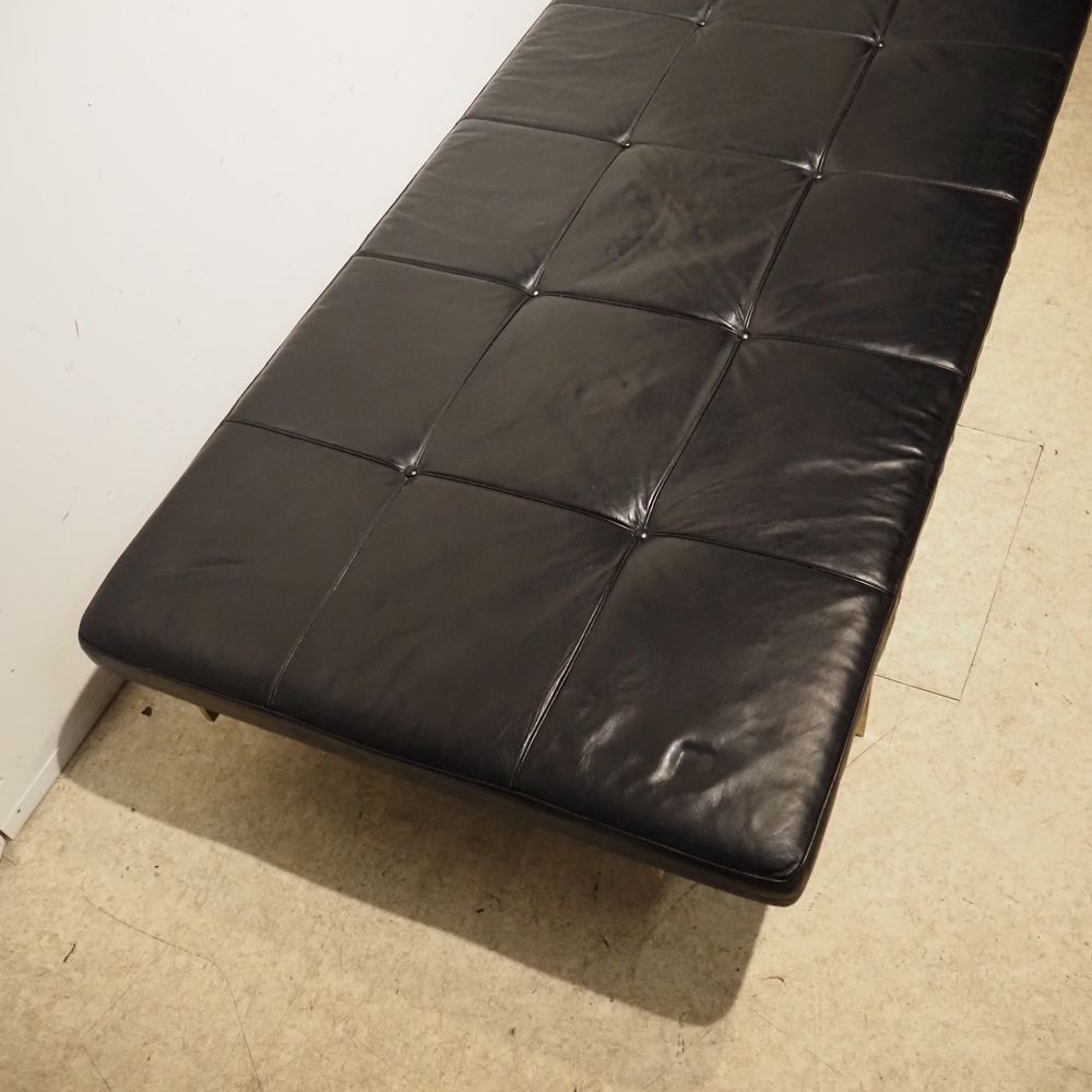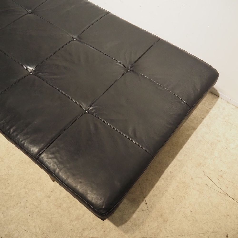 Poul Kjaerholm (1929-1980) Kold Christiansen : Lit de repos, modèle PK80, dessiné en 1957, matelas en mousse et crin garnis de croupon de cuir, posé sur une feuille de contreplaqué ajourée laqué gris sur une structure quadripode en acier plat nickelé, estampillé du logo Kold Christiansen, bon état général, H: 30, L: 190, P: 80 cm