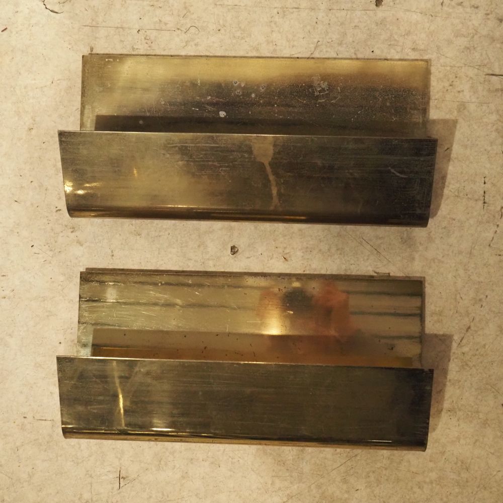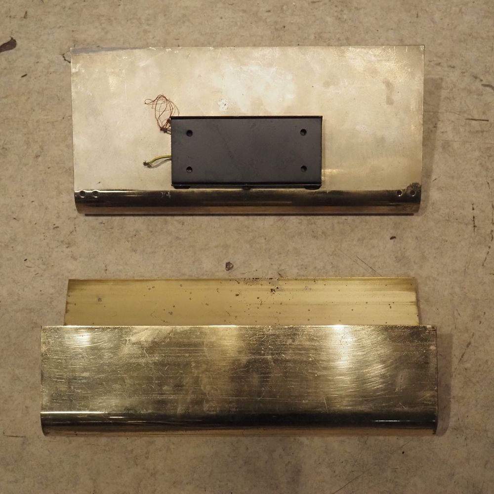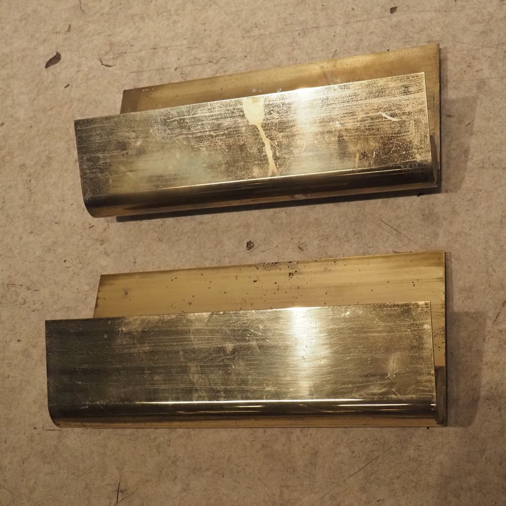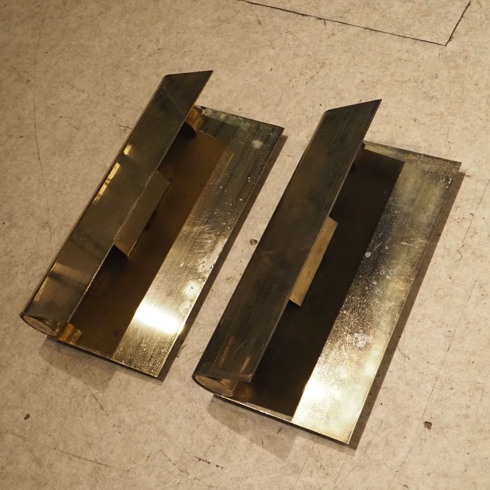 Christophe Gevers (1928-2007) : Paire d’appliques vers 1970, feuille de laiton cintrées et dorées, 1ére édition, oxydation superficielle, dim: 19,5 x 40 cm, P: 11,5 cm