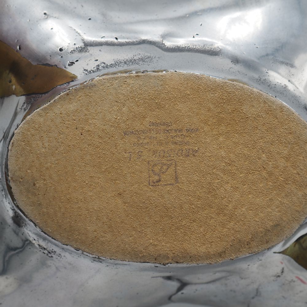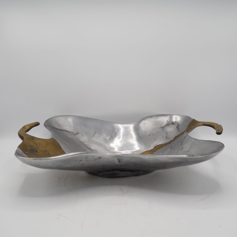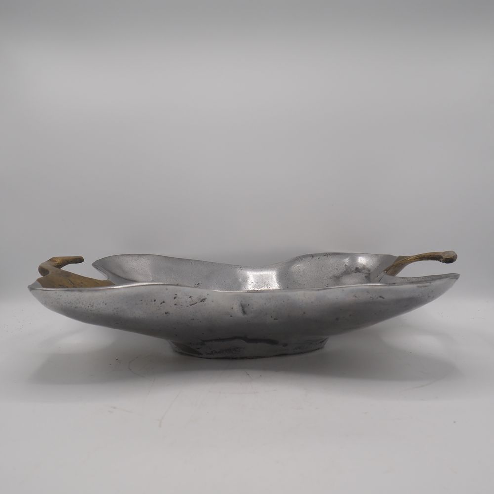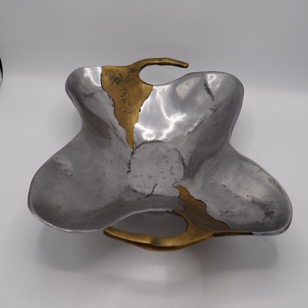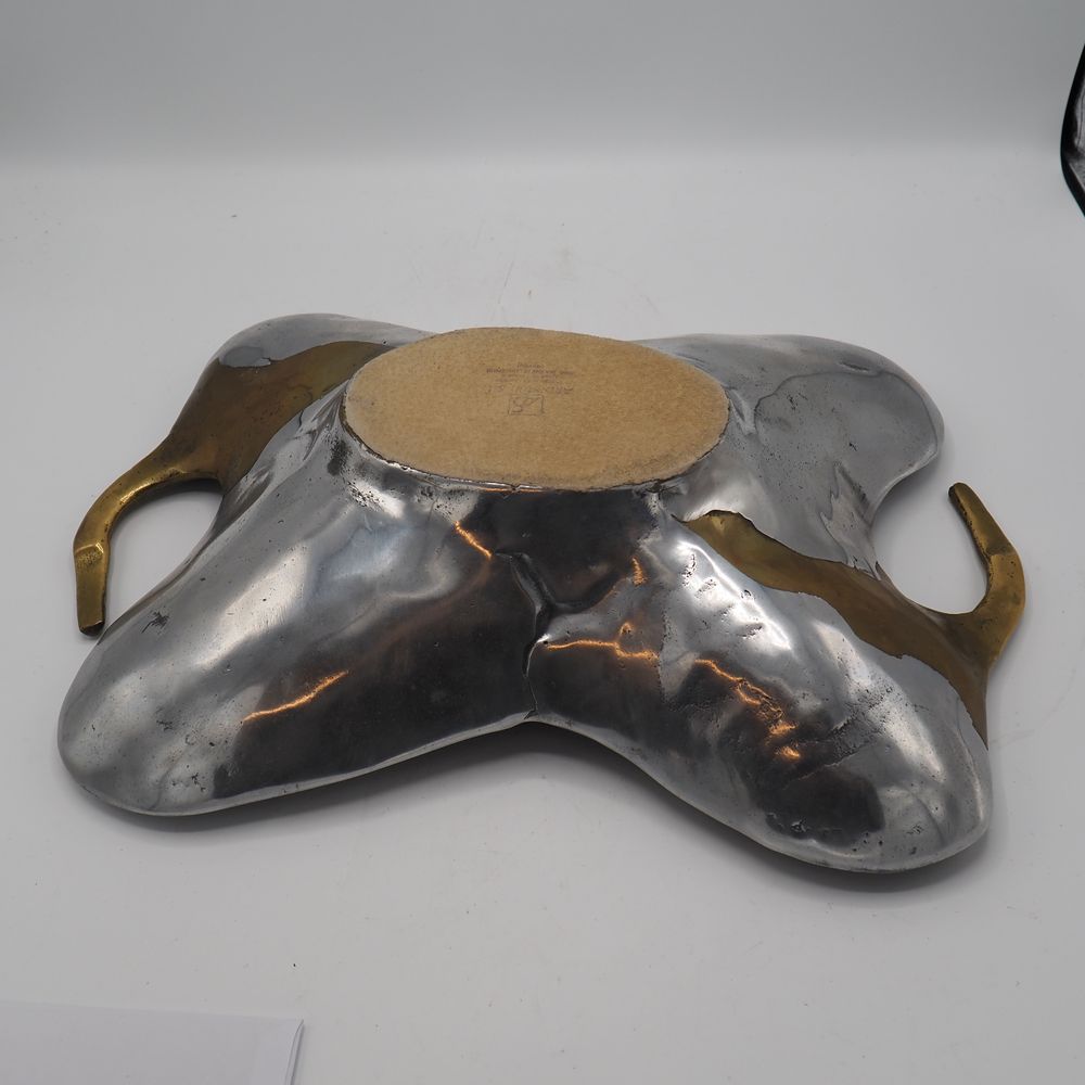 David Marshall 1942 : Milieu de table à 2 anses, fonte d’aluminium et laiton poli, signée sous la base, H: 10, L: 45, P: 31,5 cm