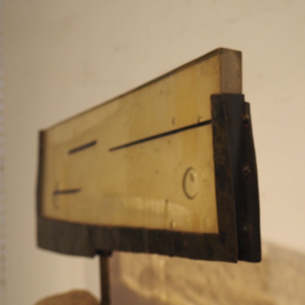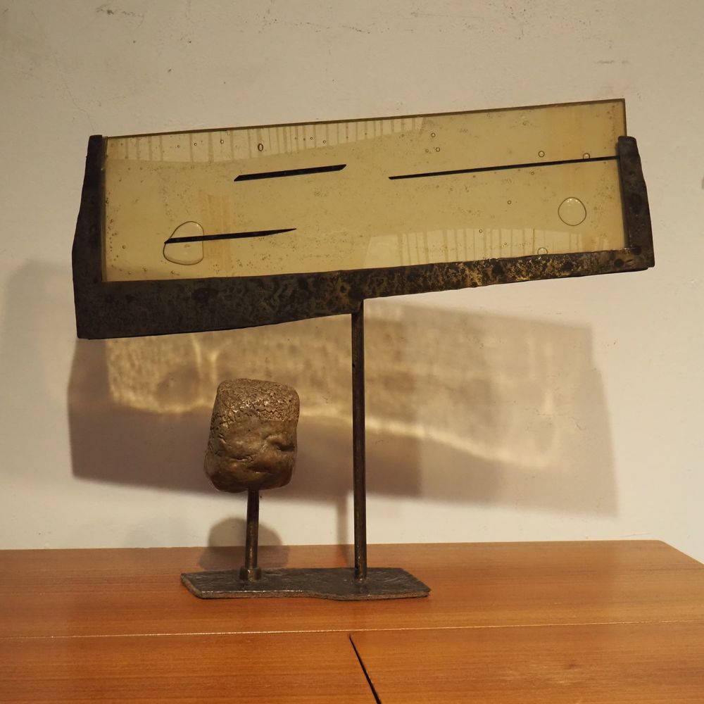 Sculpture vers 1970 : Plexiglas, métal soudé, laiton, pierre et météorite, H: 47, L: 55, P: +/- 12 cm