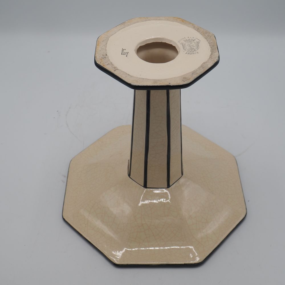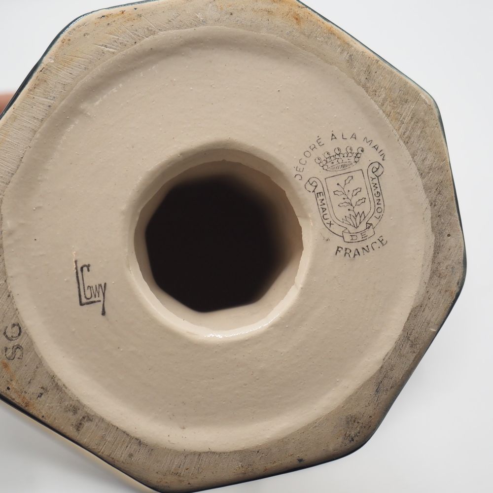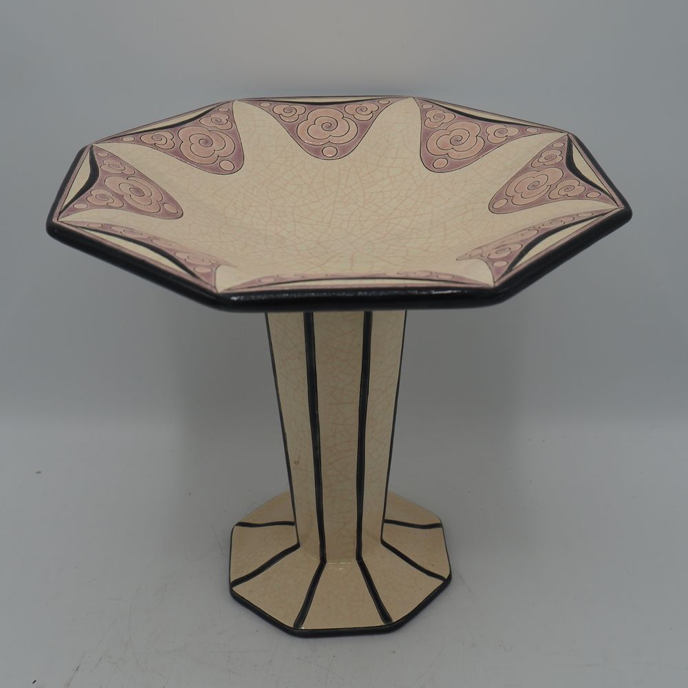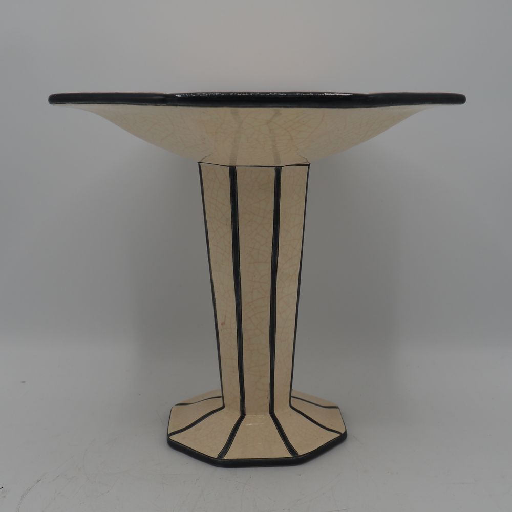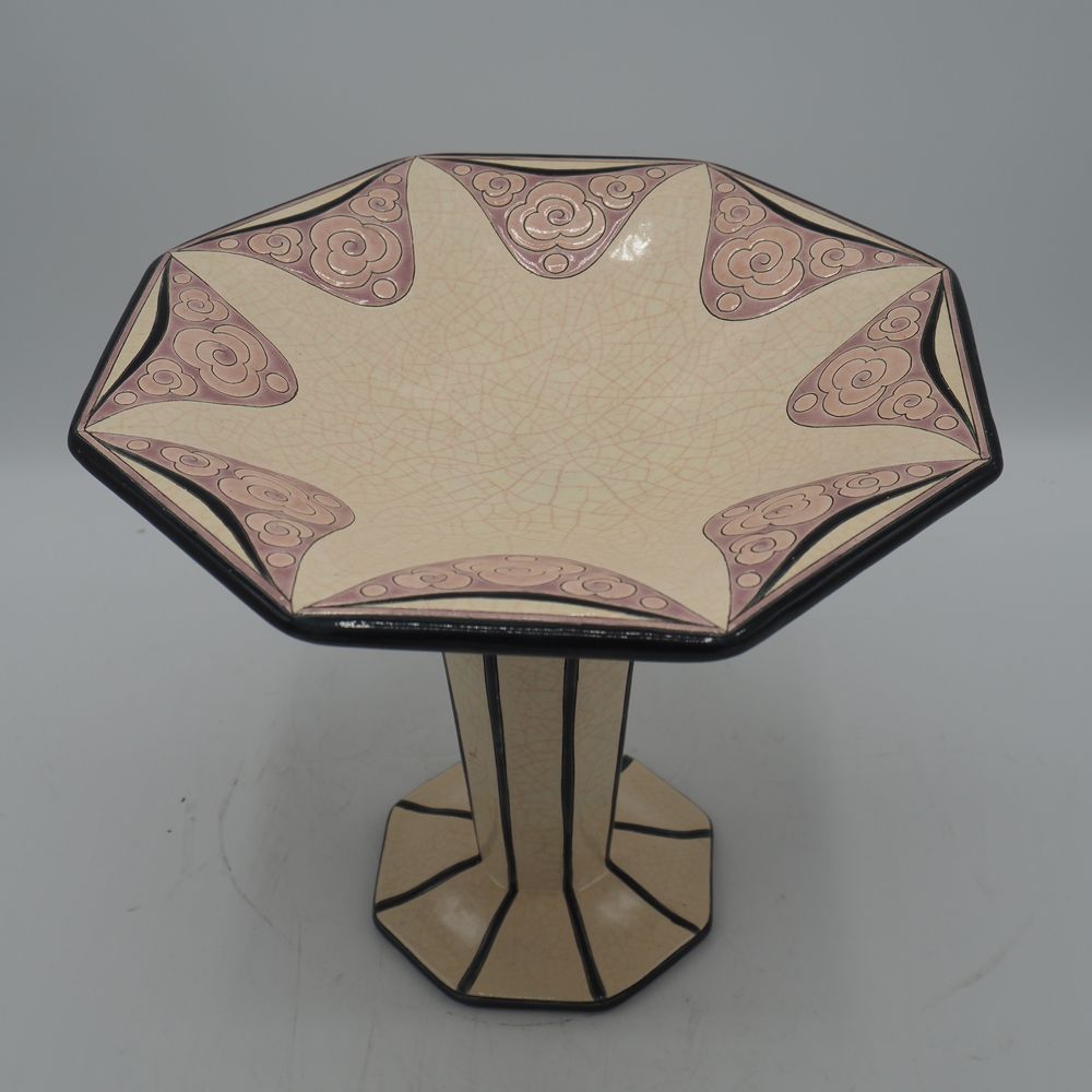 Emaux de Longwy : Coupe sur pied Art-Déco, faience émaillée craquellée décor stylisé, coupe, jambe et pied à sections octogonales, cachet sous la base, H: 23, L: 24,7, P: 24,5 cm