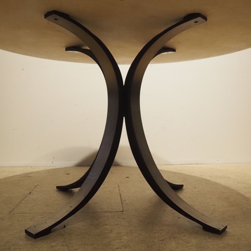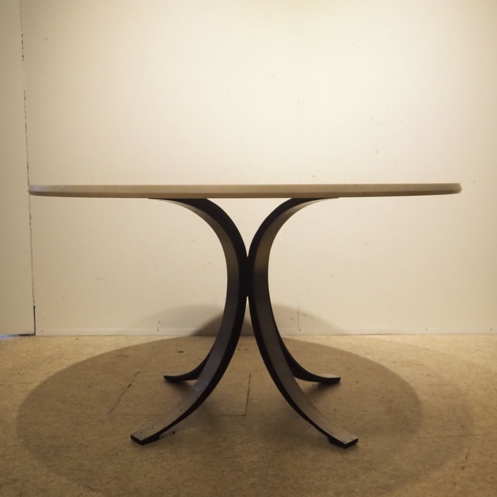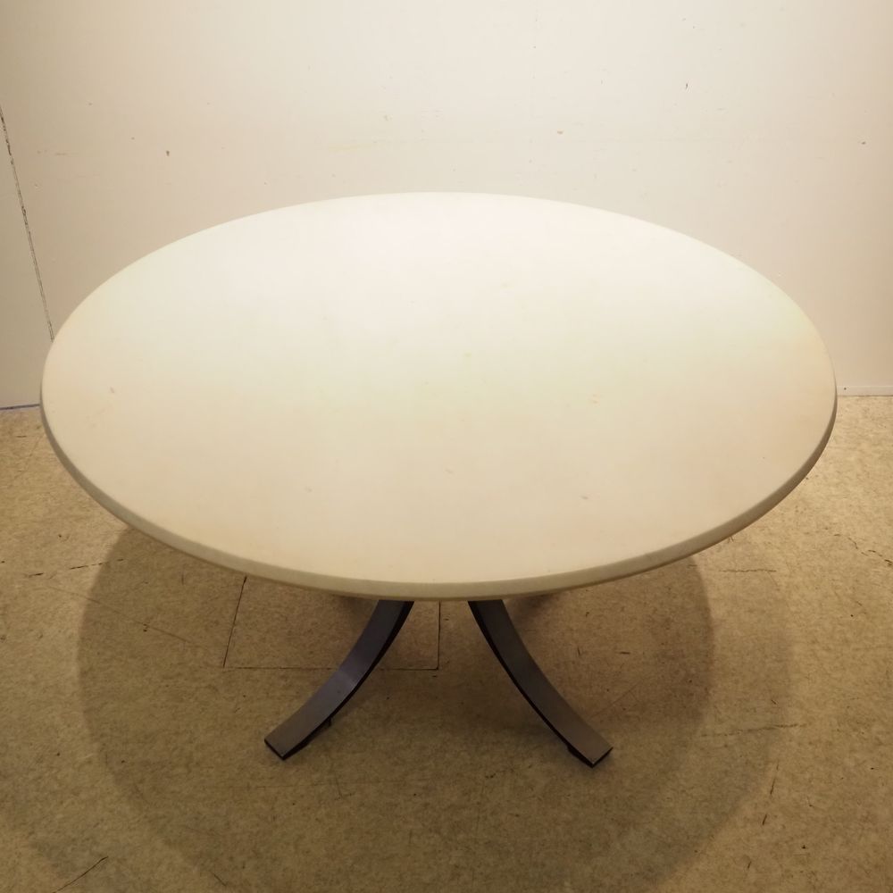 Borsani Osvaldo (1911-1985) / Tecno : Table haute, modèle « T 69 », dessinée en 1963, épais plateau circulaire biseauté en marbre de Carrare blanc veiné gris, posé sur un piétement quadripode en fonte d’aluminium cintré formant C, porte l’étiquette Tecno, très bel état d’origine, diam: 130 cm, H : 73 cm