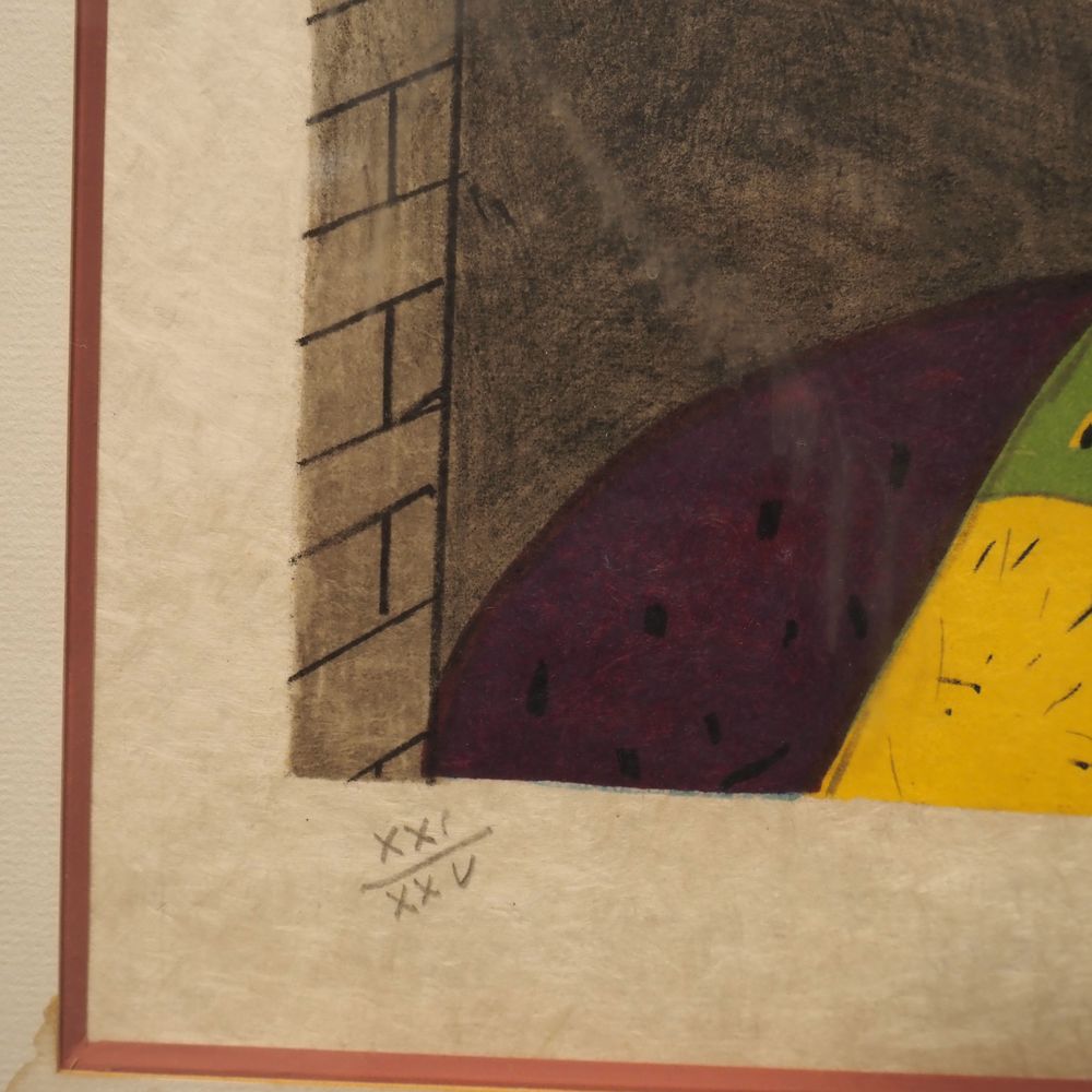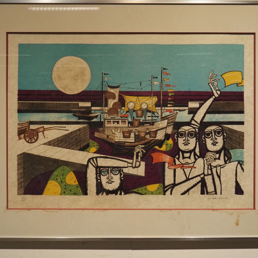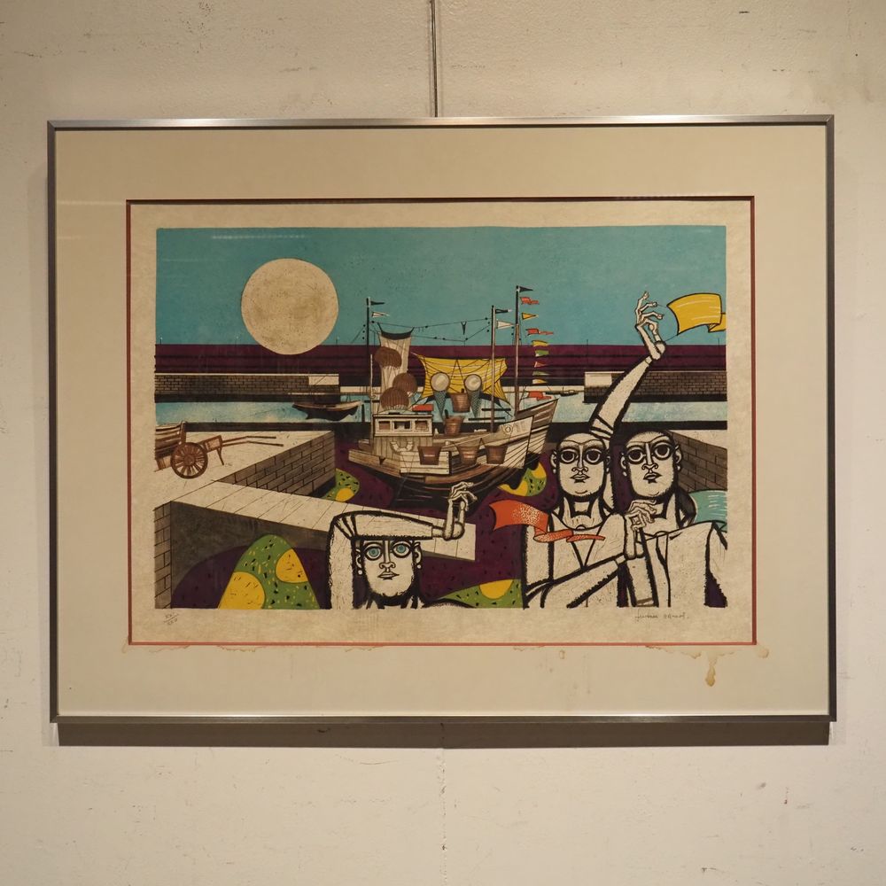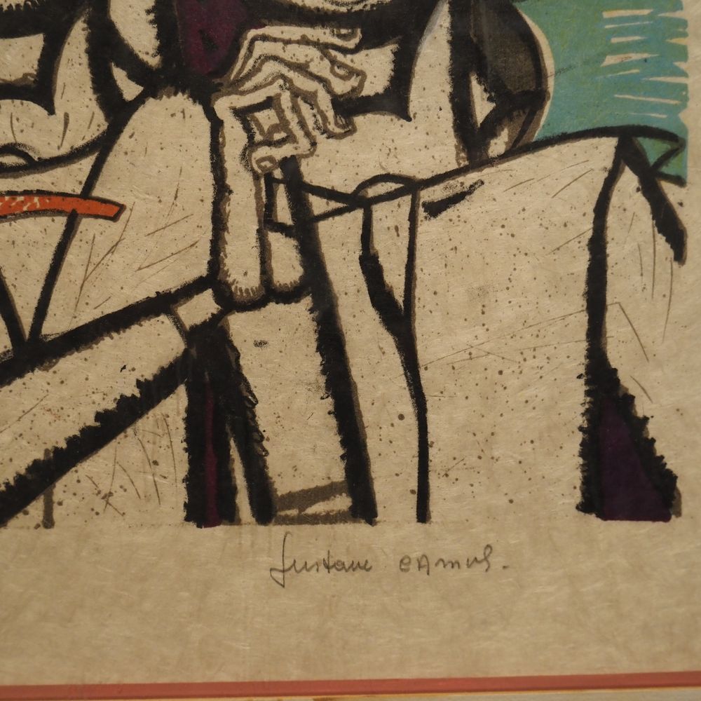 Camu Gustave (1914-1984) : Eau forte couleur sur papier japon, pecheurs, signée au crayon en bas à droite, numérotée en chiffre romain XXI/XXV, encadrement sous verre, dim image: 40,5 x 60,5 cm