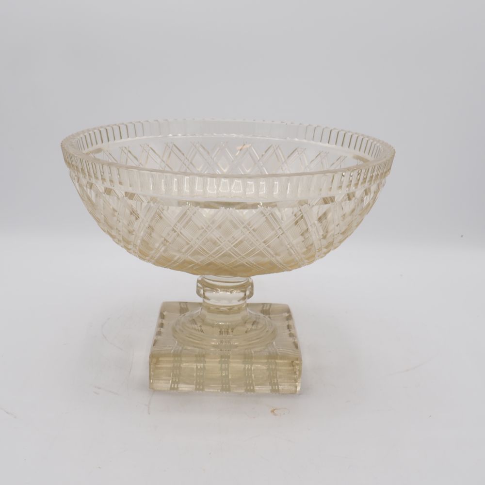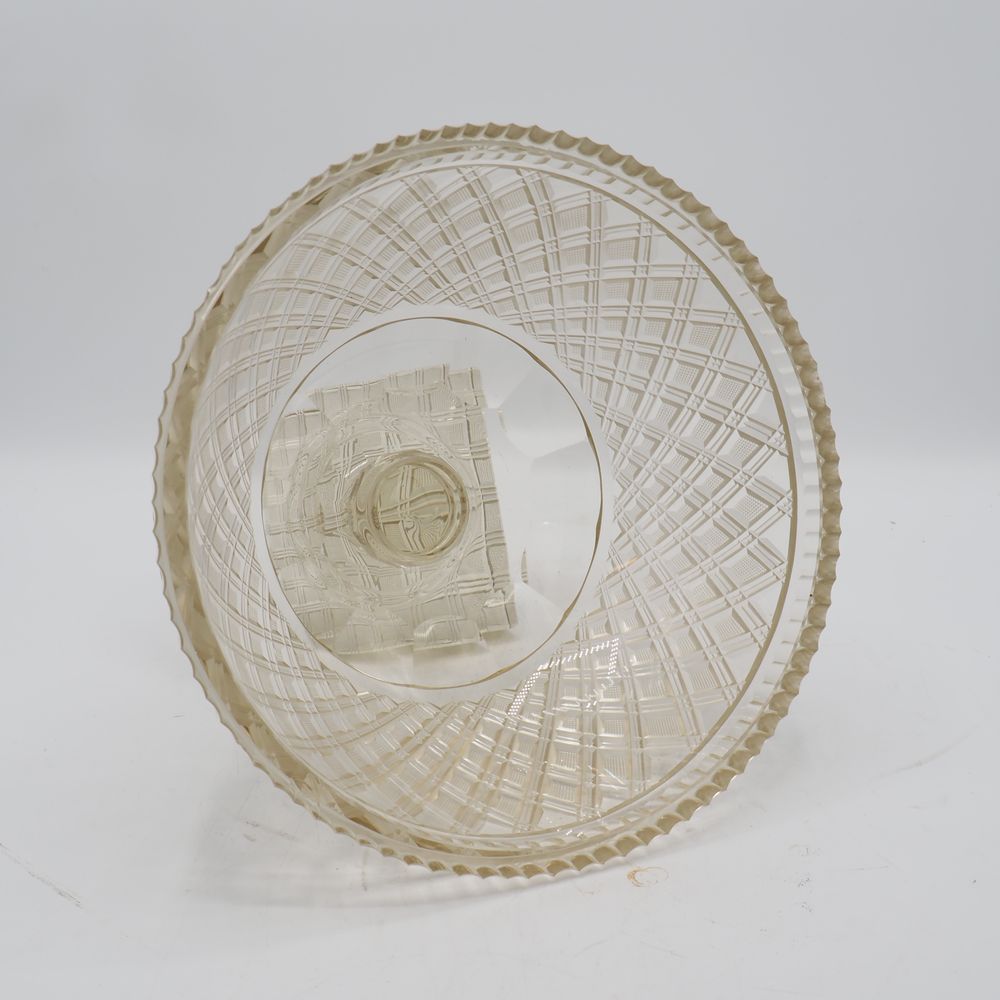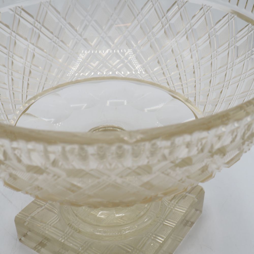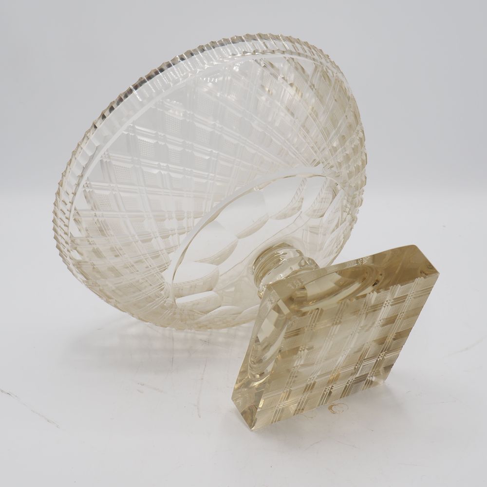 Cristal de Vonêche : Coupe à fruits Art-Déco, cristal clair taillé, motif de losanges, jambe avec bague dodécagonale et pied à section carrée, (éclat au col), H: 19, diam: 26,5 cm