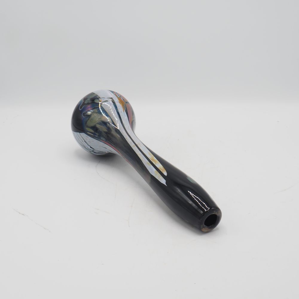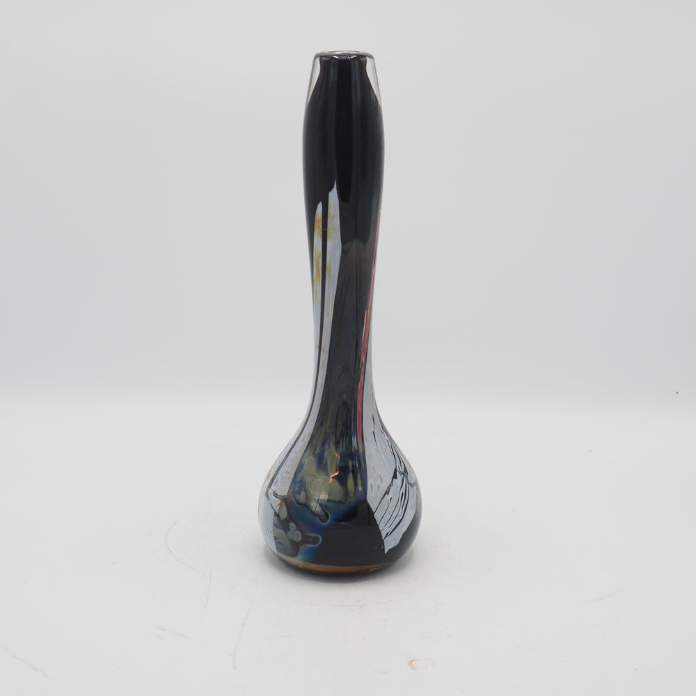 Louis Leloup 1929 / 2025 : Vase soliflor de forme oignon, cristal soufflé bouche et intércalaire noir, décor irisé, motif plume de paon, signé à la pointe sous la base, daté 2002, H: 31,5 cm