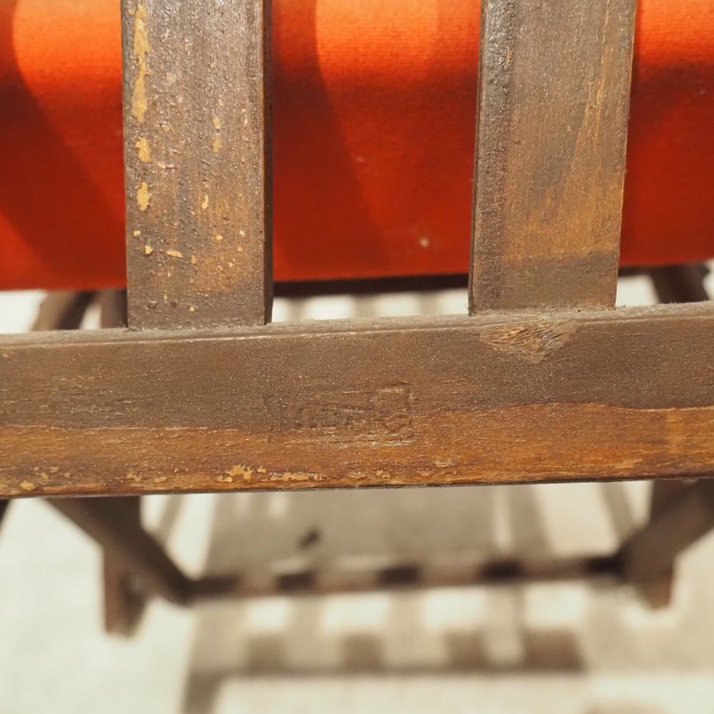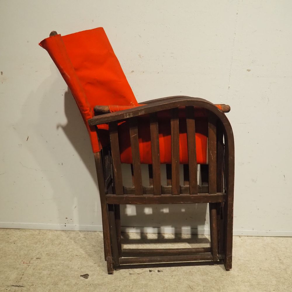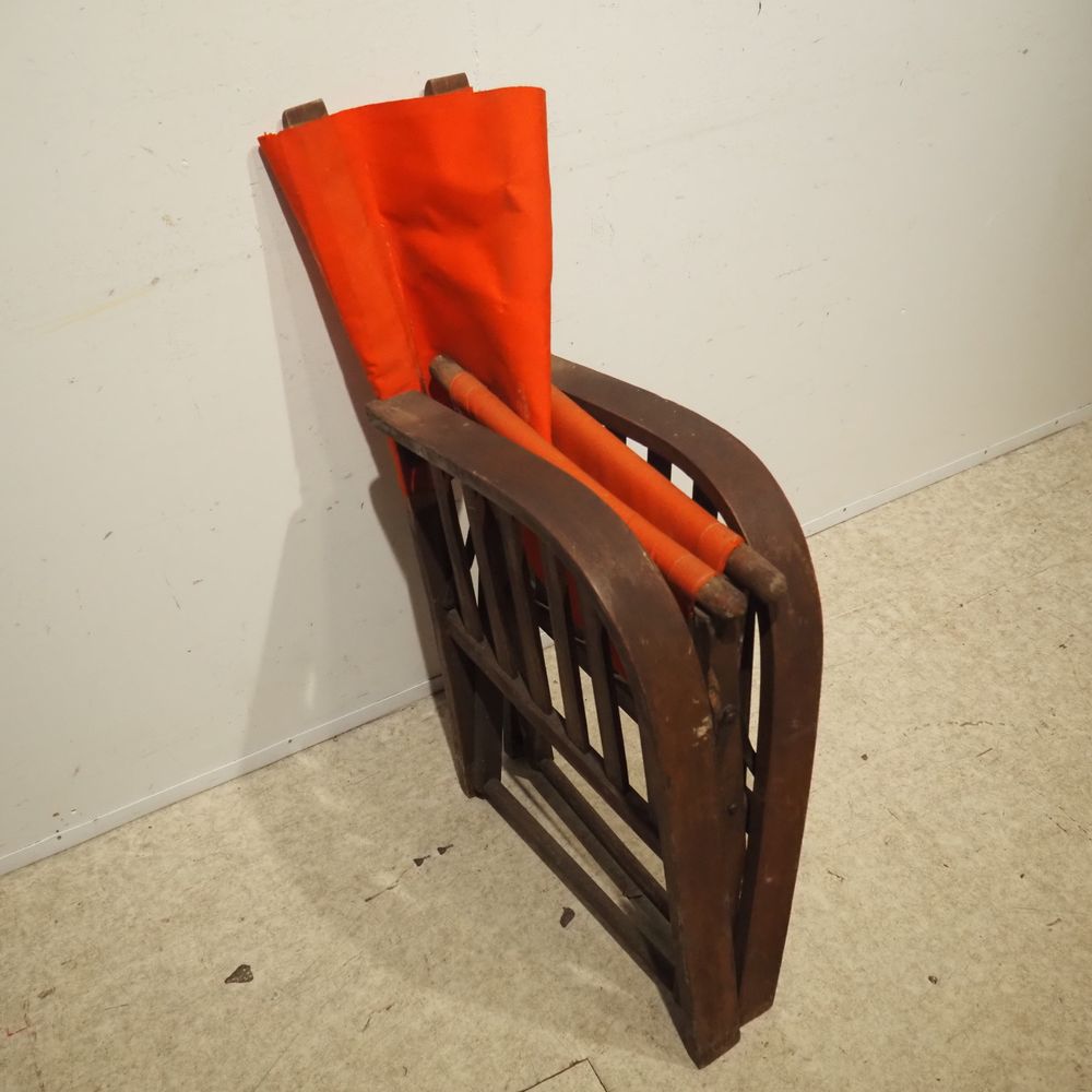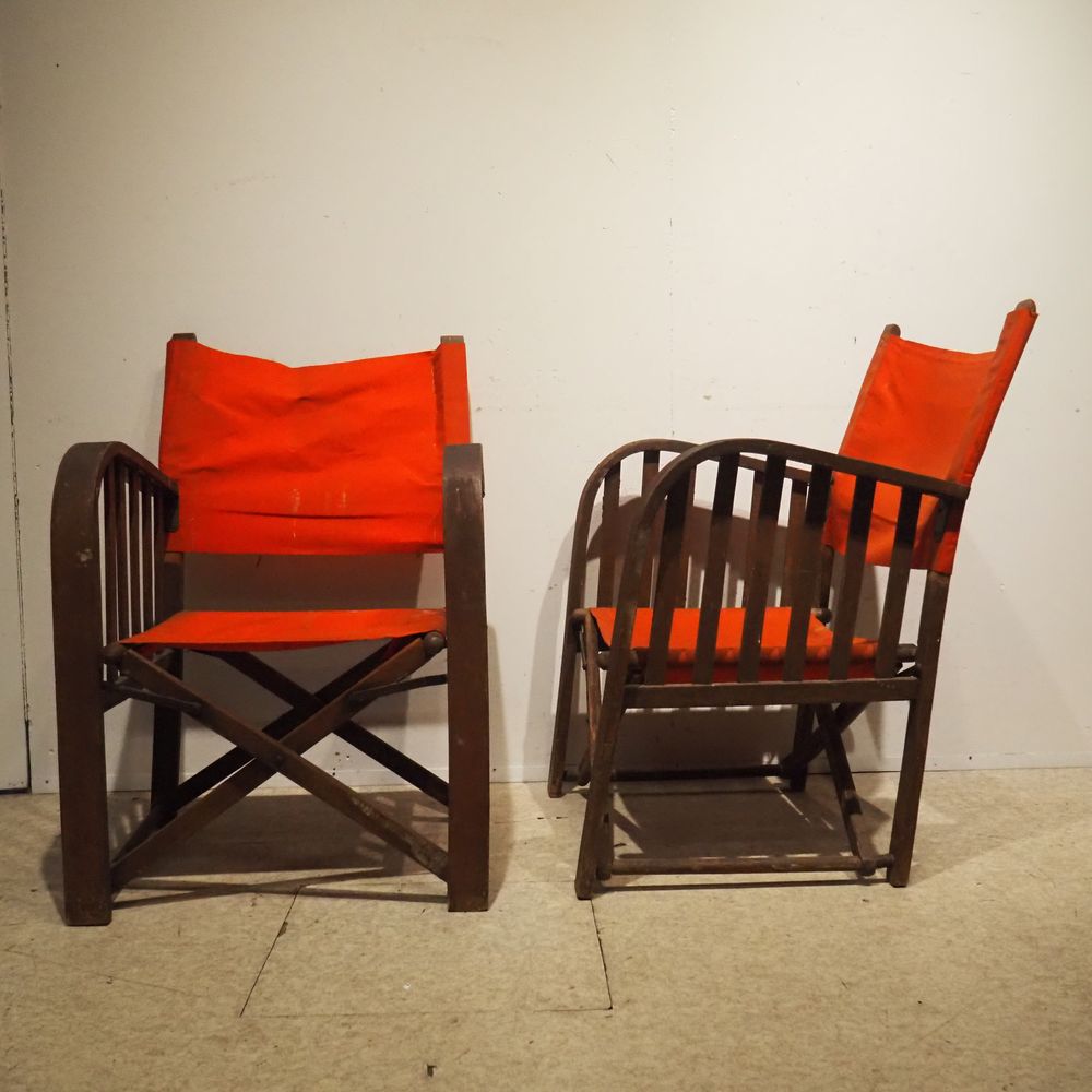 Tork : Paire de fauteuils de plage pliants vers 1930, structure en bois avec accottoirs cintrés, assise et dossier garnis de toile, (à rafraichir)