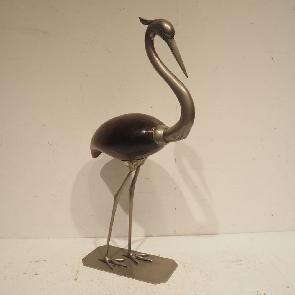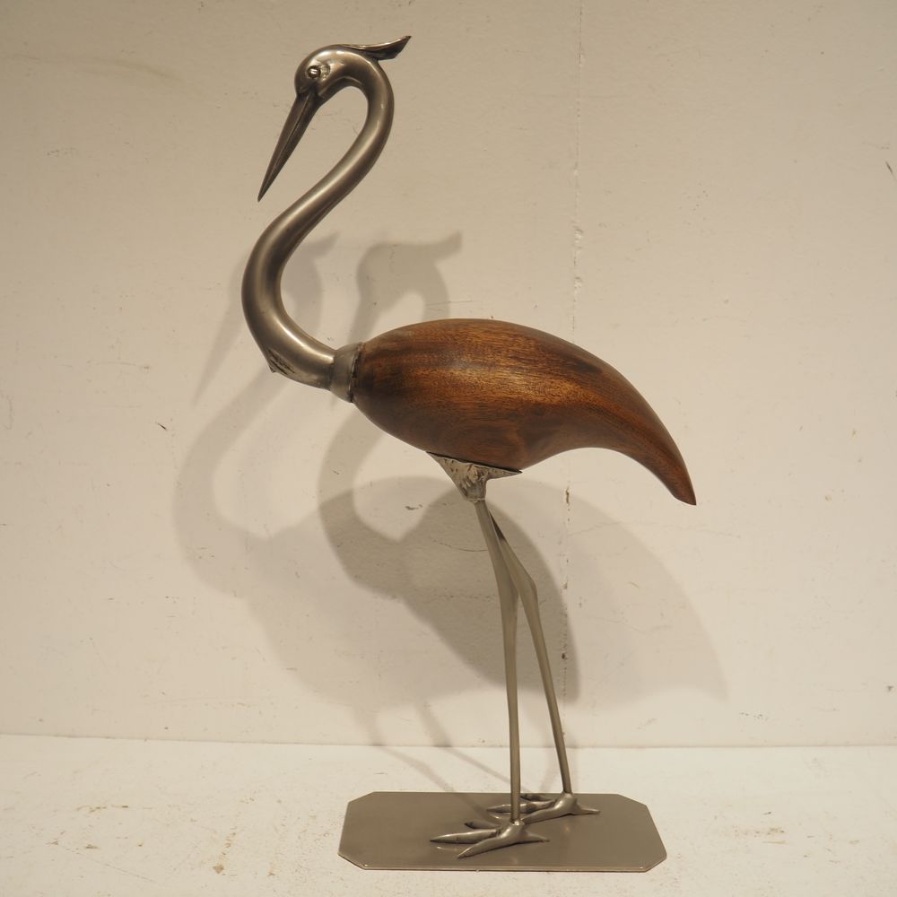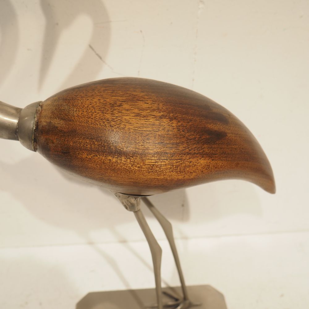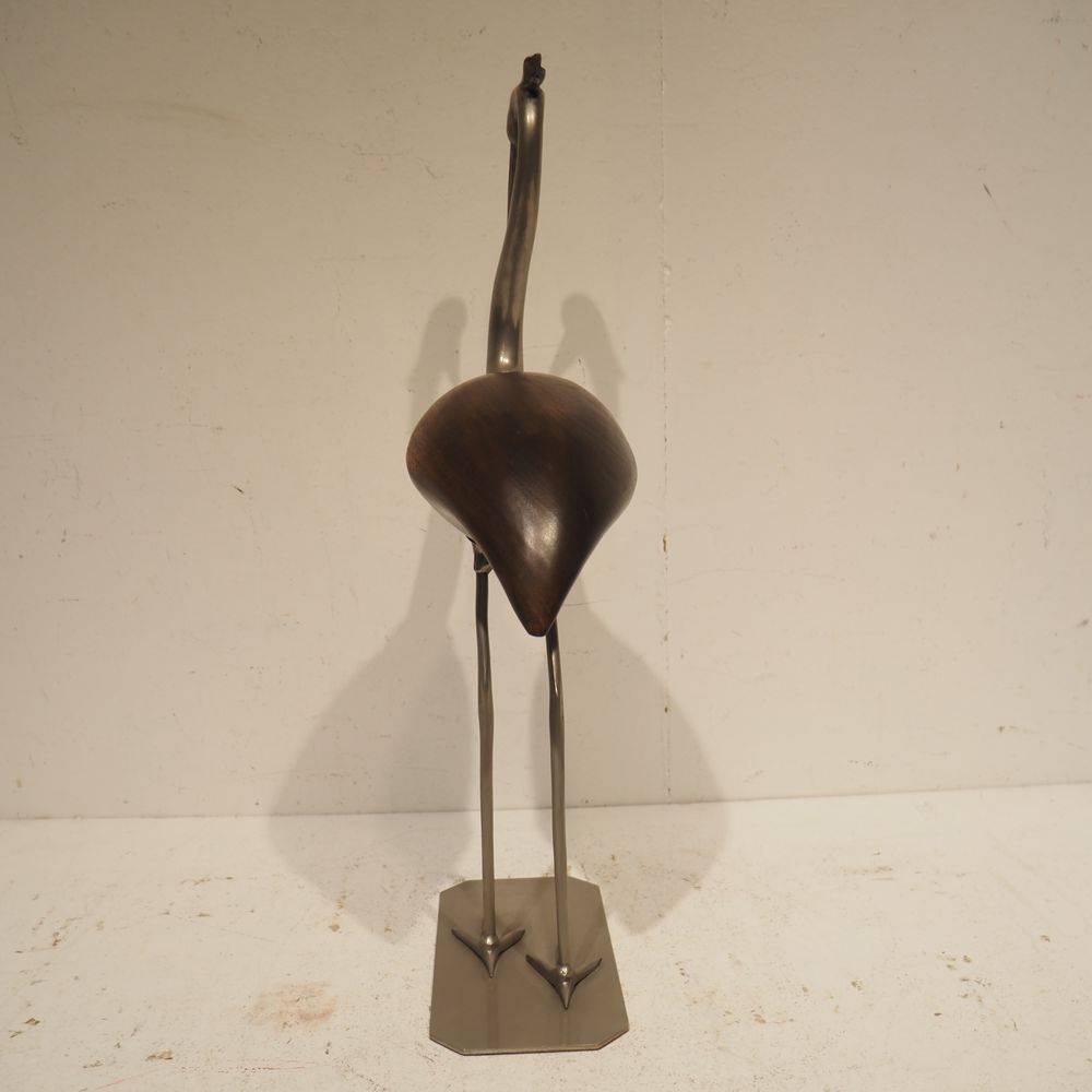 Objet de décoration vers 1970 : Héron, bois et métal, H: 65, L: 31, P: 14 cm