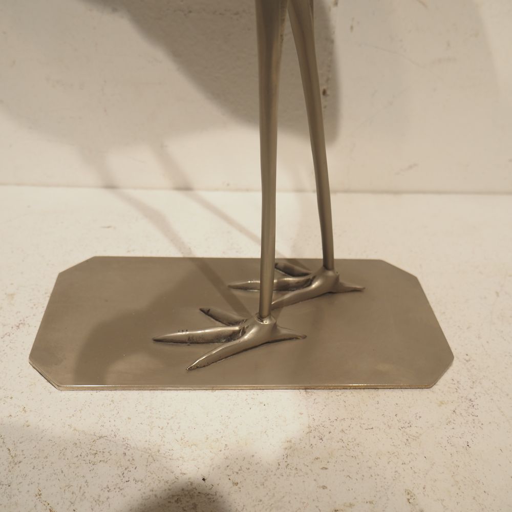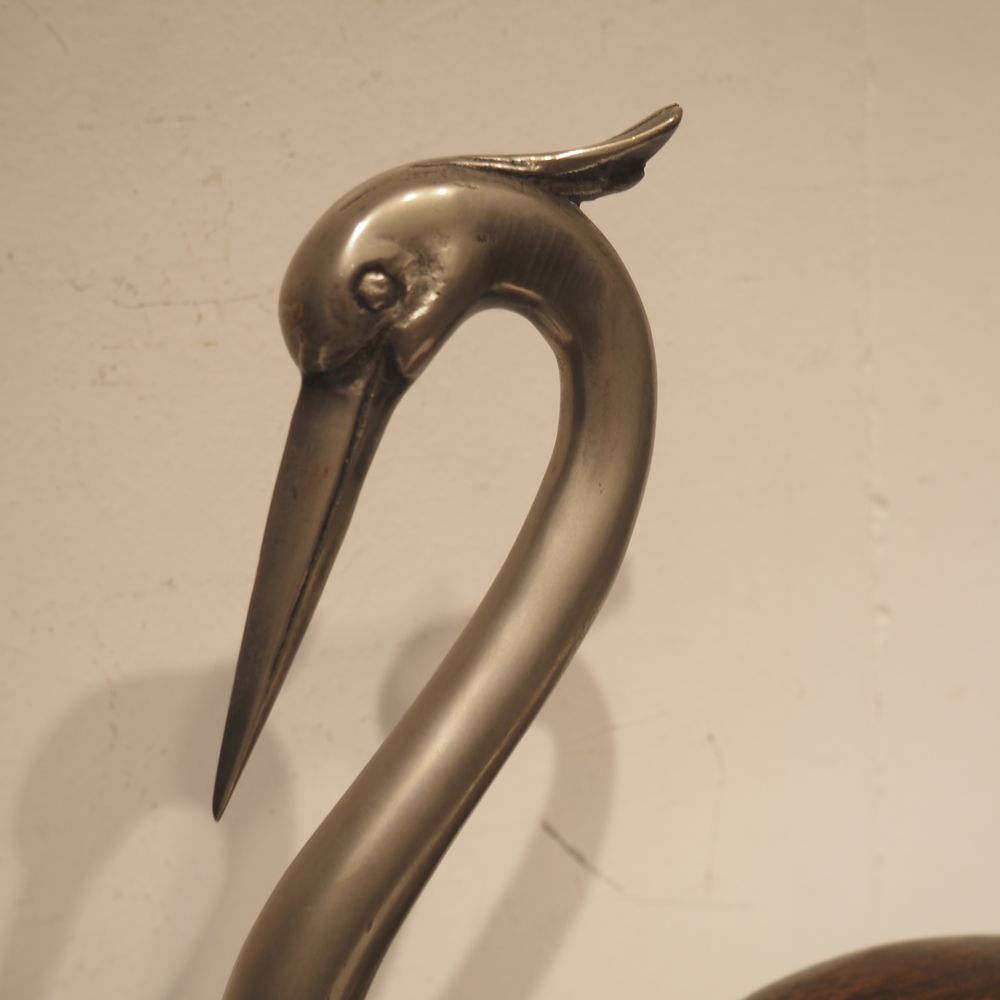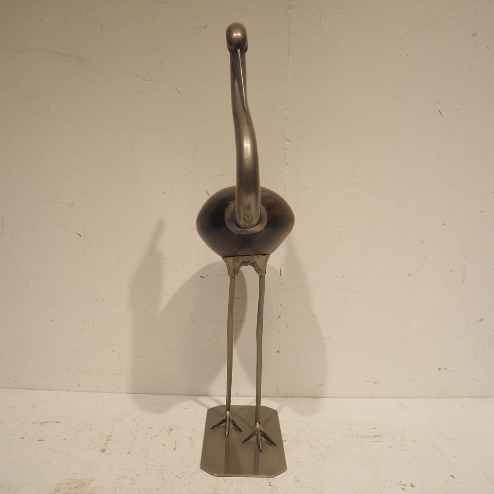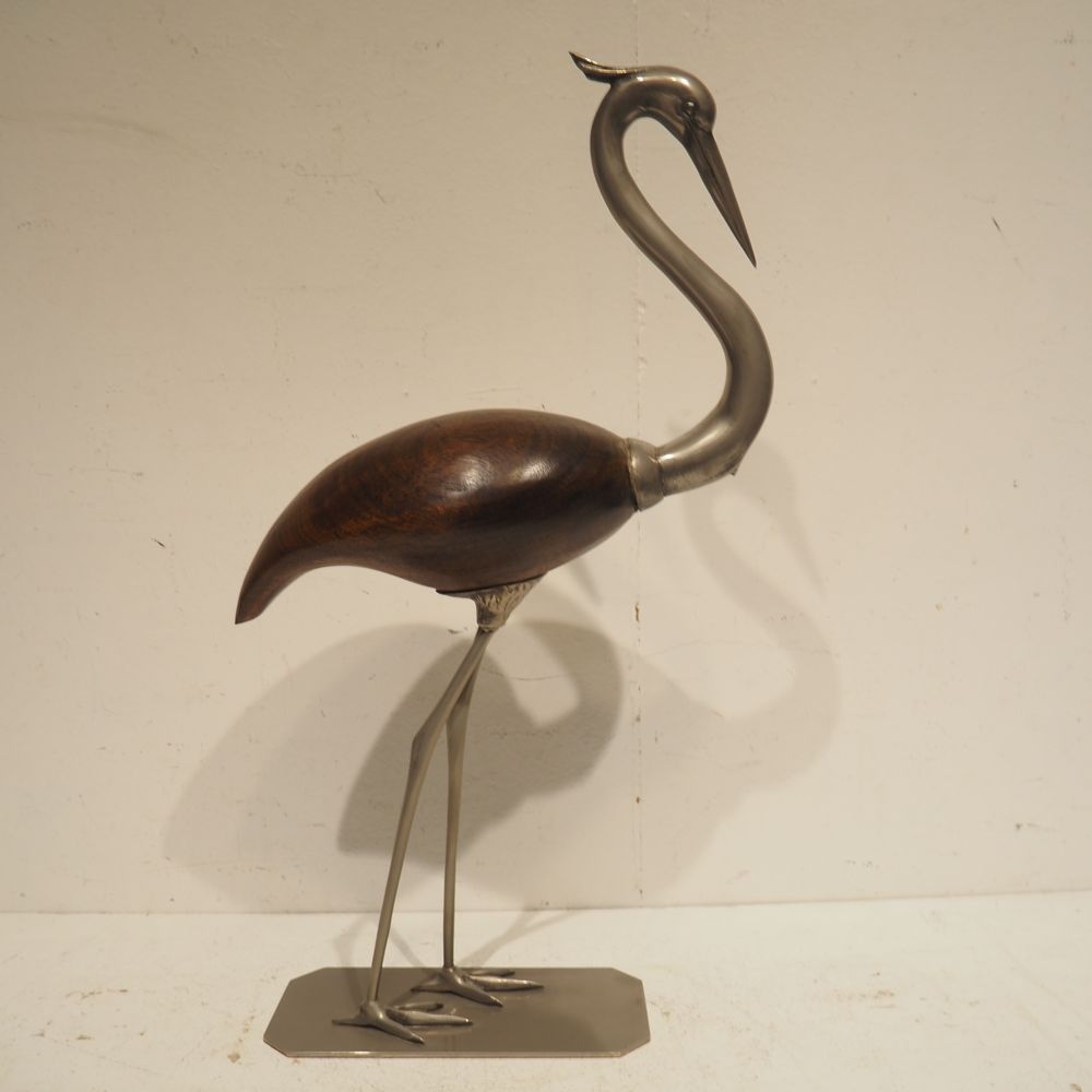 Objet de décoration vers 1970 : Héron, bois et métal, H: 65, L: 31, P: 14 cm