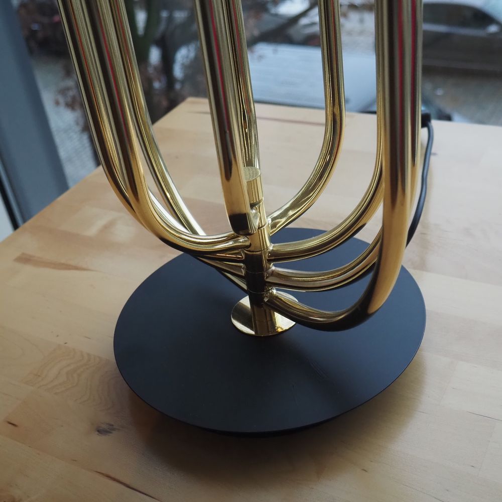 Lampe d’ambiance vers 2020 : Métal laqué noir et tubes de laiton doré, pied disque, H: 71, diam: 31 cm
