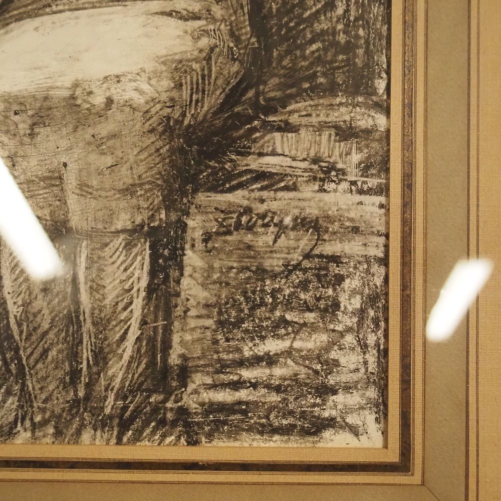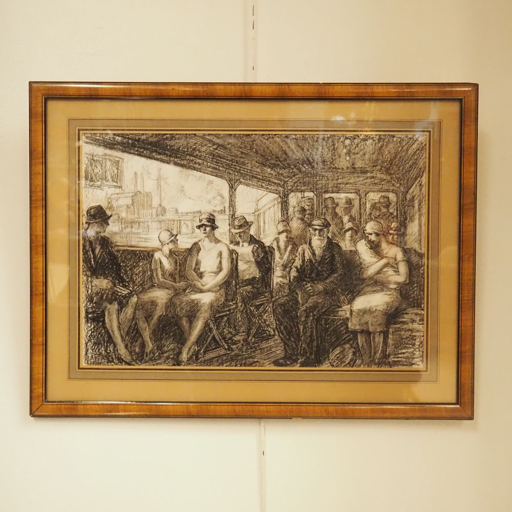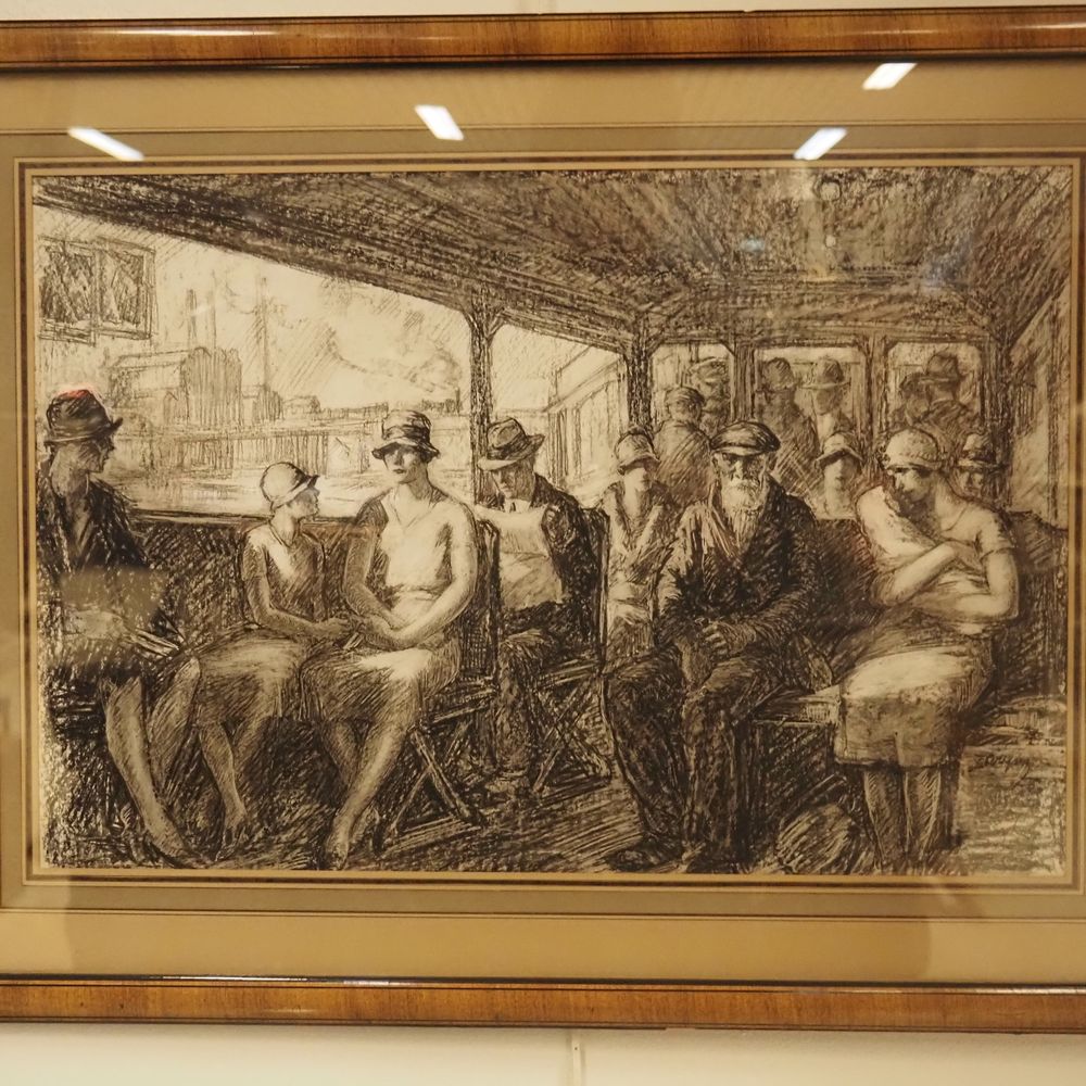 Désiré Piryns 1889 / 1948 : Dessin au fusain, voyageurs du matin dans un tram, signé à droite dim : 34 x 50 cm