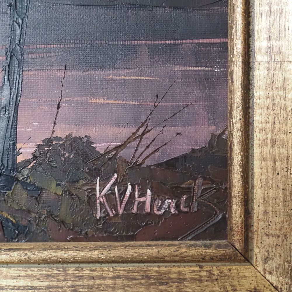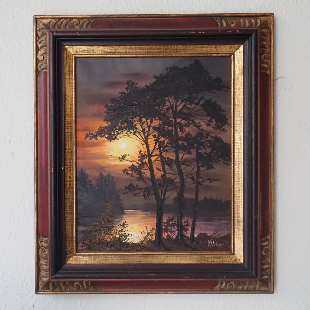 KV Herck : Huile sur toile, vue lacustre au coucher du soleil, signée en bas à droite, dim: 50 x 40 cm