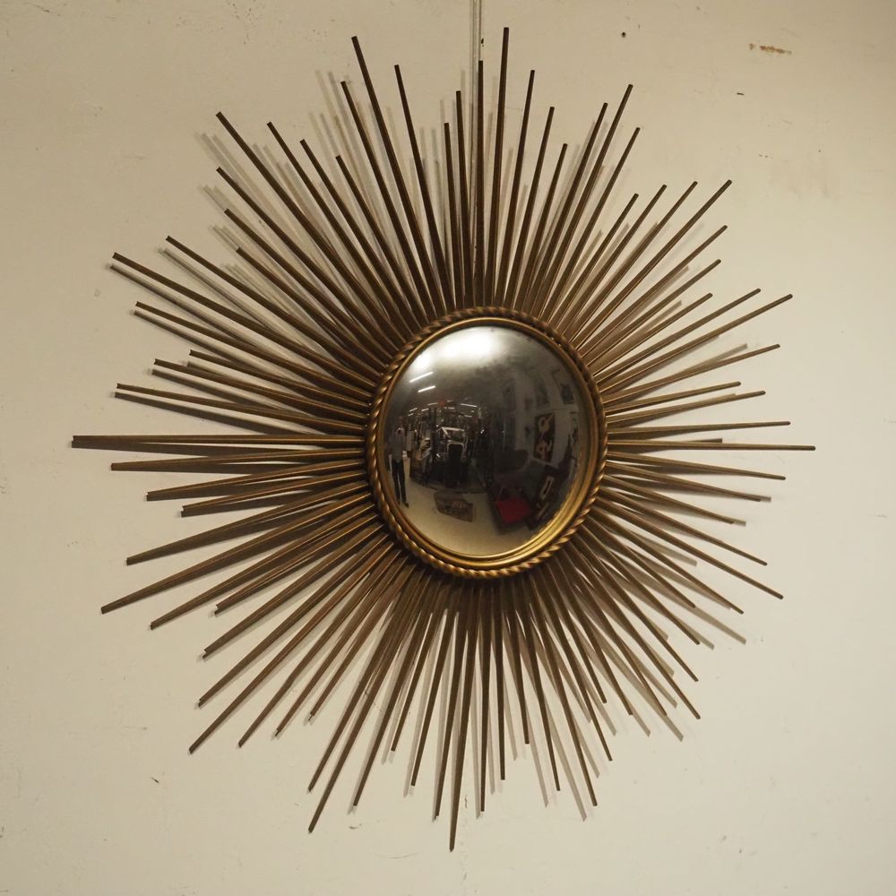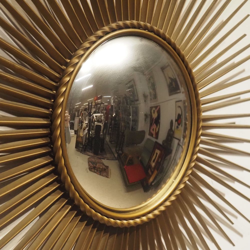 Chatty Vallauris : Miroir soleil vers 1950, verre convexe mercurisé, encadrement en fer forgé à patine dorée, bel état d’origine, estampillé Chatty Vallauris au dos, diam: 82 cm