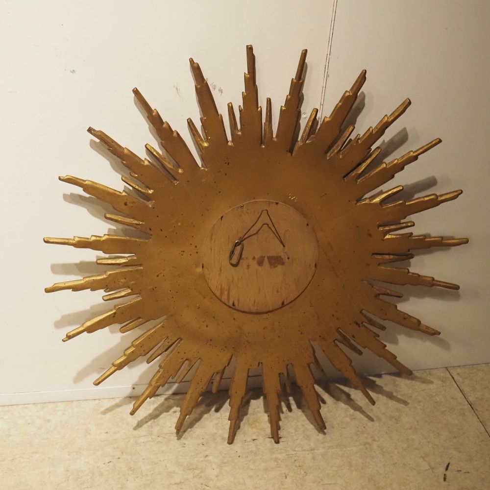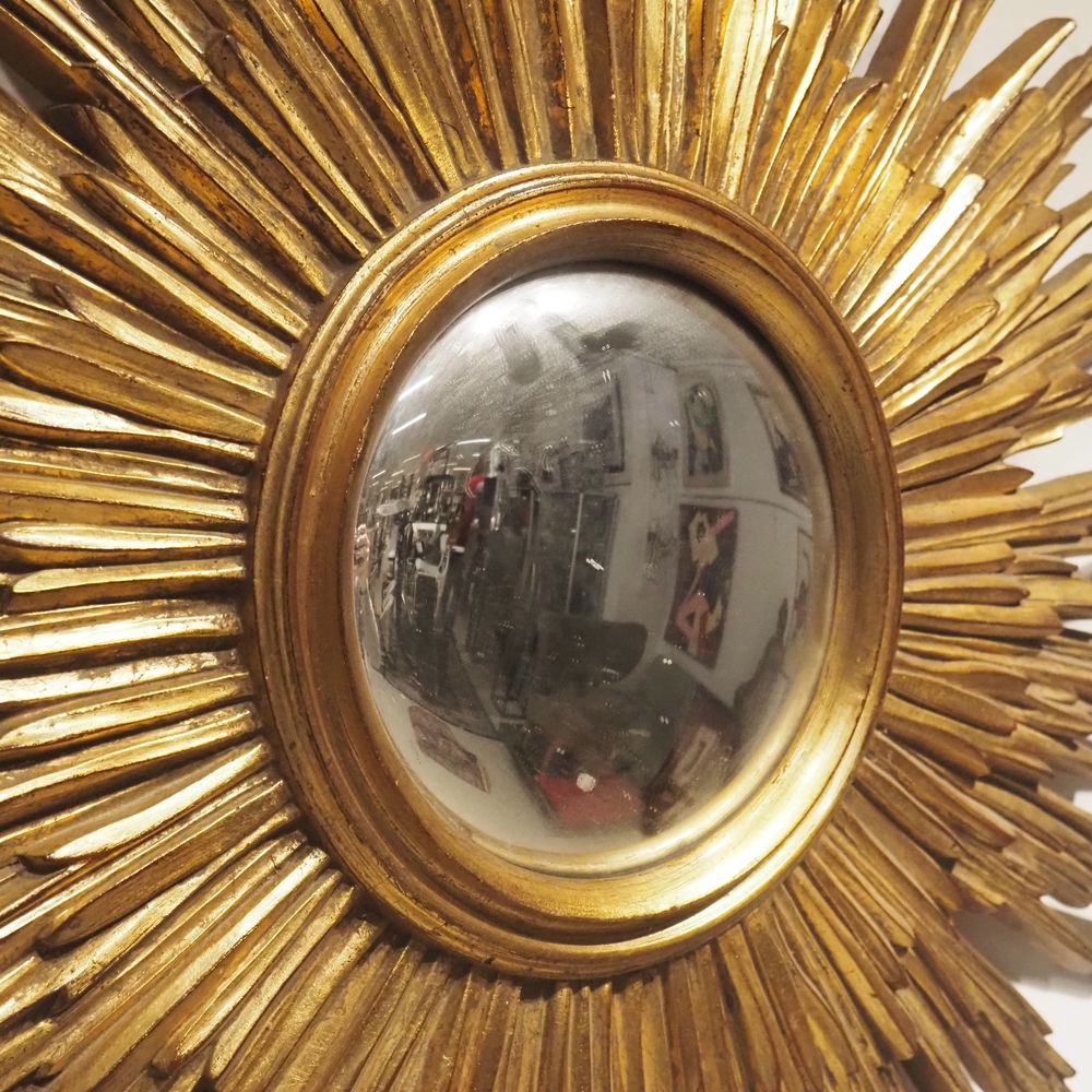 Miroir Soleil vers 1970 : Verre convexe mercurisé, encadrement en résine patinée dorée, parfait état d’origine, diam: 79 cm