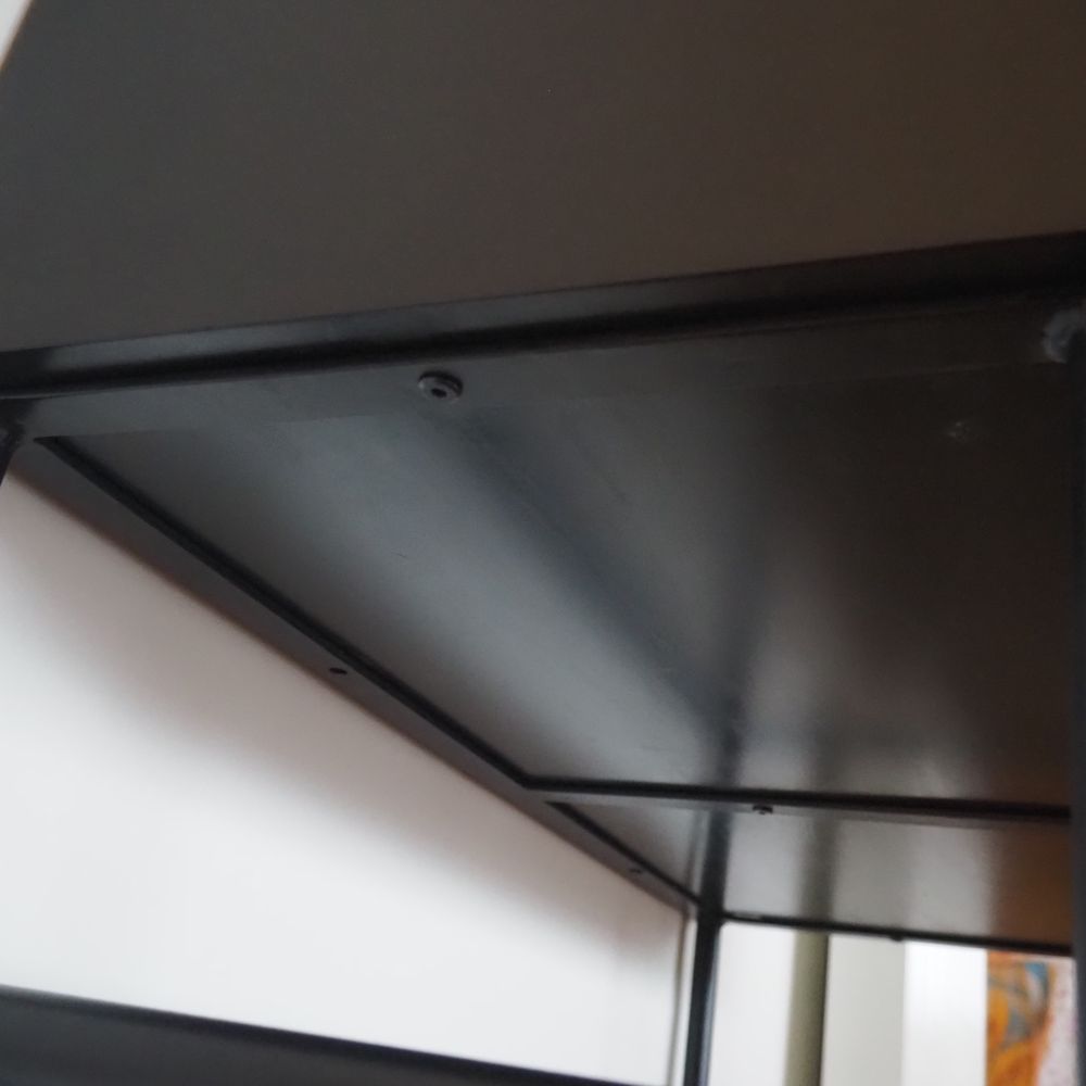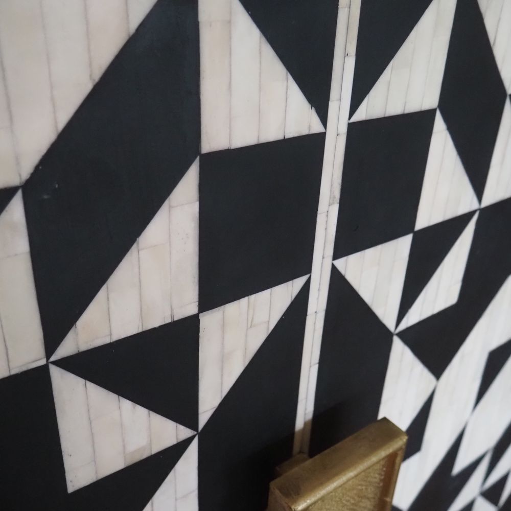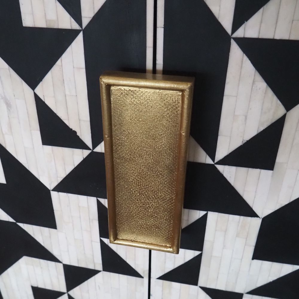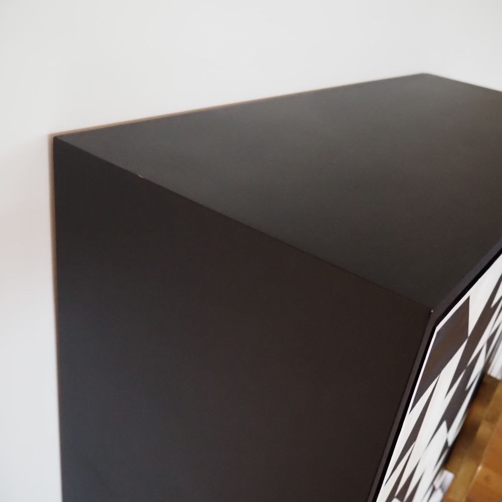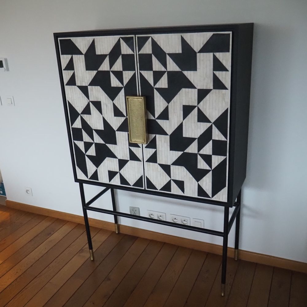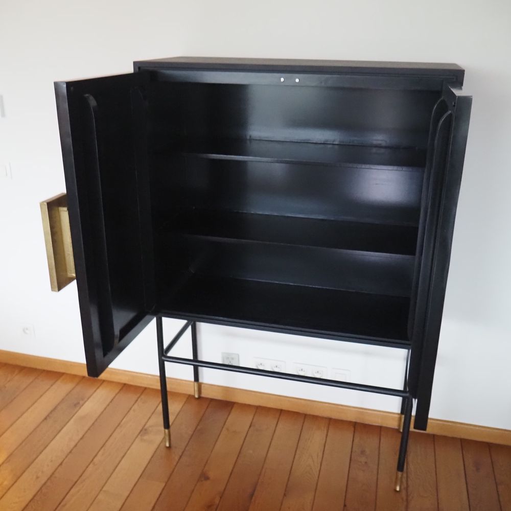 Cabinet vers 2020 : Bois laqué noir, 2 portes avec marqueterie d’os, poignées métal doré, posé sur un piétement quadripode en tube d’acier laqué noir, sabots de laiton, H: 151, L: 100, P: 40 cm