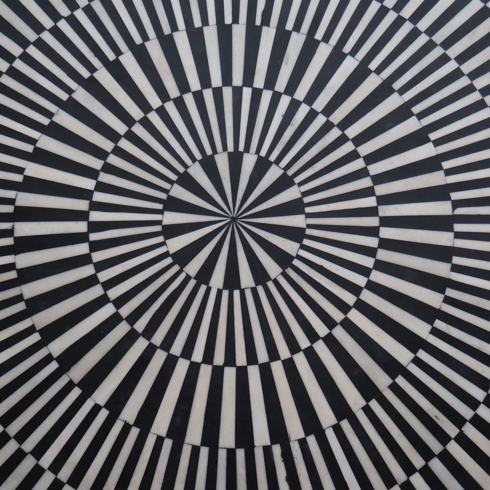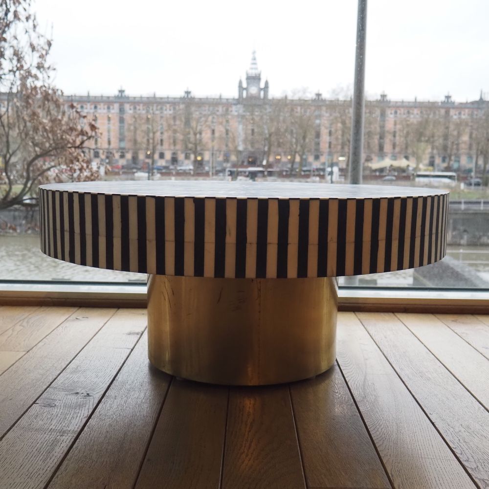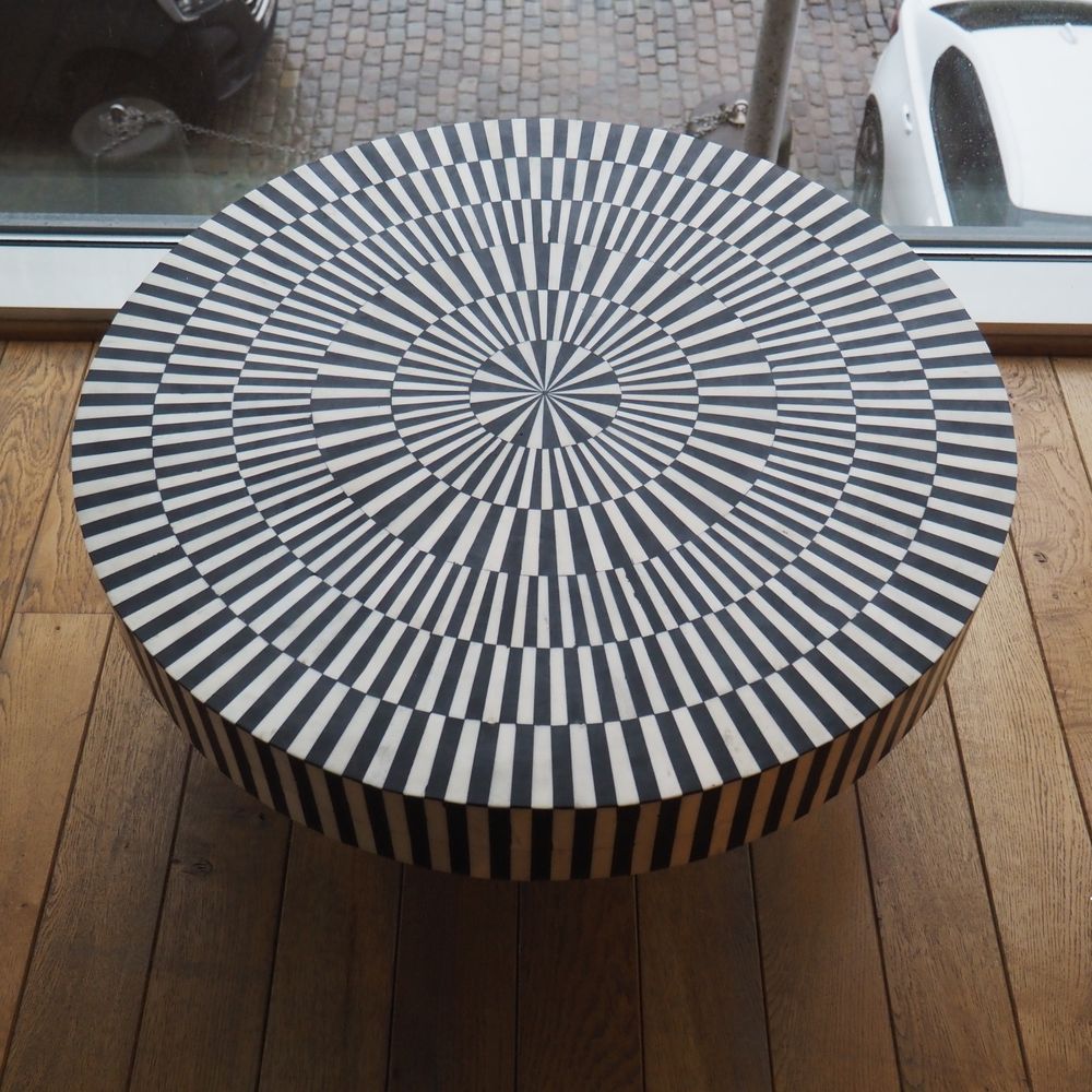 Table basse vers 2020 : Bois, laiton et os, plateau circulaire, H: 36, diam: 81 cm