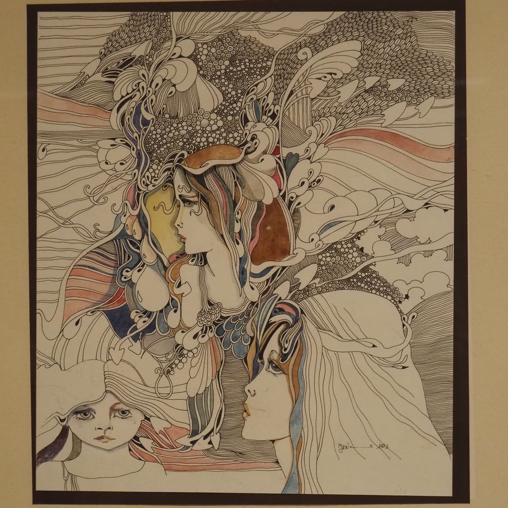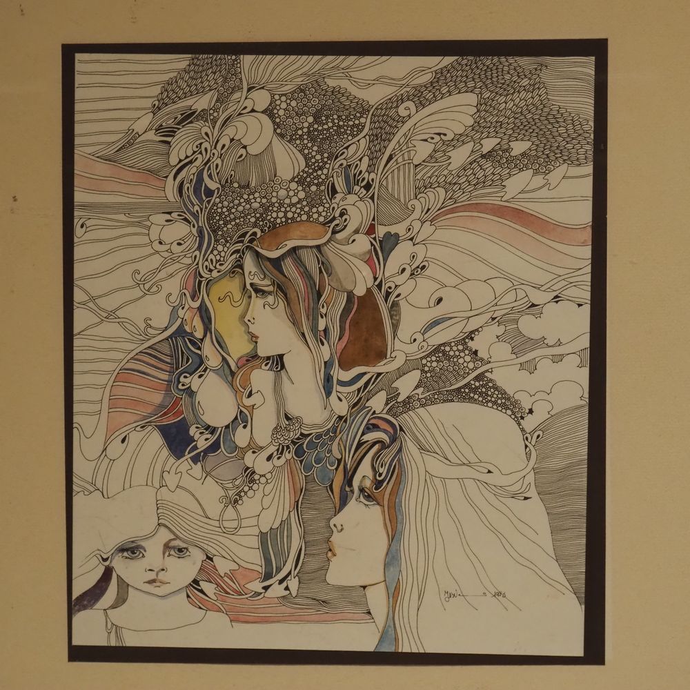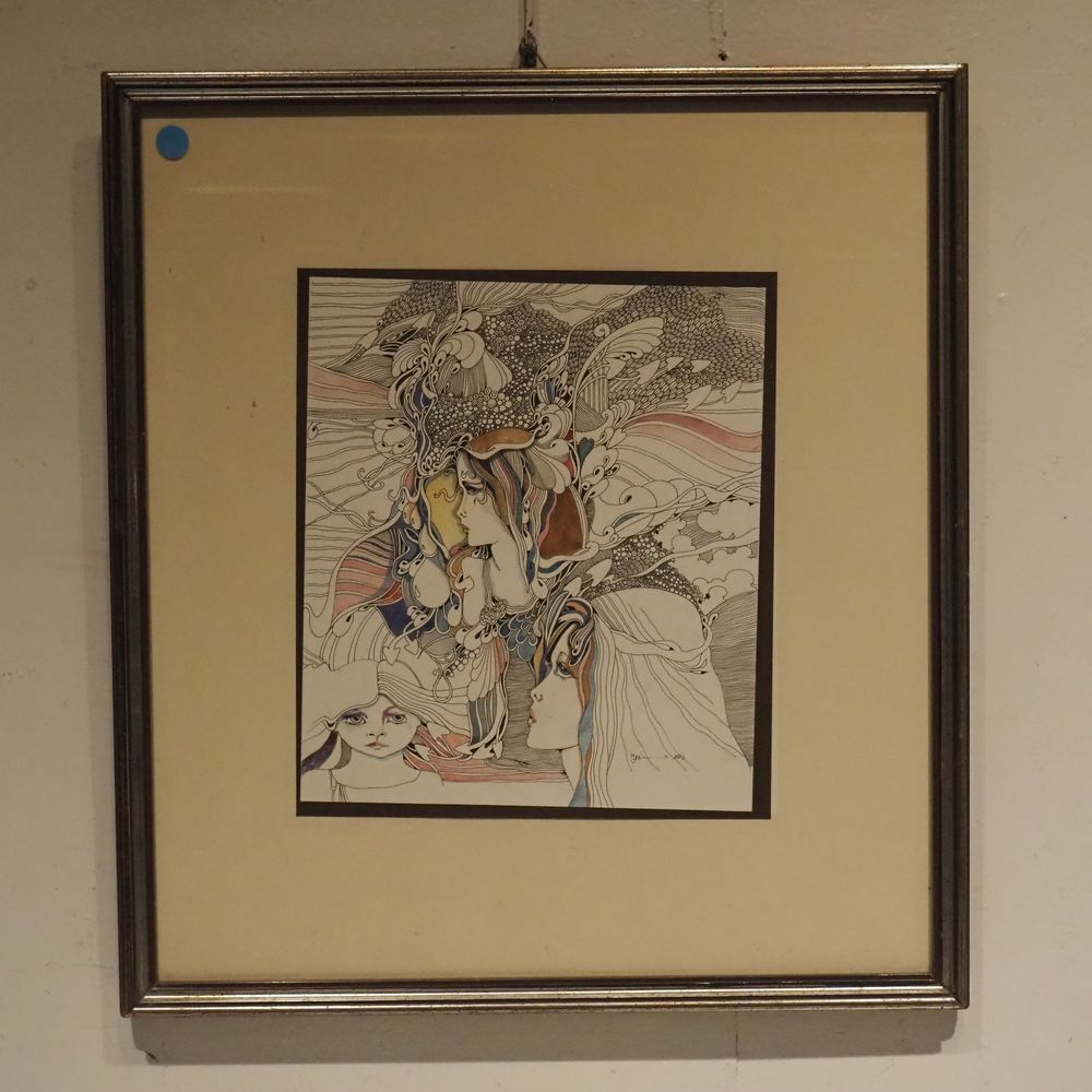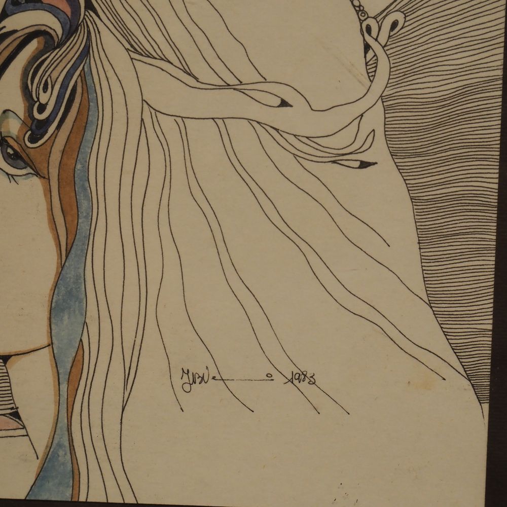 JBV ? : Technique mixte, encre de chine et aquarelle, portraits vu de profil, signée en bas à droite, datée 1983, dim: 28,7 x 25,2 cm