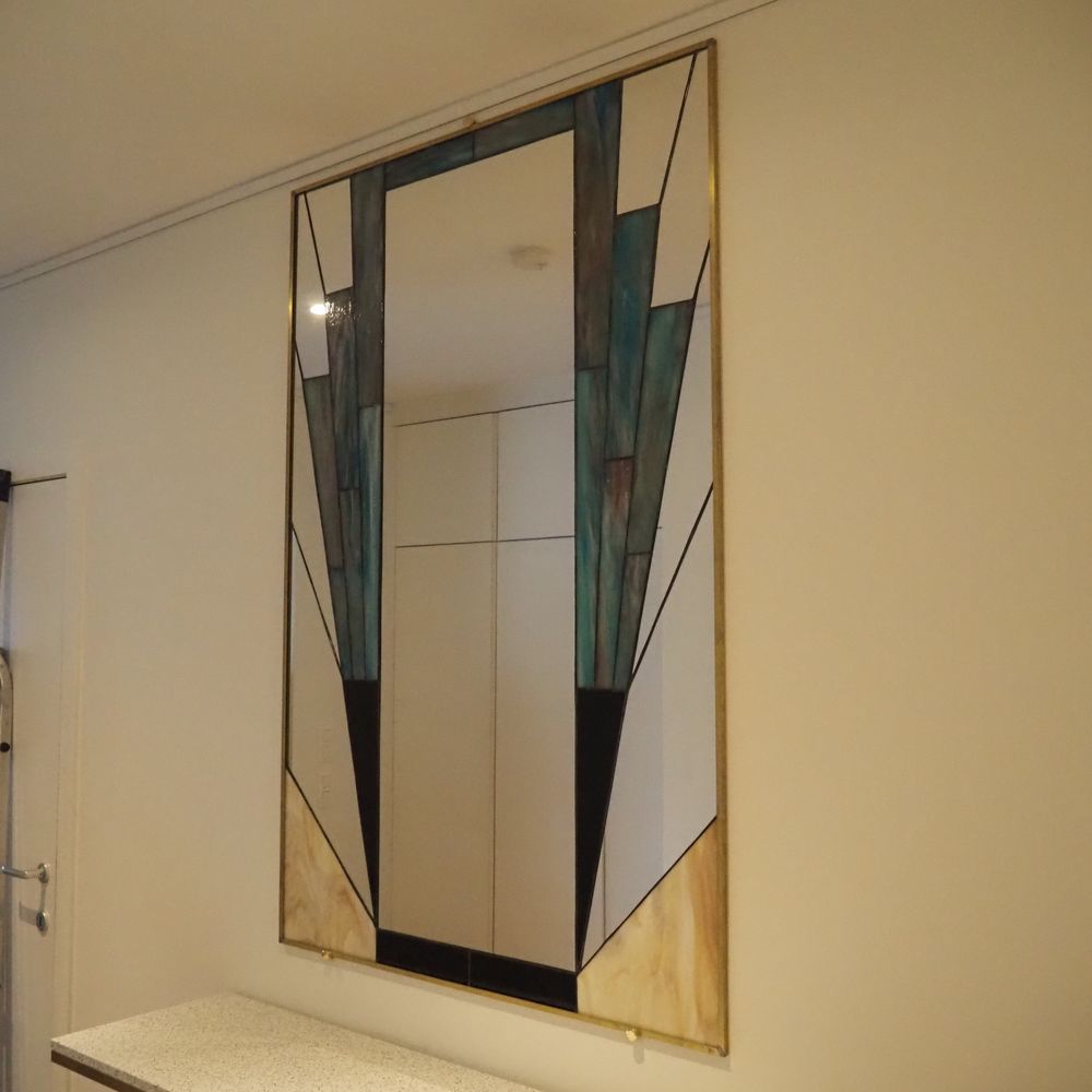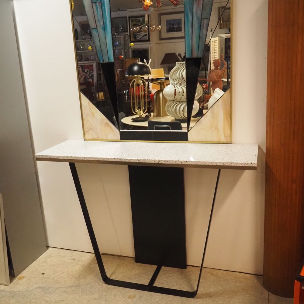 Console avec miroir style 1900 vers 2020 : Plateau en pierre reconstituée, posé sur un bati en acier cintré laqué noir, H: 91, L: 130, P: 38 cm, miroir avec vitraux, dim: 151 x 101 cm