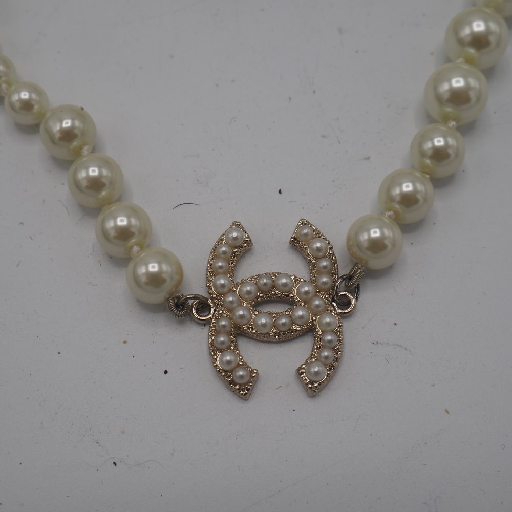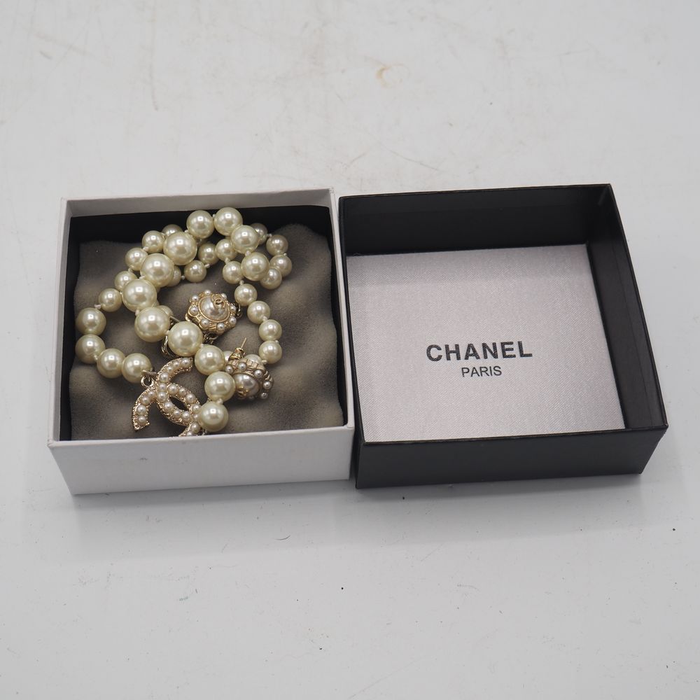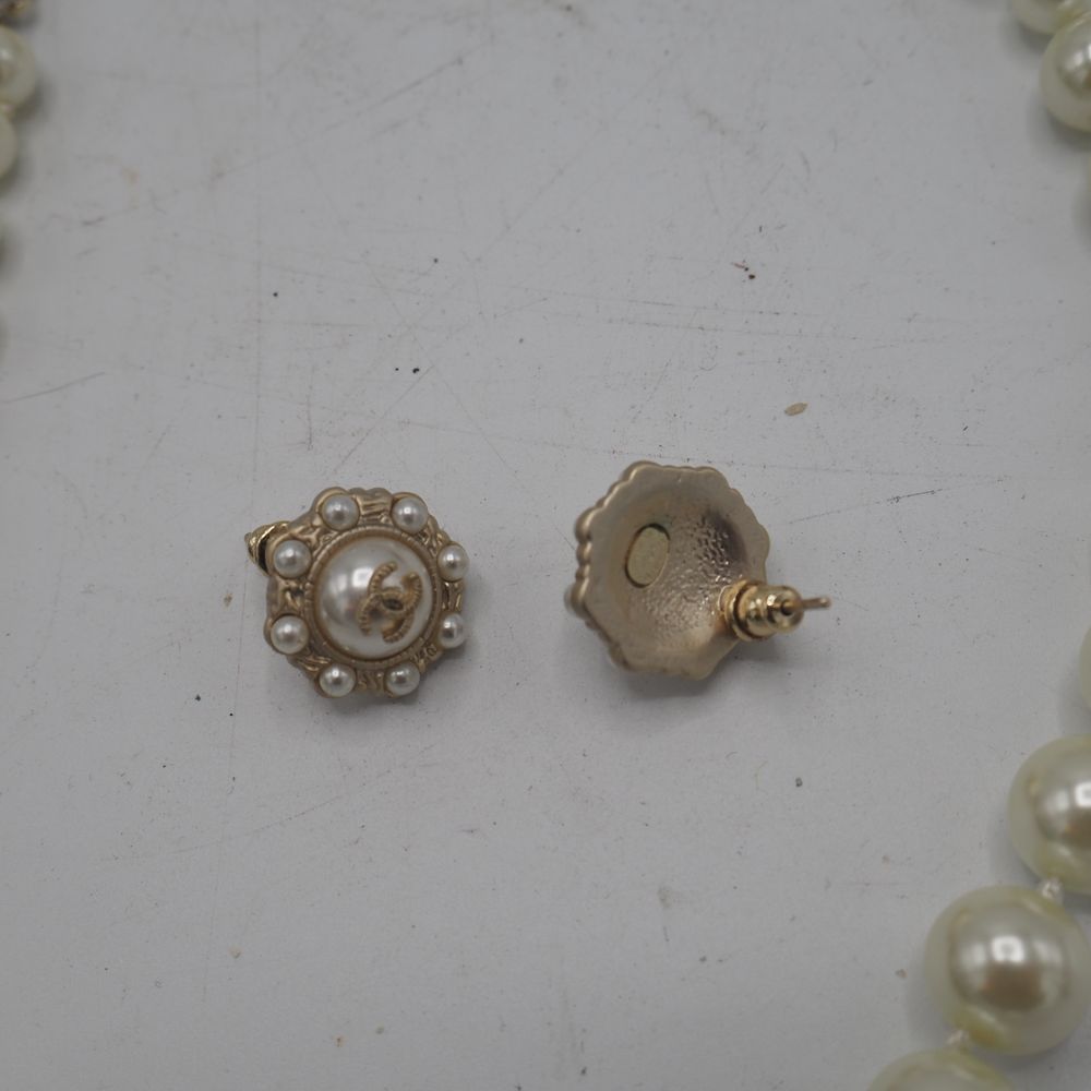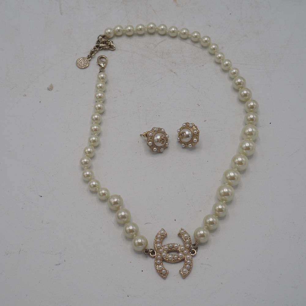 Chanel : Parure composée d’un collier et une paire de boucle d’oreilles, perles nacrées, estampillée et double C, L: 50 cm
