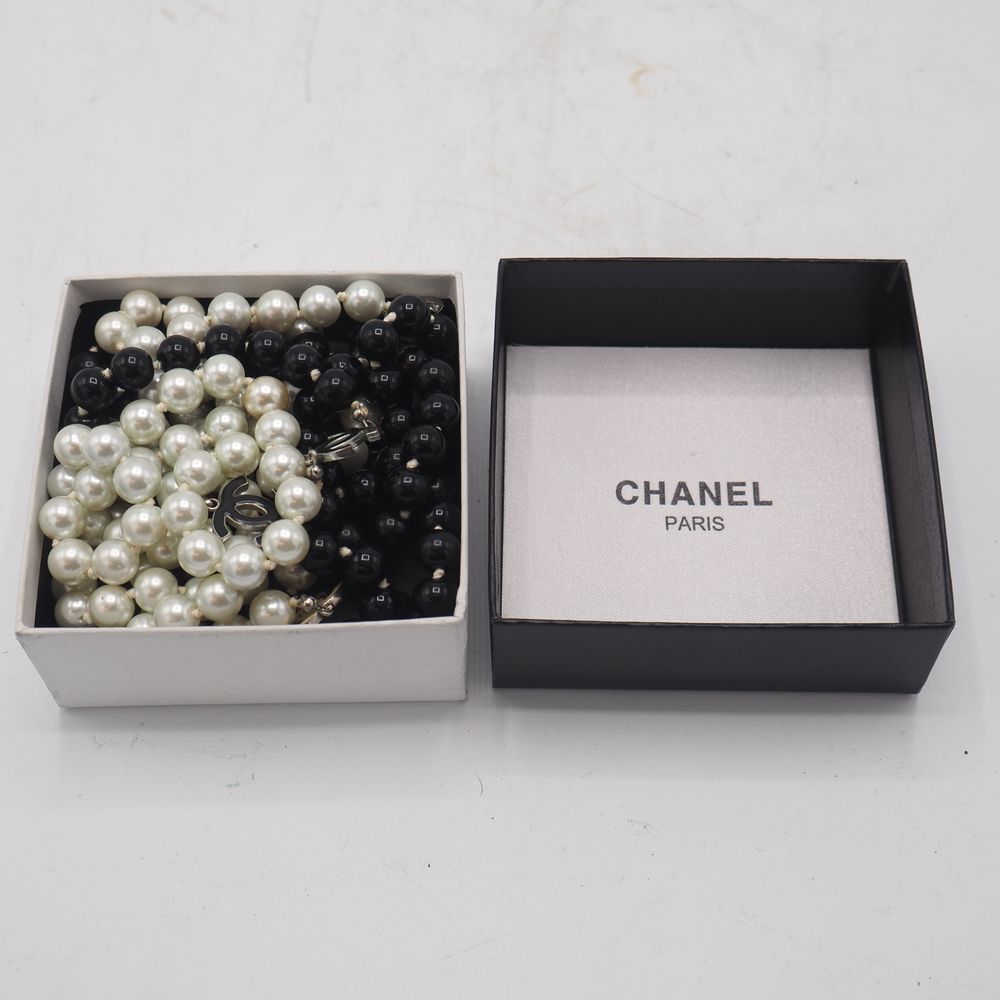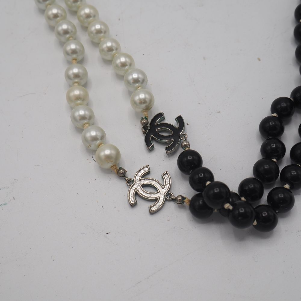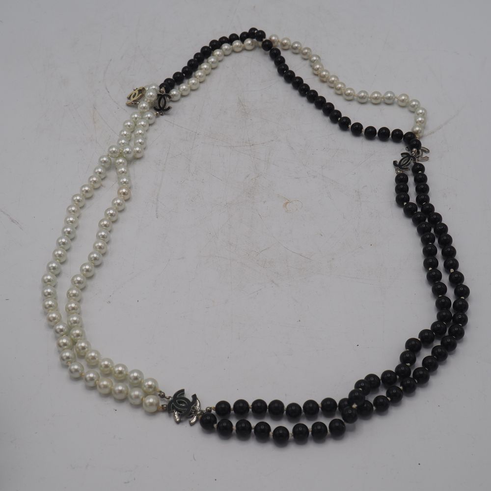 Chanel : Sautoir de perles nacrées et noires, estampillé Chanel + 6 doubles C, L totale: 220 cm