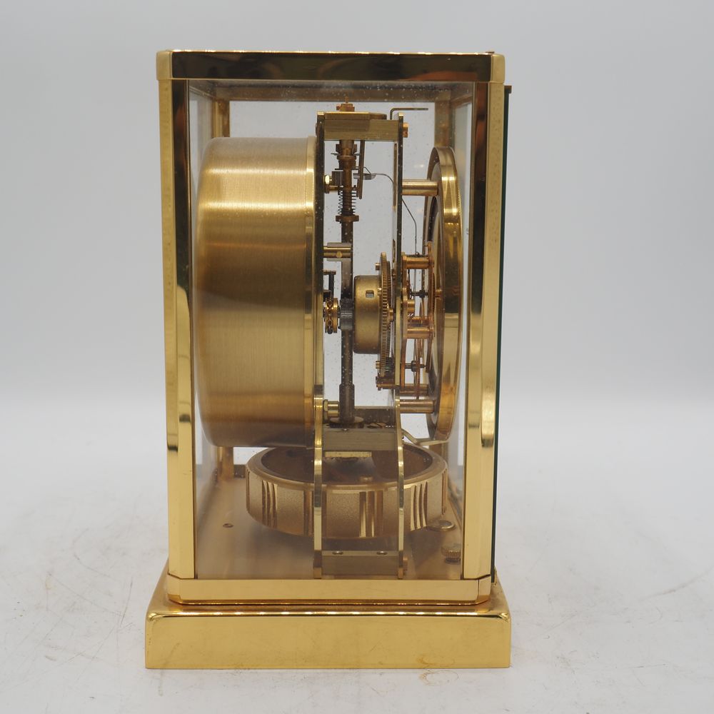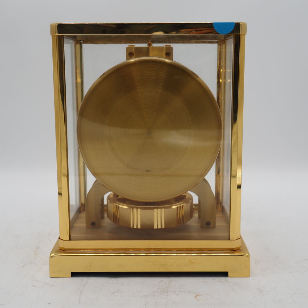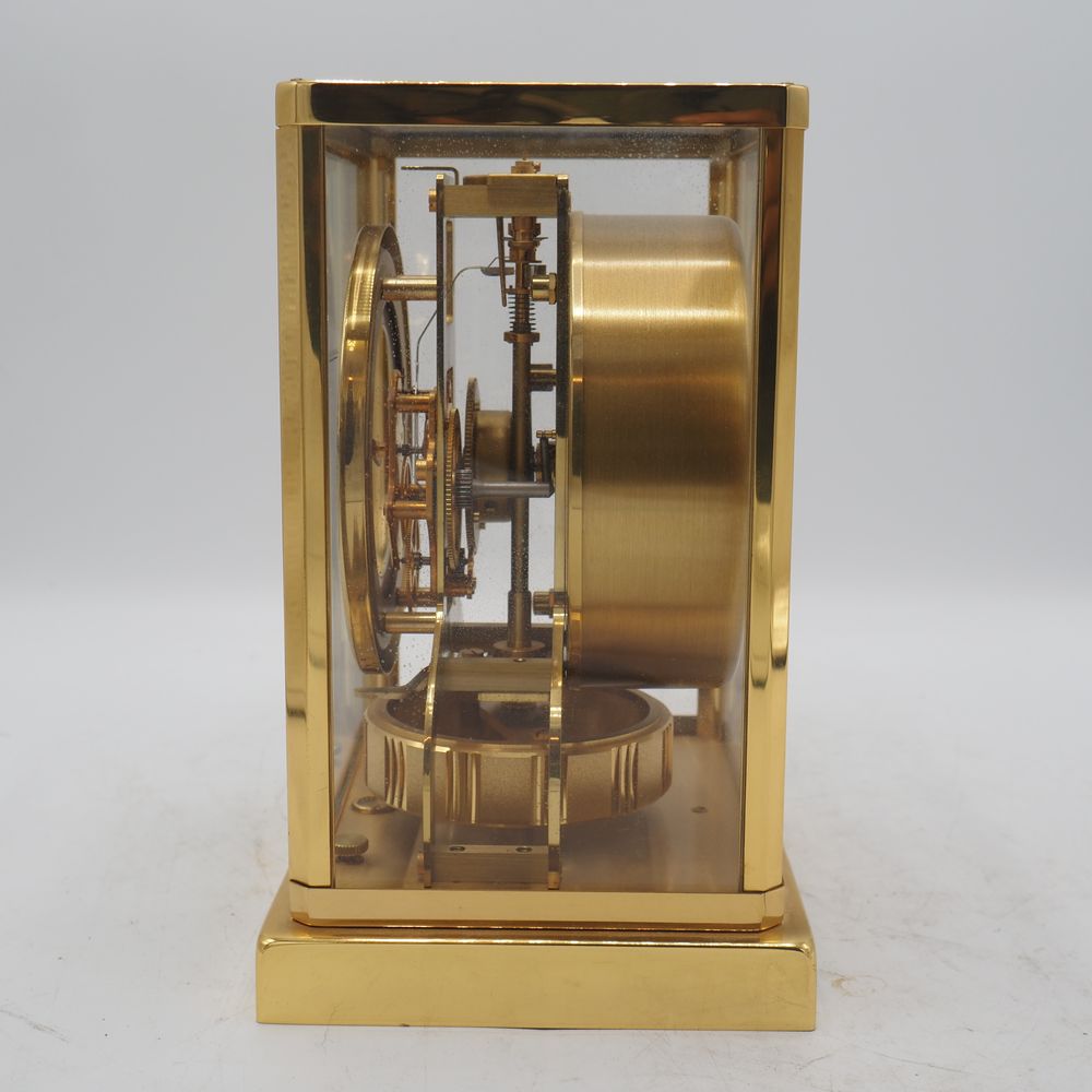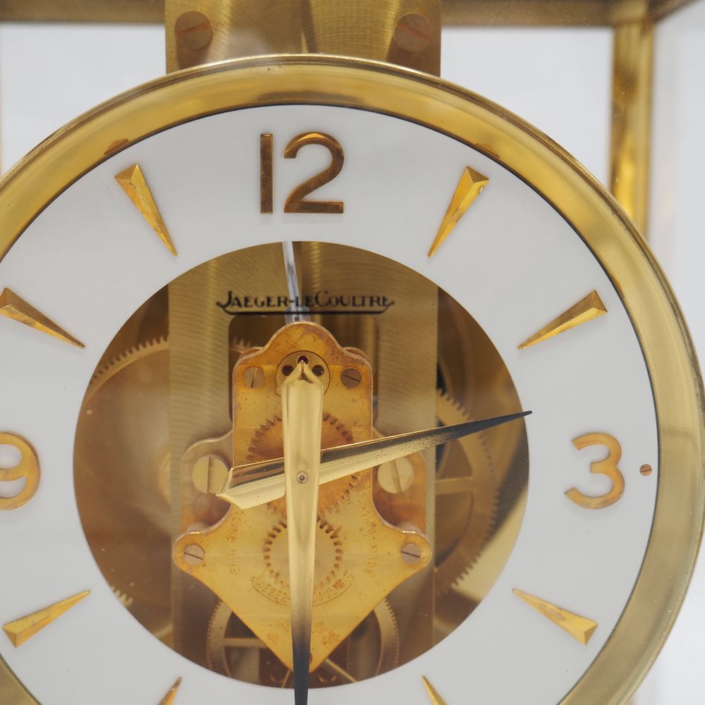 Jaeger Lecoultre : Pendule, modèle Atmos, monture en métal doré et verre clair, parfait ordre de fonctionnement, H: 22, L: 18, P: 13,5 cm (boule de poignée manquante)
