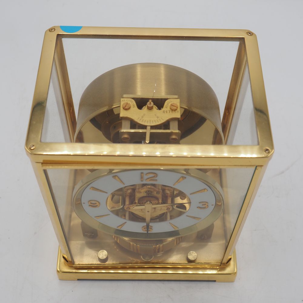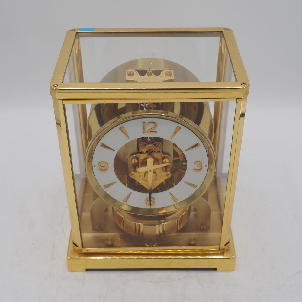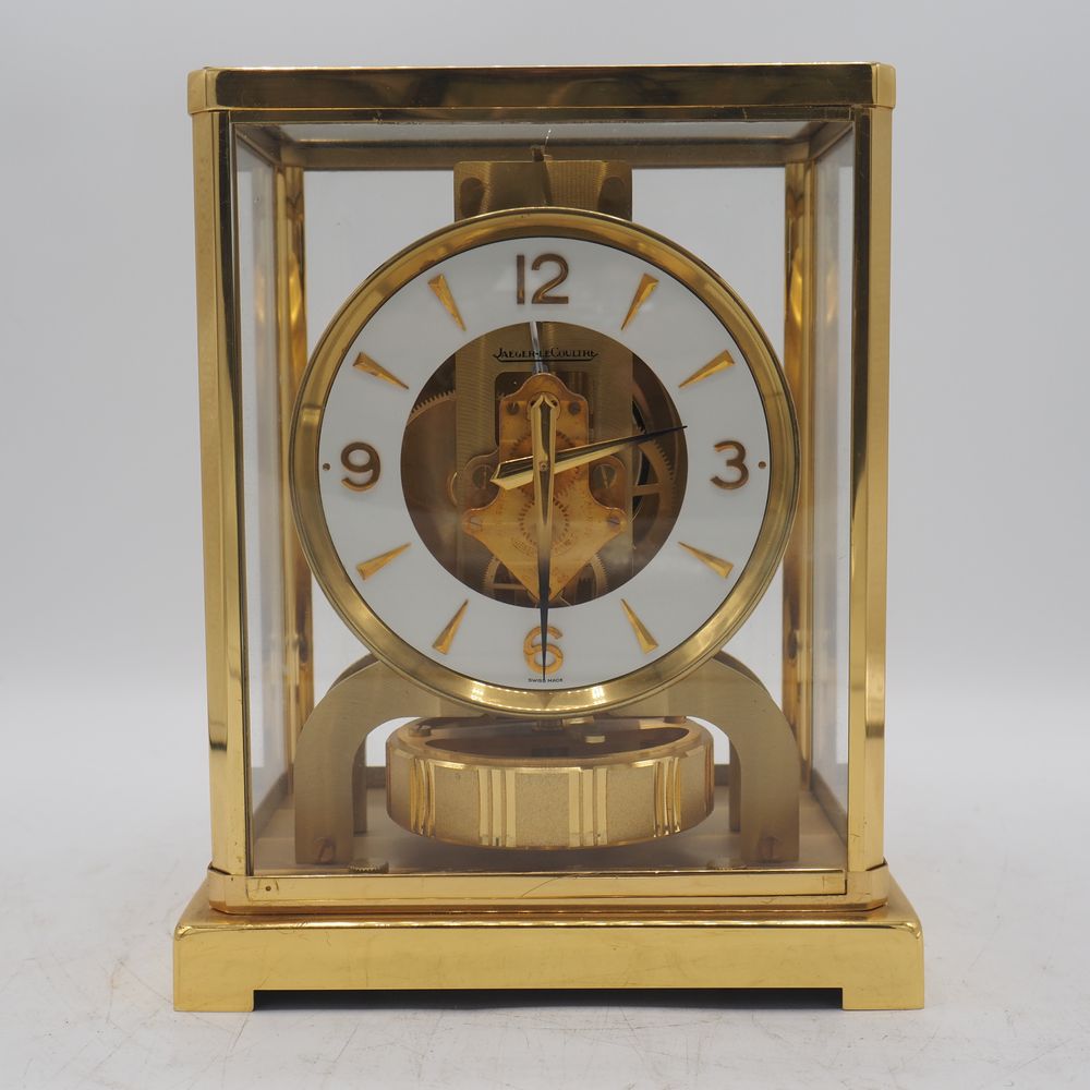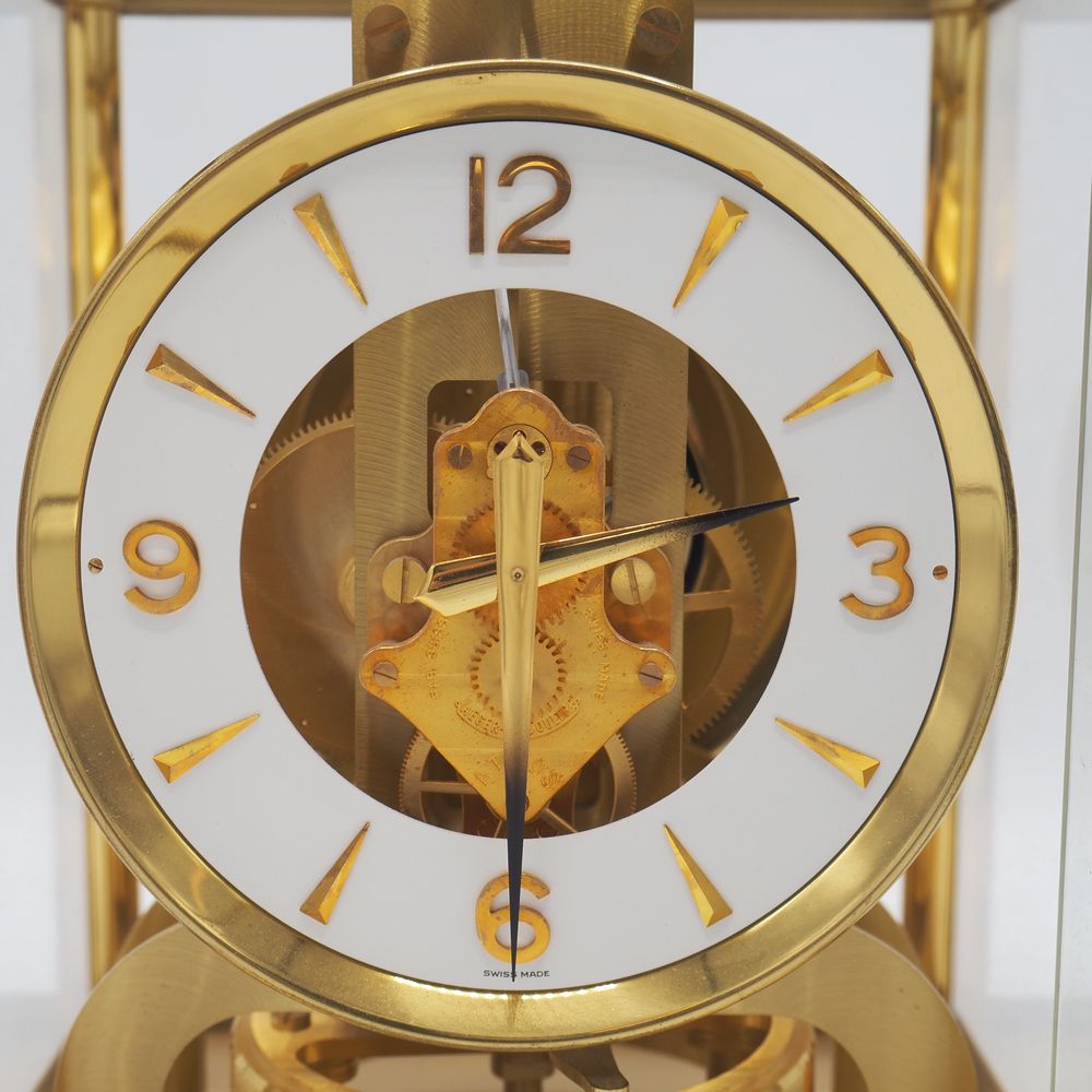 Jaeger Lecoultre : Pendule, modèle Atmos, monture en métal doré et verre clair, parfait ordre de fonctionnement, H: 22, L: 18, P: 13,5 cm (boule de poignée manquante)