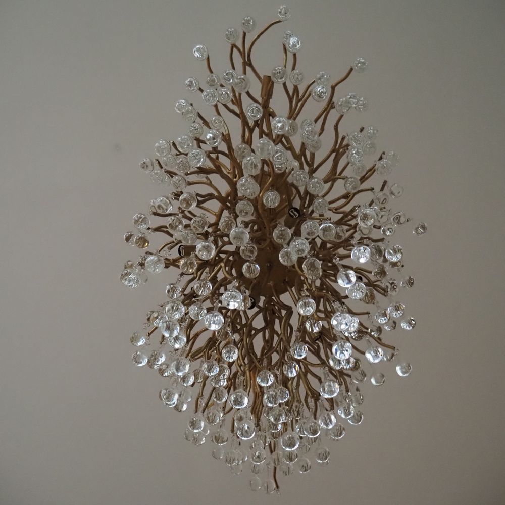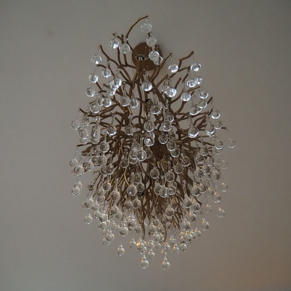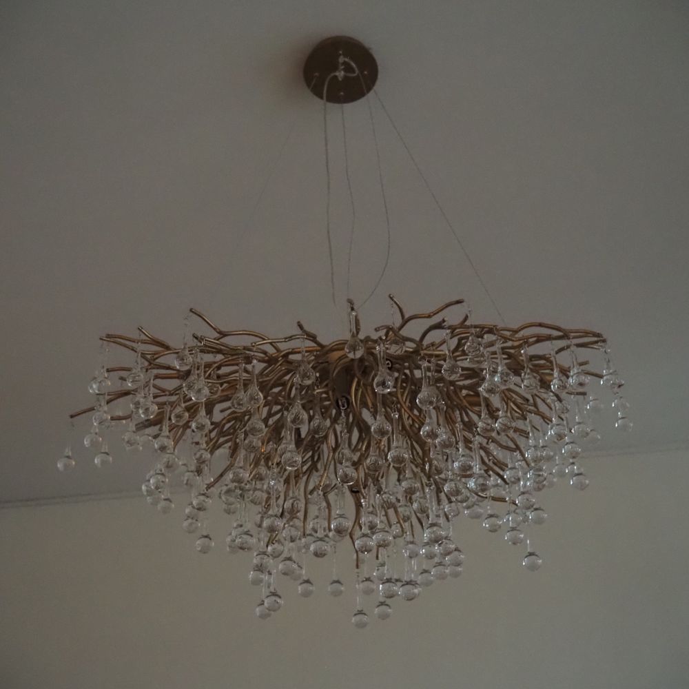 Suspension moderne 2020 : Monture en fer forgé doré et pendeloques de verre, L: 110 cm