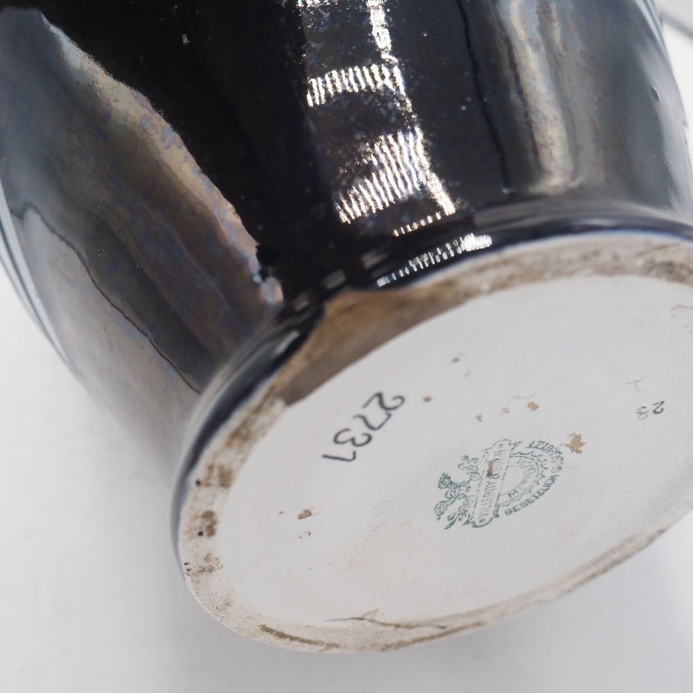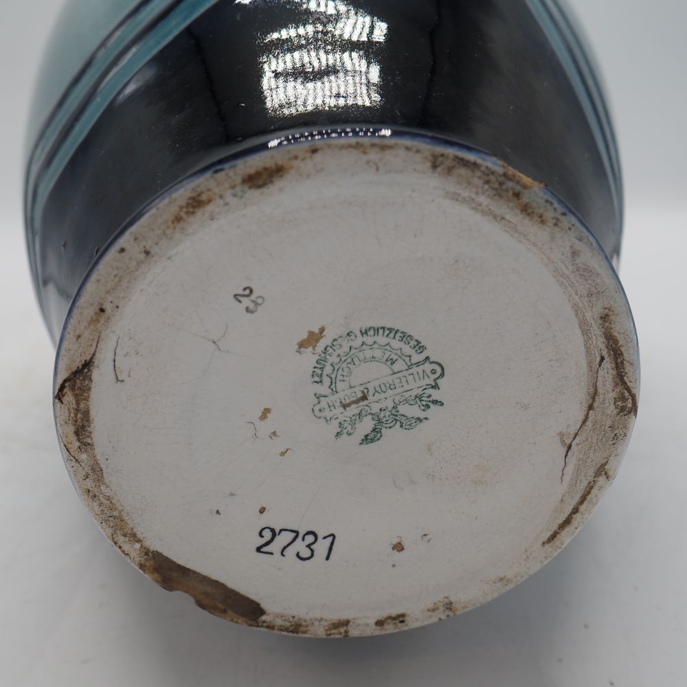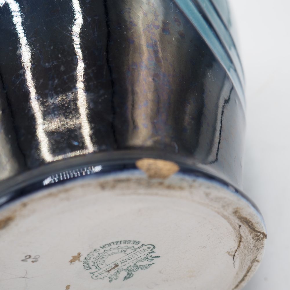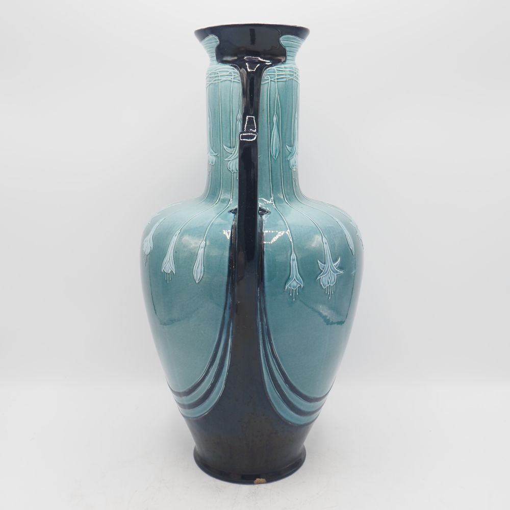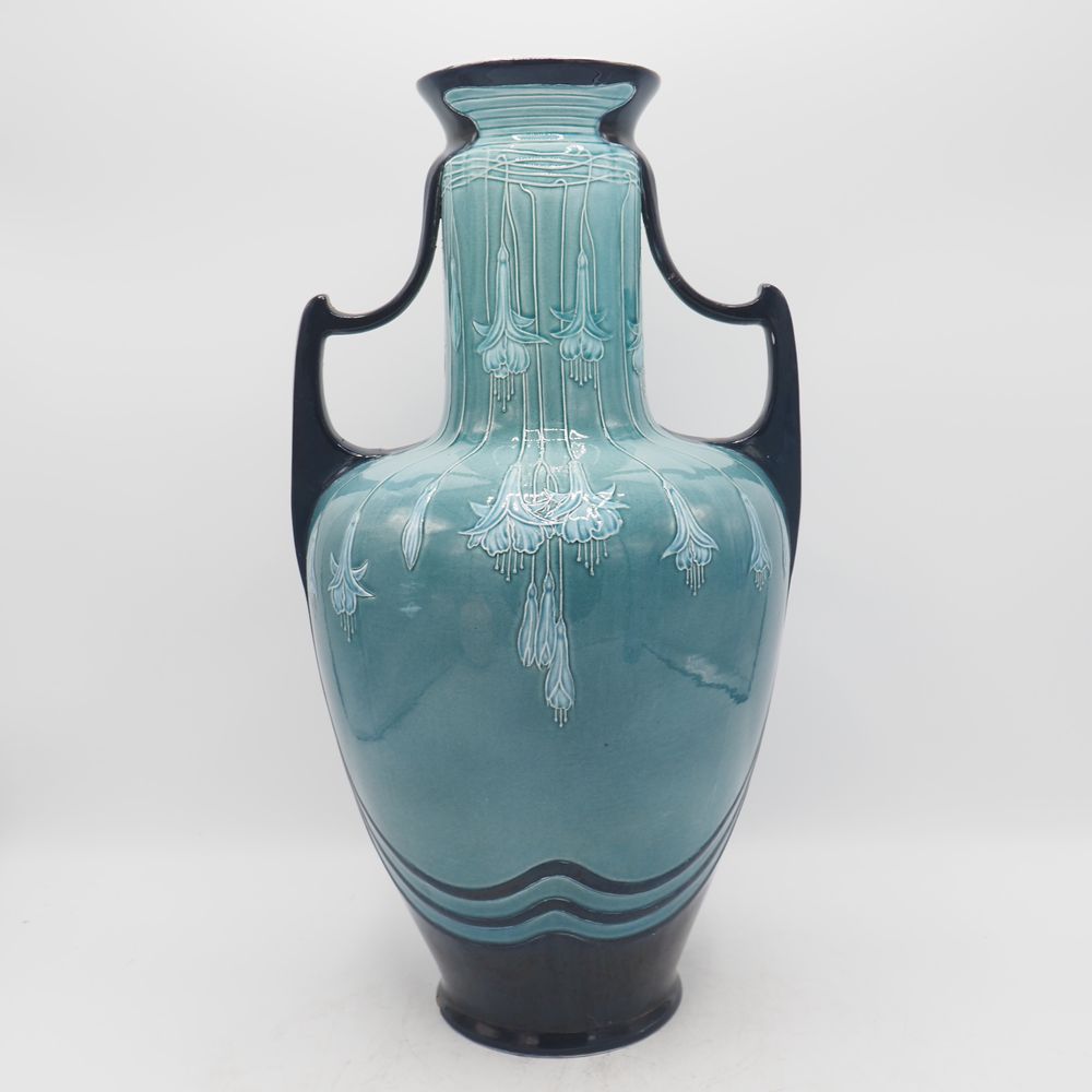 Villeroy & Boch / Mettlach : Vase 1900 Art-Nouveau, céramique émaillée turquoise et bleu nuit, décor en relief de lys, 2 anses, cachet sous la base, (éclat à la base + cheveux anse), H: 41, diam: 22 cm