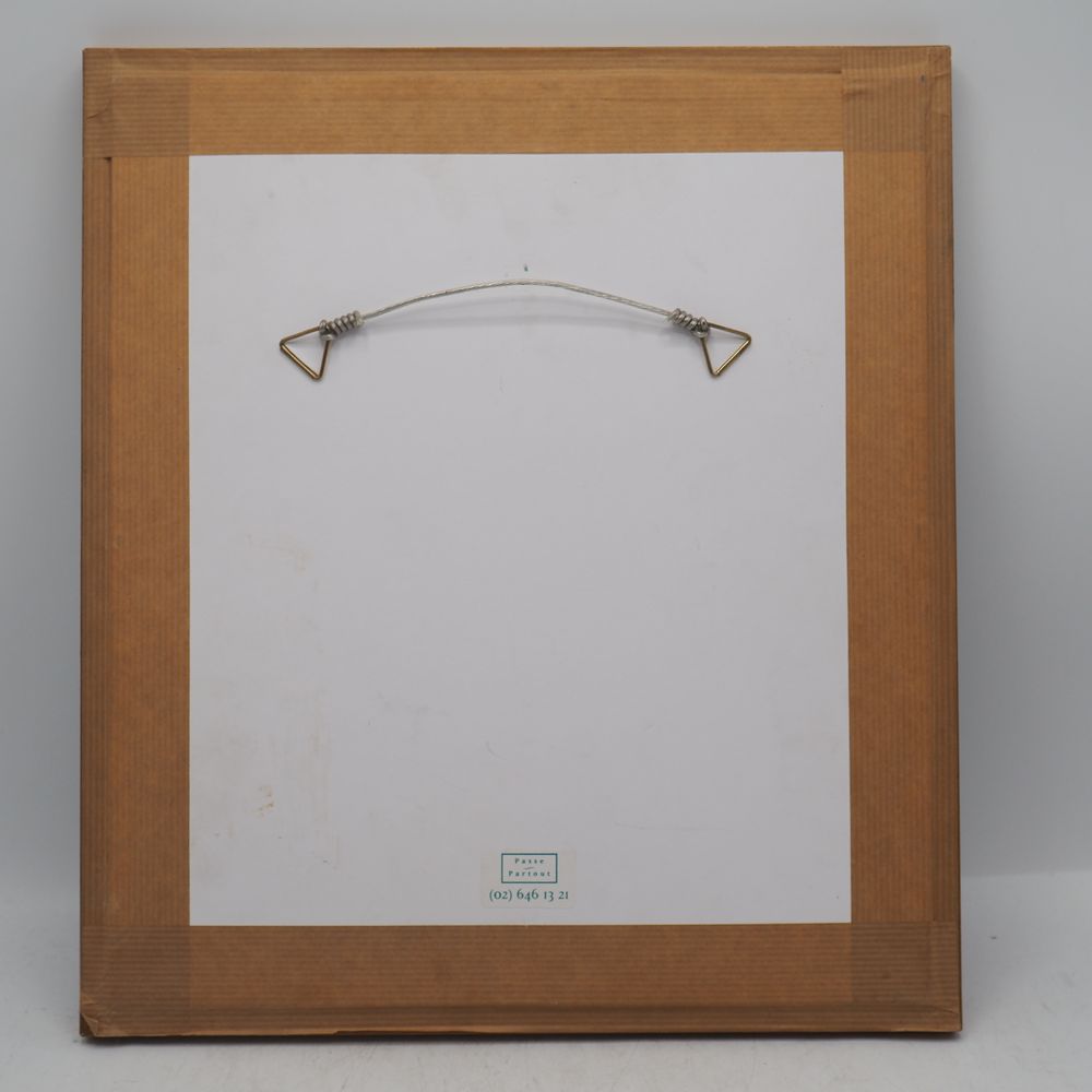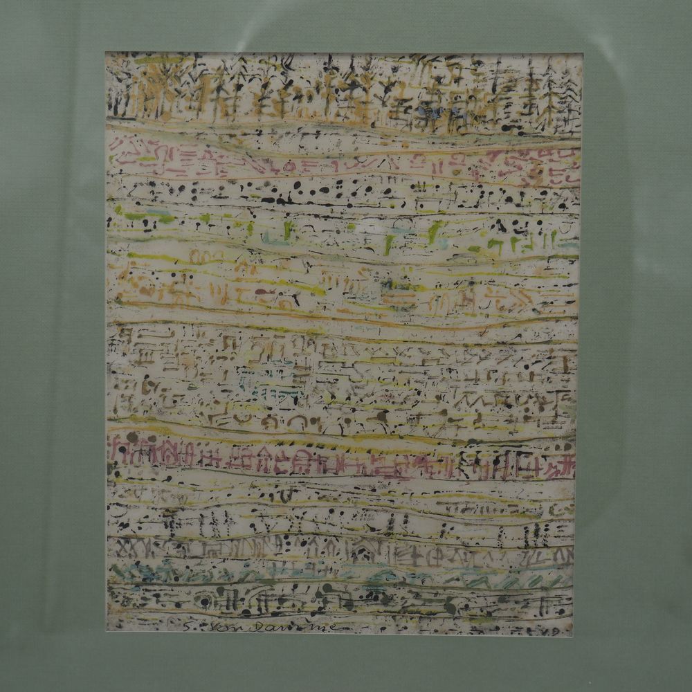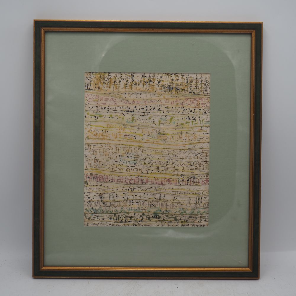 Suzanne Van Damme (1901-1986) : Technique mixte sur papier vers 1960, paysage avec maisonnette et personnage, signée en bas, encadrée sous verre, dim à vue: 21,5 x 17,5 cm
