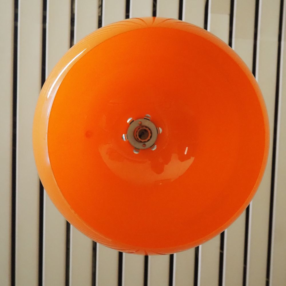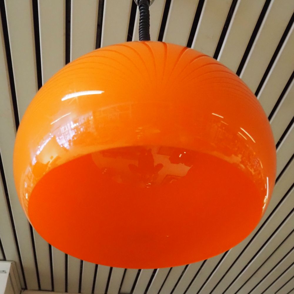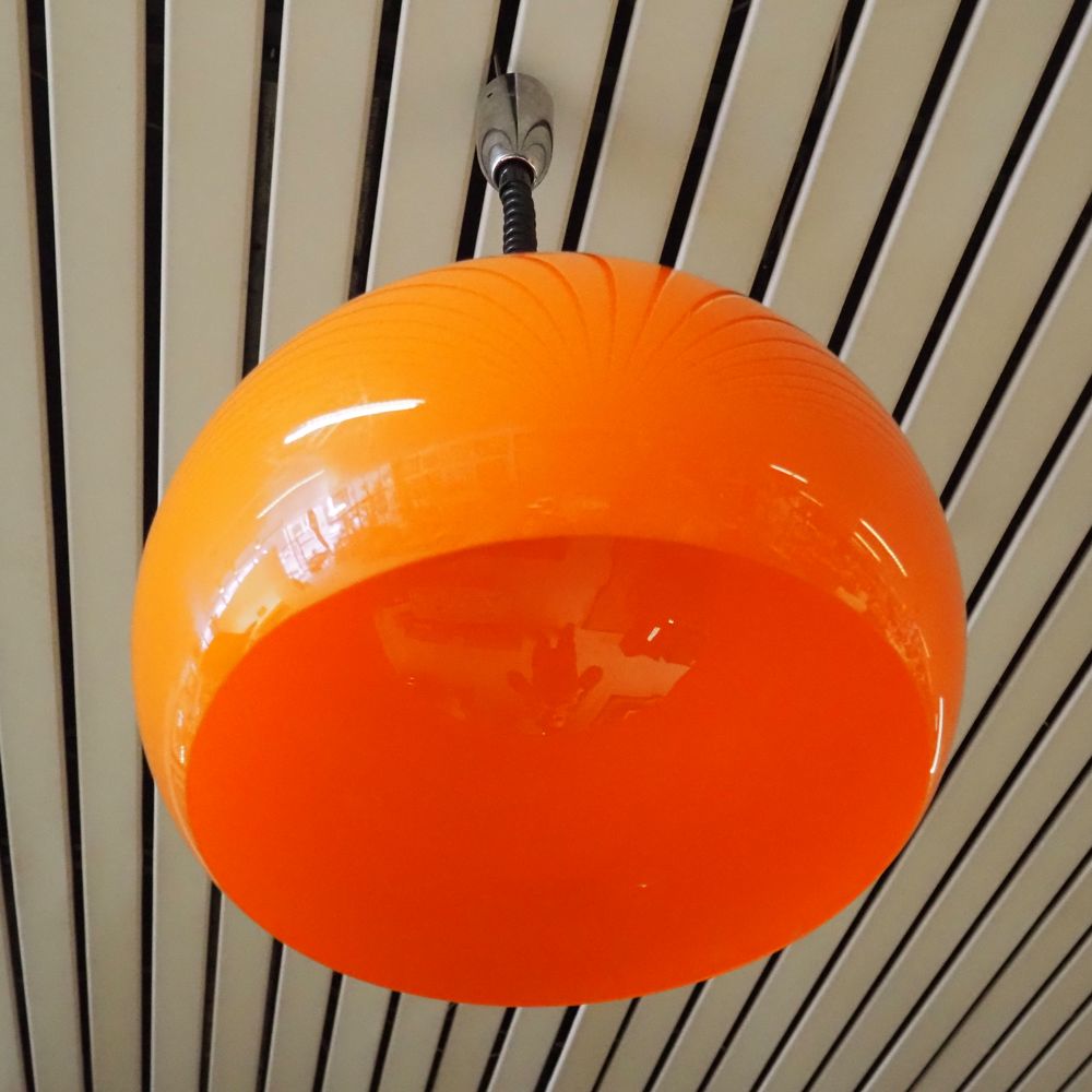 Guzzini Attribué : Suspension globulaire vers 1970, fil extensible, plastique orange diam: 40 cm