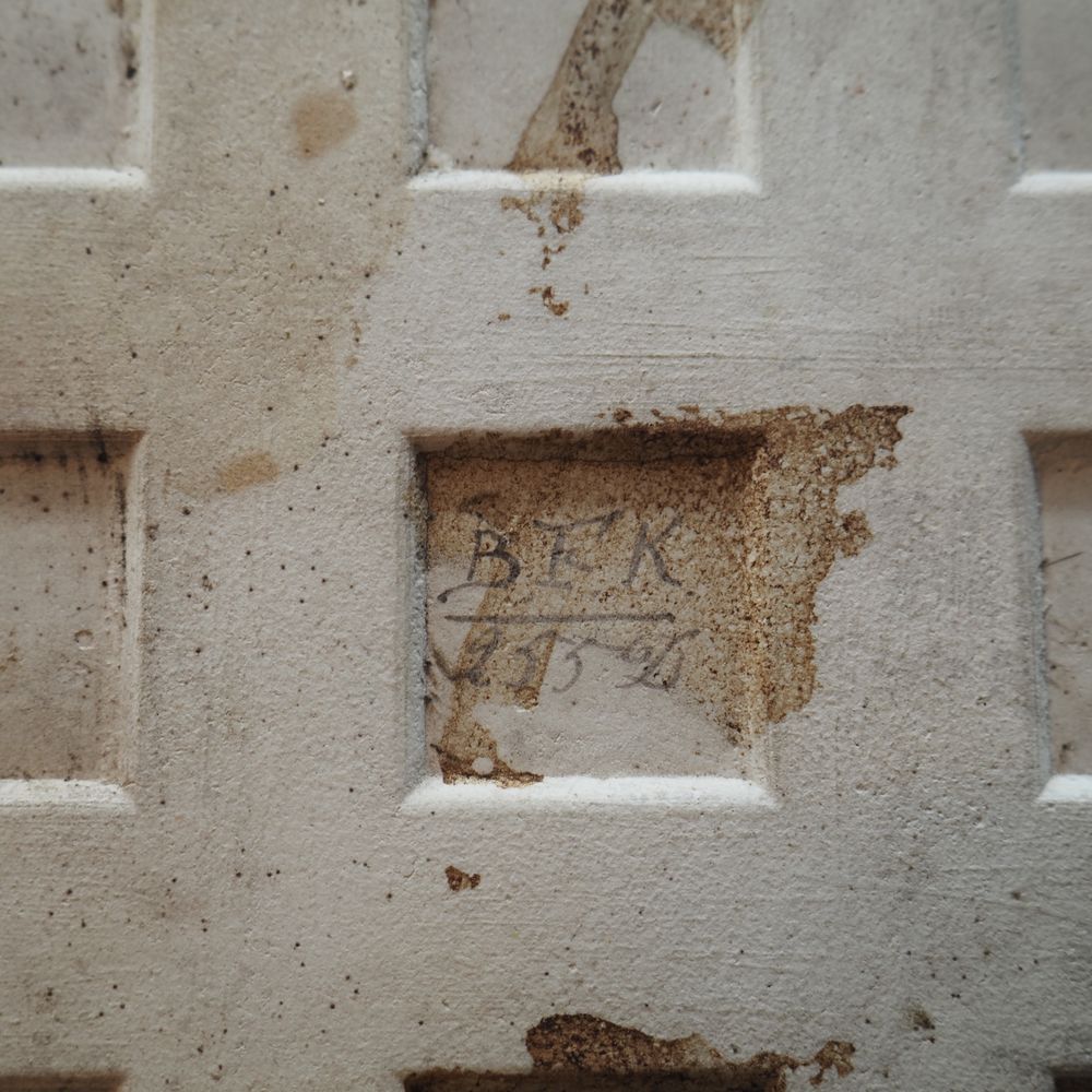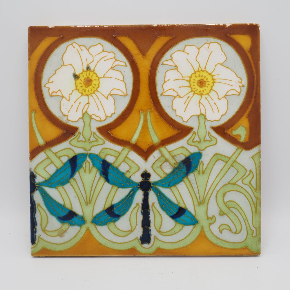 Boch Frère Karamis : Carreau Art-Nouveau, céramique émaillée, décor floral avec libellule, inscrit BFK au dos, dim: 20,7 x 20,7 cm