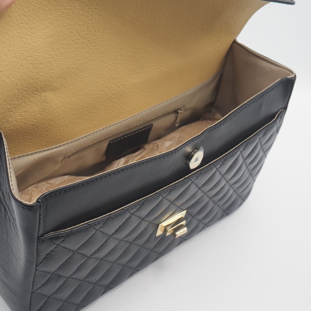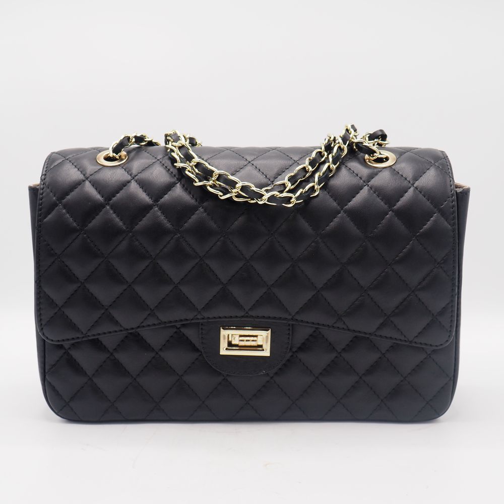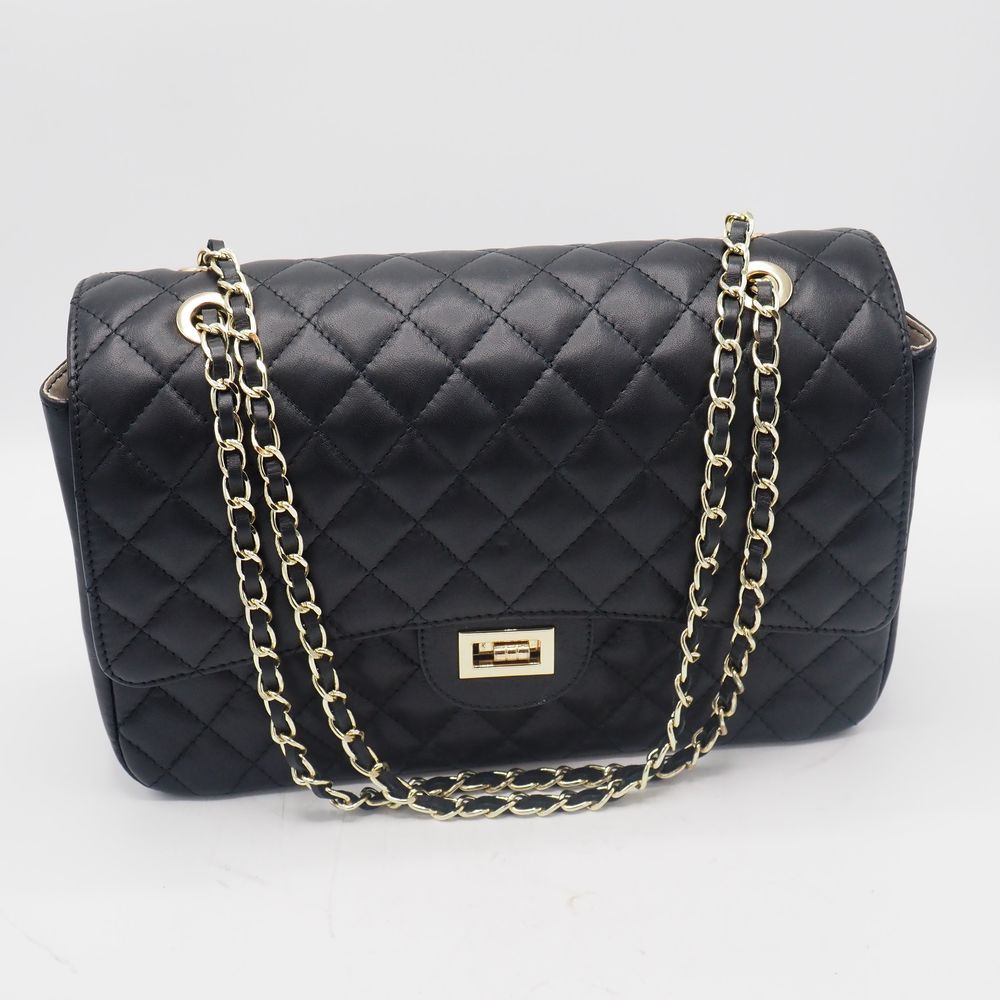 The Genuine Leather horse in pelle made in Italie : Sac de dame, cuir noir gaufré avec chaine avec lacet de cuir, 1 poche extérieur, 1 grande intérieur et pochette avec tirette, H: 22, L: 33, P: 11 cm