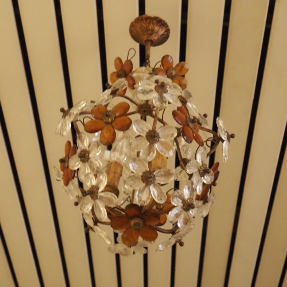 Bagues dans le gout : Suspension Art-Déco, monture en fil d’acier cintré doré, décor floral en verre taillé clair et de couleur ambre, H: 55 cm